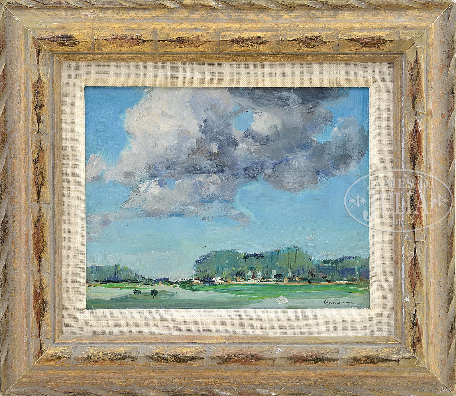 JAY CONNAWAY (American, 1893-1970) CLOUDY LANDSCAPE.Oil on Masonite Housed in a giltwood frame with linen liner Signed lower right “Connaway”, bears exhibition label from the Rockport Art Association dated October 4th to November 16th, 2014, “Paul Strisik, N.A.: The Artist and his Collection” SIZE: 8″ x 10″. Overall 13″ x 15″ CONDITION: Very good with minor touch up 51301-3 (800-1,200) – Lot 1024
