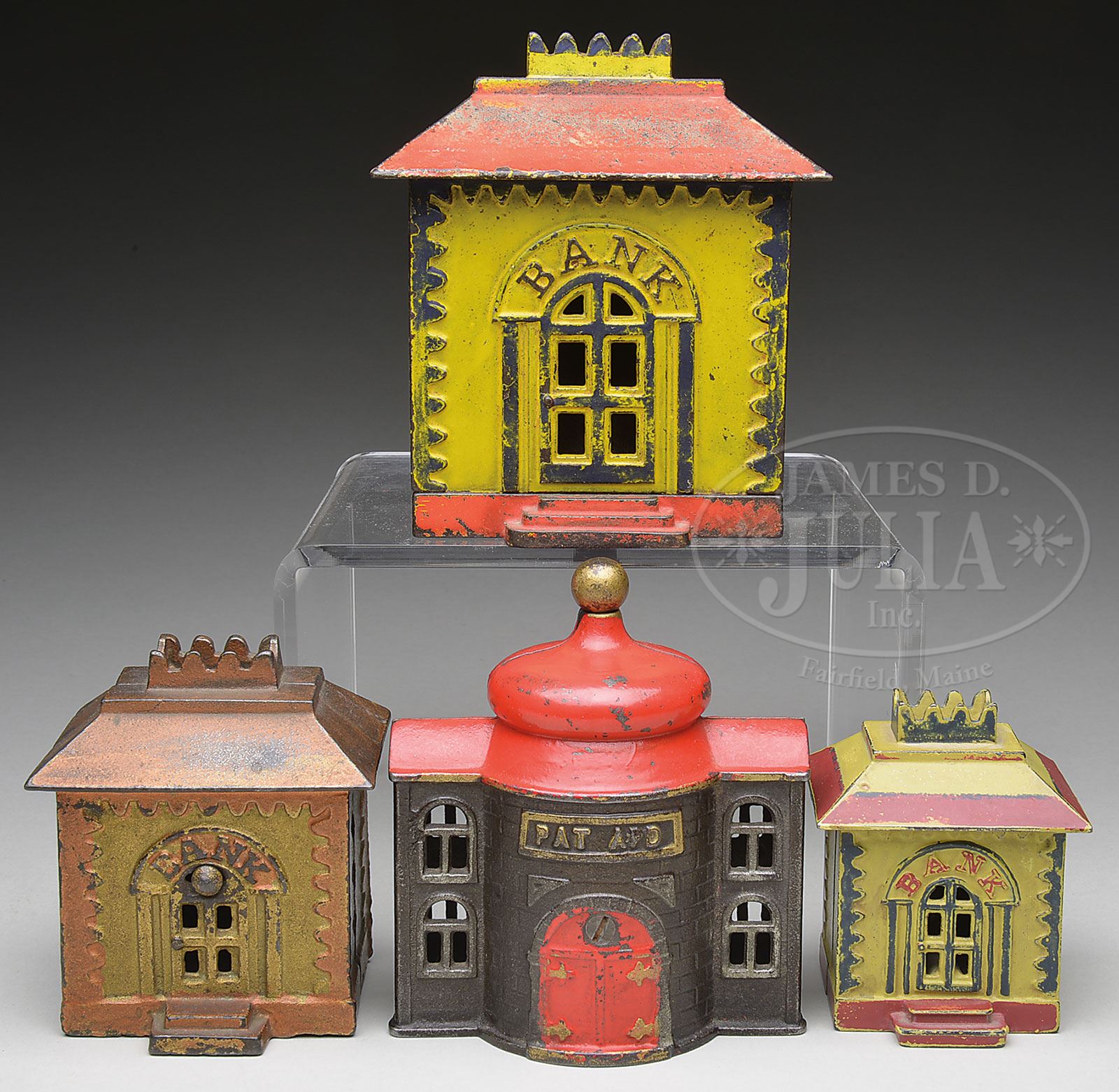THREE VARIOUS SIZED J. & E. STEVENS CROWN BANKS AND A PRESTO MECHANICAL BANK BY KYSER & REX.The largest of the crown banks approx. 4-3/4″ tall is enameled in yellow with blue highlighting and red base & roof line. The mid-sized approx 3-1/2″ tall is painted gold with copper highlighting. The smallest, approx 3″, is yellow with blue highlighting & red base and partial red roof. All three banks overall are in good to very good condition with typical wear, especially at edges. The Presto mechanical or should I say semi-mechanical has a japanned finish with red trim & gilt highlighting. Bank still retains its original keyed trap on underside, key for trap is present as well. Overall condition is very good to fine and approx 4-1/4″ tall. SIZE: As stated above. PROVENANCE: The Estate of Carol and Jerry Soling. CONDITION: As stated above, the small Crown bank appears to have been coated with a lacquer which is evident by black lighting rear of bank and one can see original yellow paint at coin slot with probable lacquering applied over entire bank. 1-14652, 1-14669-1 (600-900) – Lot 1026 Auction: Advertising, Toy & Doll Auction - Fall 2014 Please Note: All prices include the hammer price plus the buyer’s premium, which is paid by the buyer as part of the purchase price. The prices noted here after the auction are considered unofficial and do not become official until after the 46th day. |