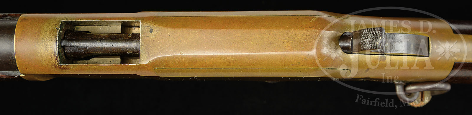 FINE EARLY WINCHESTER MODEL 1866 SADDLE RING CARBINE.SN 23170. 44 RF Henry. Outstanding ’66 carbine with 20″ rnd bbl, full magazine, integral front band/front sight and early style 2 position flip rear sight. Left side of receiver has a staple and ring. Mounted with uncheckered straight grain American walnut, including straight stock and brass crescent buttplate with trap. Top tang channel of buttstock is marked with last 4 digits of matching SN which is also found inside toe of buttplate. These early ’66 carbines are seldom encountered today and rarely in orig configuration with orig finish. The 1866 rifles & carbines have been touted as the “gun that won the west”. No doubt this model had a very large effect on the settlement of the west. It was the successor to the venerable Model 1860 Henry rifle and saw widespread distribution throughout the United States and literally around the world. They remained popular in the U.S. well into the 1870’s and 1880’s until fully supplanted by center fire arms. After that they still remained popular in South and Central America and lesser developed countries around the world where they rarely received maintenance of any kind and are rarely found today with orig finish. CONDITION: Very fine plus, all matching as noted. Bbl & magazine tube retain strong blue in sheltered areas being mostly a plummy blue/brown patina showing very little wear. Magazine & forearm bands are matching patina. Receiver, side plates and buttplate retain sharp edges and show a wonderful dark carmel patina. Hammer shows faint mottled case colors on the sides and the lever a dark brown patina. Wood is sound with light nicks & scratches and retains virtually all of its orig factory finish. Mechanics are crisp. Strong bore with good shine and light to moderate pitting. 51173-5 JRL (7,000-12,000) – Lot 1027