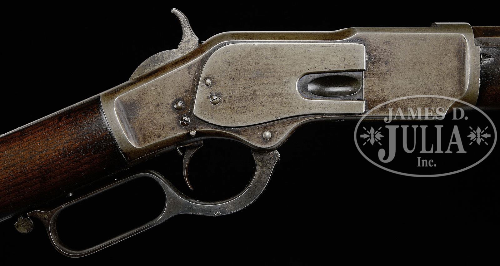 RARE WINCHESTER MODEL 1873 OPEN TOP LEVER ACTION RIFLE.SN 27807. Cal. 44 WCF (44-40). Standard grade rifle with 24-1/4″ oct bbl, full 1st type magazine with threaded flush cap, half nickel front sight & orig short, semi-buckhorn rear sight with checkered edges. Receiver is one of the rare rifles without a dust cover and has single set trigger. About the time this rifle was produced there appeared to have been a problem with burst primers & ruptured cartridge cases. If such an incident occurred with the dust cover closed the escaping gasses would bulge or rupture the side plates, disabling the rifle. For a couple of years Winchester made 1873 & 1876 rifles without dust covers so that should a cartridge rupture the gasses would escape upward and not damage the rifle. Apparently there was an improvement in cartridge design, along with complaints from customers about trash & dirt in the receivers so Winchester resumed standard practice of installing dust covers. During the years when dust covers were not standard, a dust cover could be special ordered and installed at the factory. Mounted with uncheckered, straight grain American walnut with straight stock and crescent buttplate with trap. Left side of upper and lower tang, under the wood, have assembly numbers “442” & lower tang has assembly number “661”. Buttstock, apparently a period of use replacement is without assembly number. Buttplate has a third assembly number not matching any of the previously listed numbers. The Model 1873 was Winchester’s first repeating center fire rifle and was introduced during the height of the great westward expansion of Manifest Destiny when any repeating firearm was in great demand, especially the much more reliable center fire arms. The ’73, along with its companion Colt Single Action Army revolver, were credited with winning the west. These early rifles were virtually all sold for use on the western frontier and almost universally saw very hard service. Accompanied by a Cody Firearms Museum letter which identifies this rifle with oct bbl and set trigger received in warehouse Jan. 21, 1878 and shipped Jul. 15, 1878 to order number “12405”. PROVENANCE: Tommy Rholes Estate Collection. CONDITION: Good. No orig finish remains being an overall smooth brown patina. Stock has a filled gouge on each side of the comb, a couple small bruises by the toe & a chip out of the forearm; stock also has a small crack in the toe, otherwise wood is sound and retains a light refinish on the buttstock & a dark hand worn patina on the forearm; set trigger needs adjusting, otherwise mechanics are fine; strong dark bore with sharp rifling. 4-50581 JR296 (5,000-8,000) – Lot 1028