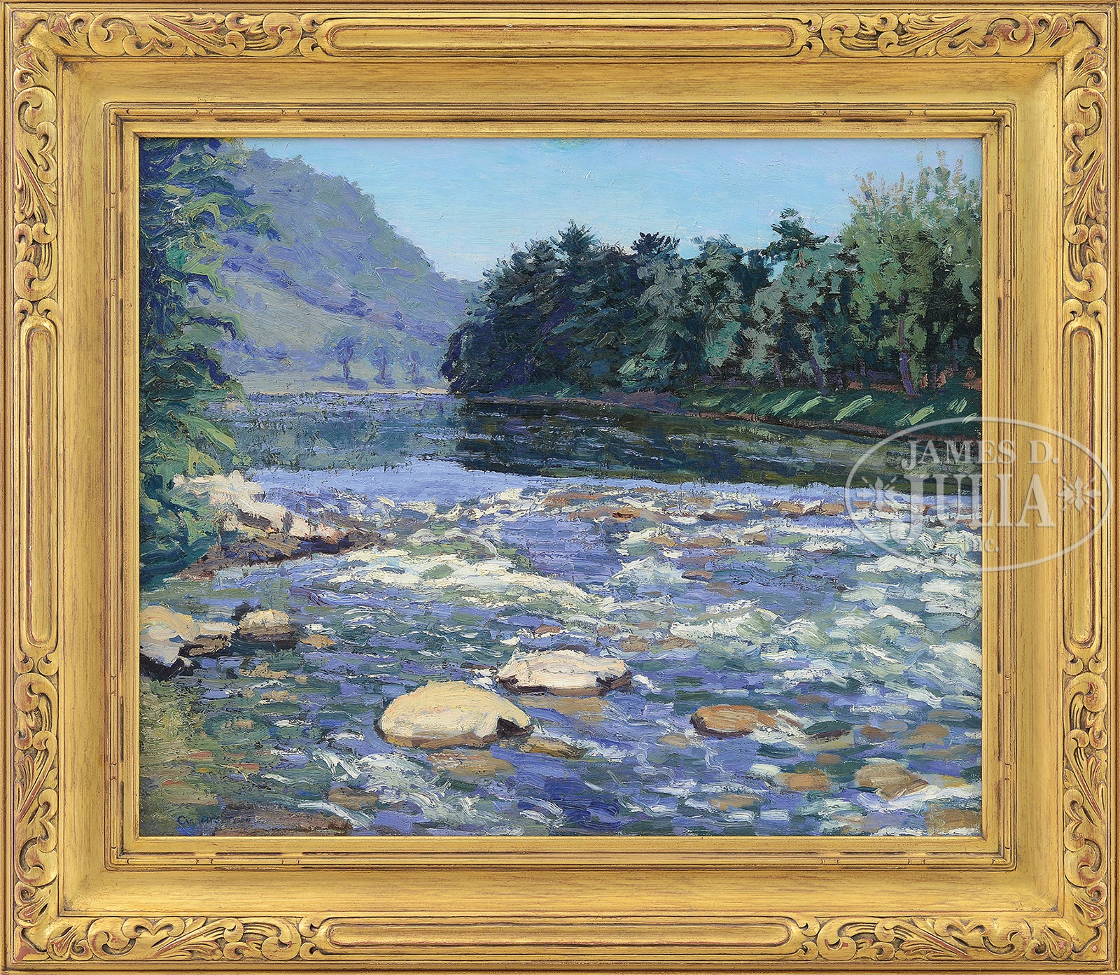CARROLL SARGENT TYSON JR (American, 1877-1956) WATER AND LANDSCAPE, PROBABLY MT. DESERT, MAINE.Oil on canvas Housed in a fine, carved gilt wood frame Signed lower left “Carroll S Tyson” SIZE: 25″ x 30″. Overall: 34-1/4″ x 39-1/4″ CONDITION: Lined, craquelure, very good. 50753-3 (5,000-7,000) – Lot 1028