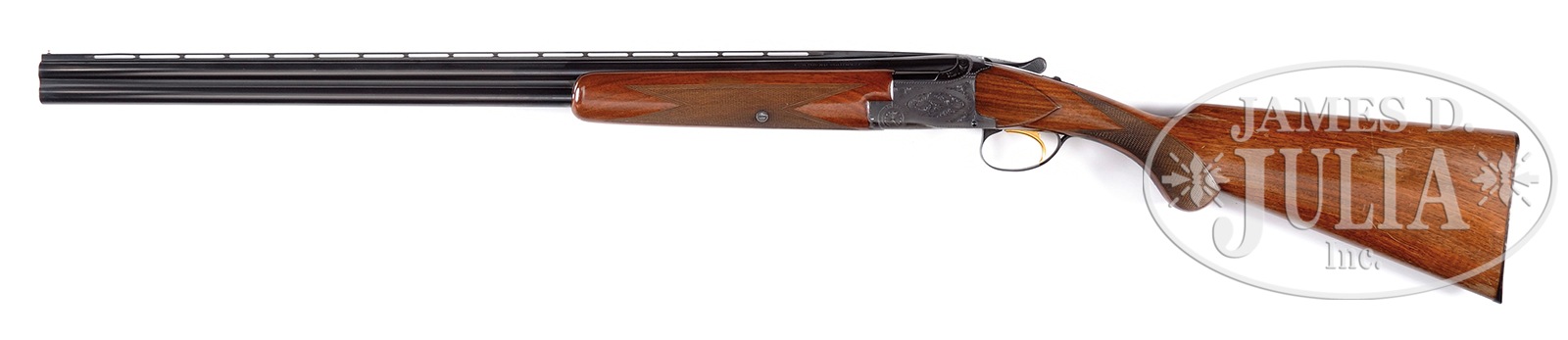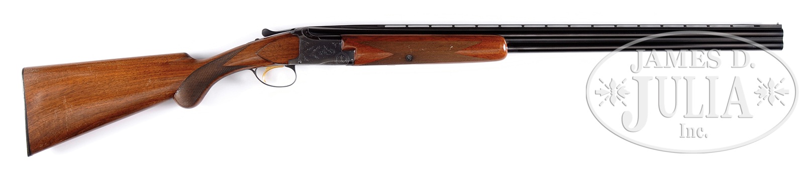 *EARLY 1950’S ERA BROWNING GRADE 1 20 GAUGE SUPERPOSED SHOTGUN.SN 18846. Cal. 20 ga. 28″ ventilated rib bbls, marked as 2-3/4″ and 3″ chambers, chokes marked IC/MOD. Single metal front bead. Auto ejectors. Grade 1 style engraved receiver. Gold washed trigger. Stock configuration RKLT. Browning marked buttplate. LOP 14-1/4″. Non-auto safety. PROVENANCE: Remarkable William Larkin Moore Private Estate Collection of Fine Sporting Arms. CONDITION: Good. Bbls have kept a majority of their orig blue with thinning at muzzle & minor handling marks. Bores appear bright. Nice receiver blue with wear on belly & around safety. Blue on edges of trigger bow & lower tang thinning. Wood is sound with orig finish but many areas of finish loss on buttstock & forend along with normal handling marks. Checkering good. Gun opens easily, locks up tight. Good mechanics. Strong ejectors. 50595-38 TJW (2,000-3,250) – Lot 1031