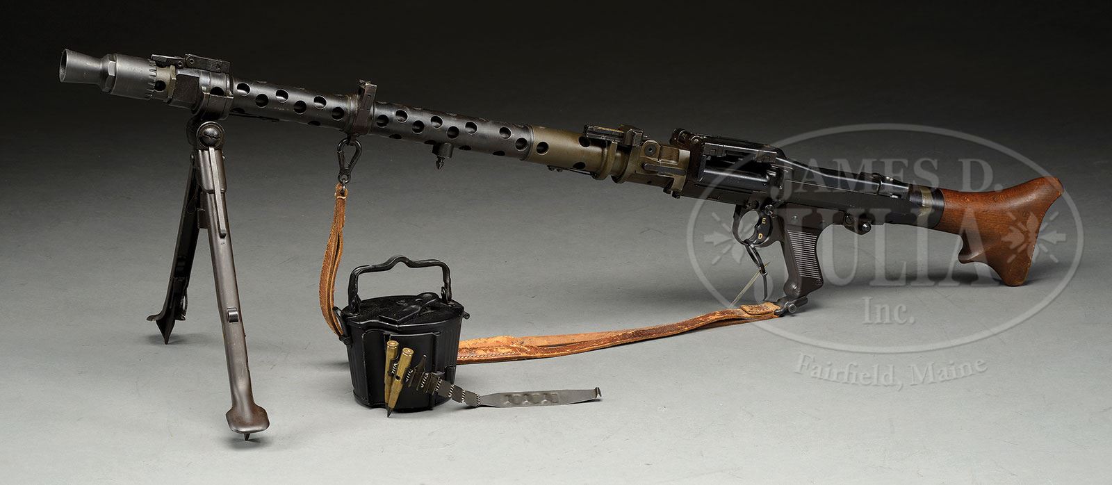 **GERMAN MG 34 MACHINE GUN MANUFACTURED BY WAFFENWERKE BRUNN (C&R).SN 4145. 8 mm. 24″ bbl. This MG 34 appears to have mostly matching numbers with exception of bolt, charging handle, feed tray and bbl. Includes bipod, orig leather sling and 50 round assault drum with a belt and display ammunition which has had cases drilled through with 1/8′ dia holes. Bolt is SN 5185 electropenciled. Feed tray is stamped 6667. Shroud is dot dated 1945. Top cover marked “cof” which indicates manufacture by Carl Eickhorn with eagle waa 883 and SN 4145. Top of receiver is eagle / “waa 63” proof marked with SN 4145a. Buffer and buttstock marked 4145a and bbl retention collar marked 4145. Bipod is marked with “42” & “KUR” Steyr, Warsaw together with eagle proof mark. Assault drum is marked “hqu44”. Mechanism functions smoothly when operated by hand. This gun appears fully functional. PROVENANCE: Ex-Dolf Goldsmith collection; The class III weapons formerly on loan to Evergreen Aviation & Space Museum. CONDITION: Overall finish and appearance is near excellent. Over 95% orig finish on metal surfaces with some slight scratches and pin prick oxidation in places. Late war gray finish on bbl shroud collar and socket assembly as well as buffer, balance having a much darker finish. Bipod which is of earlier type with adjustment screw turning to brown patina. Dark brown bakelite hand grip sound and serviceable with a couple of scratches and one crack and tiny chip at right forward mounting stud, hardly noticeable. Wooden buttstock in fine condition with some brassing to toe. Bore is shiny and bright. Bolt face also extremely fine. Sling is in good condition, starting to crack but still serviceable and pliable. Assault drum bears a coat of black enamel paint probably repainted with only slightest chipping at high points. MG 34s in this condition and with this many matching parts are extremely scarce. The fact that this is a German made original gun manufactured in 1945 makes it a very scarce example indeed. 4-51700 JWK41 (18,000-22,000) – Lot 1032