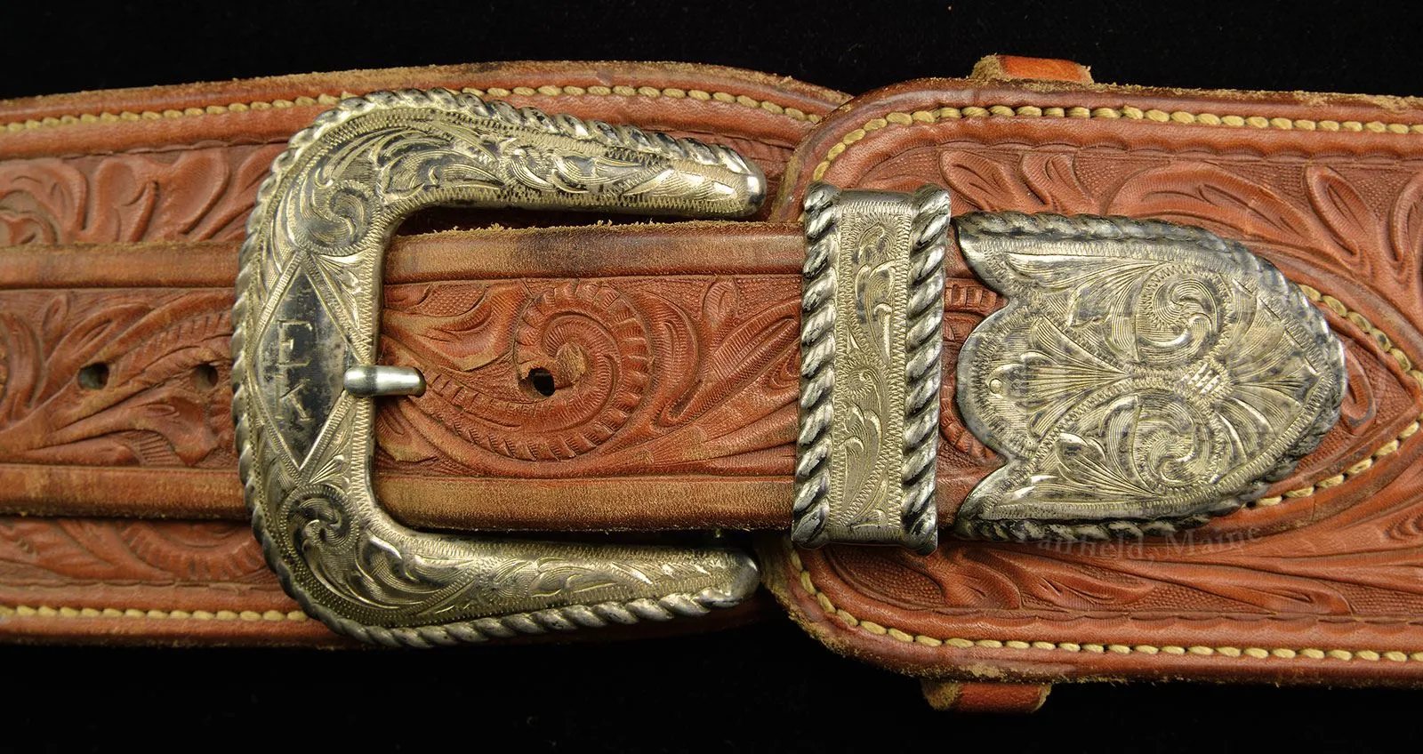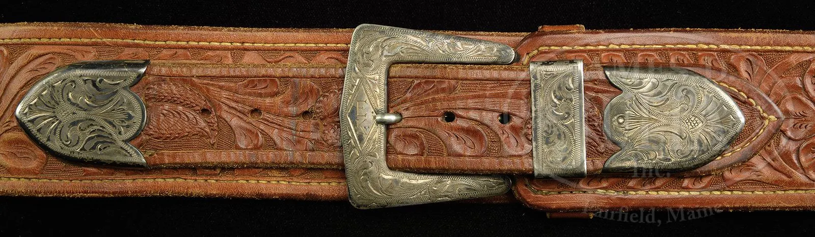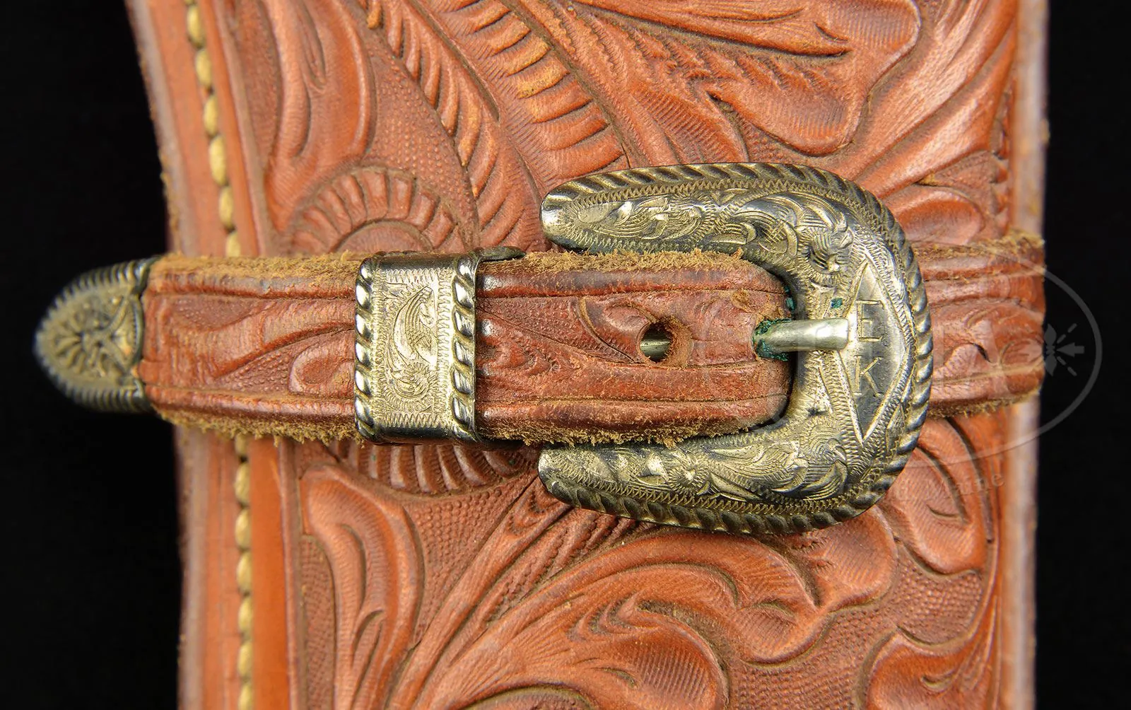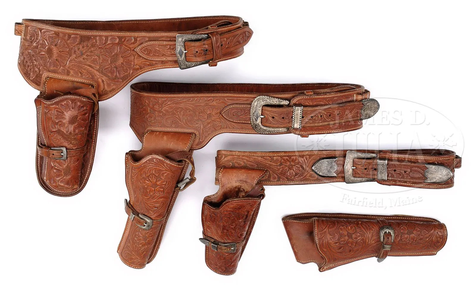 LOT OF THREE BOHLIN BELT/HOLSTER RIGS, ONE SPARE BOHLIN HOLSTER & SINGLE ACTION HOLSTER THAT ALL BELONGED TO ELMER KEITH.Three spectacular lined, tooled brown leather buscadero belt & holster rigs made by the famous Hollywood empresario Edward H. Bohlin Co. All three rigs are tooled nearly identical, with full coverage on the belts, holsters and holster skirts. All have thirty, caliber .44-45 tooled cartridge loops. 1) 3″ belt with a short drop, open toe holster, tooled to match, with a spring-loaded thumb latch and matching strap that has sterling Bohlin buckle set engraved “EK” on the buckle. The buckle billet on the belt is mounted with a matching sterling engraved Bohlin buckle set, also engraved “EK” with matching tip on the tongue. Holster is for a 7-1/2″ Colt Single Action Army revolver or possibly Ruger Super Blackhawk revolver. 2) 2-1/2″ belt that has the drop part of the belt wider than usual and supports the matching tooled brown leather holster with engraved flat sterling silver Bohlin buckle. The buckle billet is mounted with an engraved flat sterling Bohlin buckle. Holster also has the spring-loaded thumb tab and is for a 4-3/4″ Colt Single Action Army revolver or short barreled Ruger Super Blackhawk revolver. 3) 2-1/2″ belt that has a slot within the belt, not on a drop, and supports a matching tooled, brown leather holster for 4-3/4″ Colt Single Action Army or short barreled Ruger Super Blackhawk revolver. Belt has a fine engraved Bohlin flat buckle set with “EK” engraved on the buckle. Tongue billet has a Bohlin sterling silver tip & a matching tip at the attached end of the tongue. Holster has a matching miniature buckle set on the strap with “K” engraved on the buckle. 4) Extremely beautiful tooled, brown leather holster with full tooled skirt and an engraved Bohlin sterling buckle set on the strap with “EK” engraved on the buckle. Holster has the spring-loaded thumb tab. Each of the belts & holsters are marked with the cartouche of the Bohlin Co. #3 above has the small cartouche and all the others have large cartouche. These belts & holsters were all presented to Mr. Keith at one time or another over his career. PROVENANCE: The Elmer Keith Estate Collection. CONDITION: 1) Extremely fine, slightly dusty, shows very little use, completely supple & usable. 2) Extremely fine, slightly dusty, shows light use with some green verdigris by the cartridge loops from long term contact with brass cartridge cases, supple & usable. 3) Very fine, overall retains most of its original finish, showing moderate to heavy use with green verdigris in the cartridge loops from long term storage contact with brass cartridge cases, supple & usuable. 4) Extremely fine, shows very little use and retains virtually all its orig brown finish. 4-48038 JR266 (5,000-10,000) – Lot 1032 Click here to view provenance