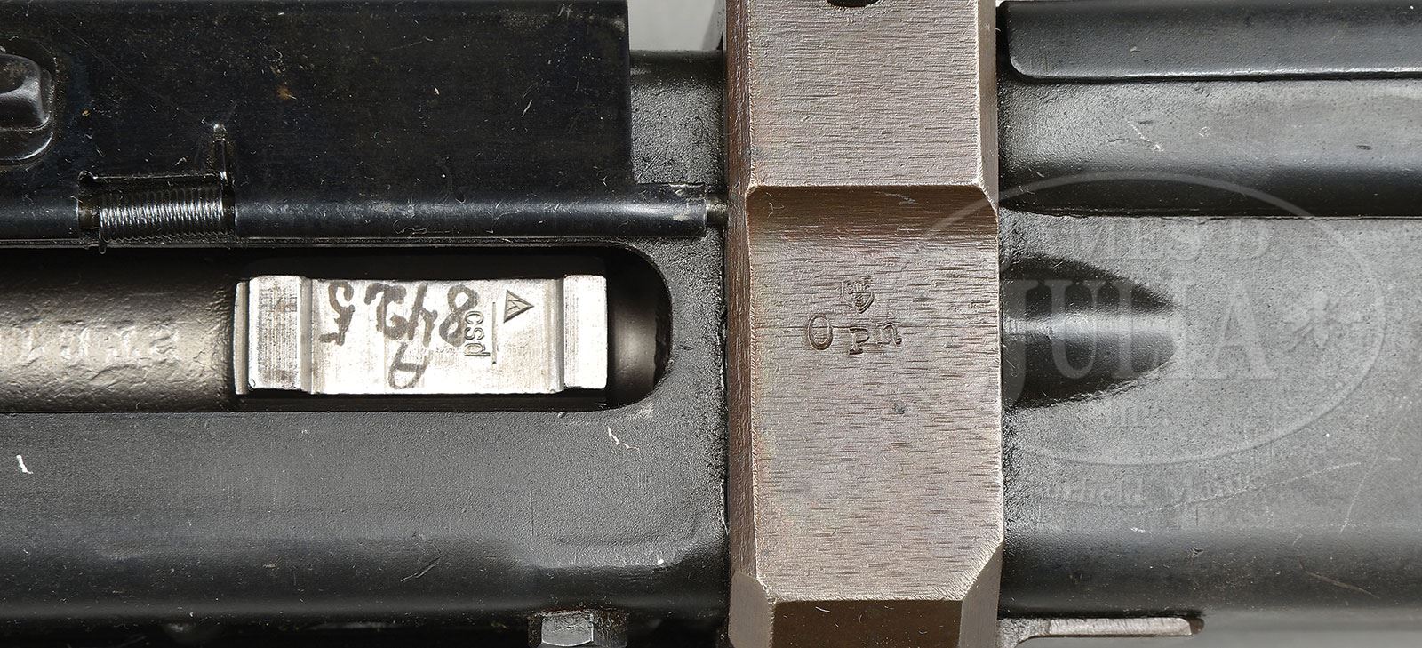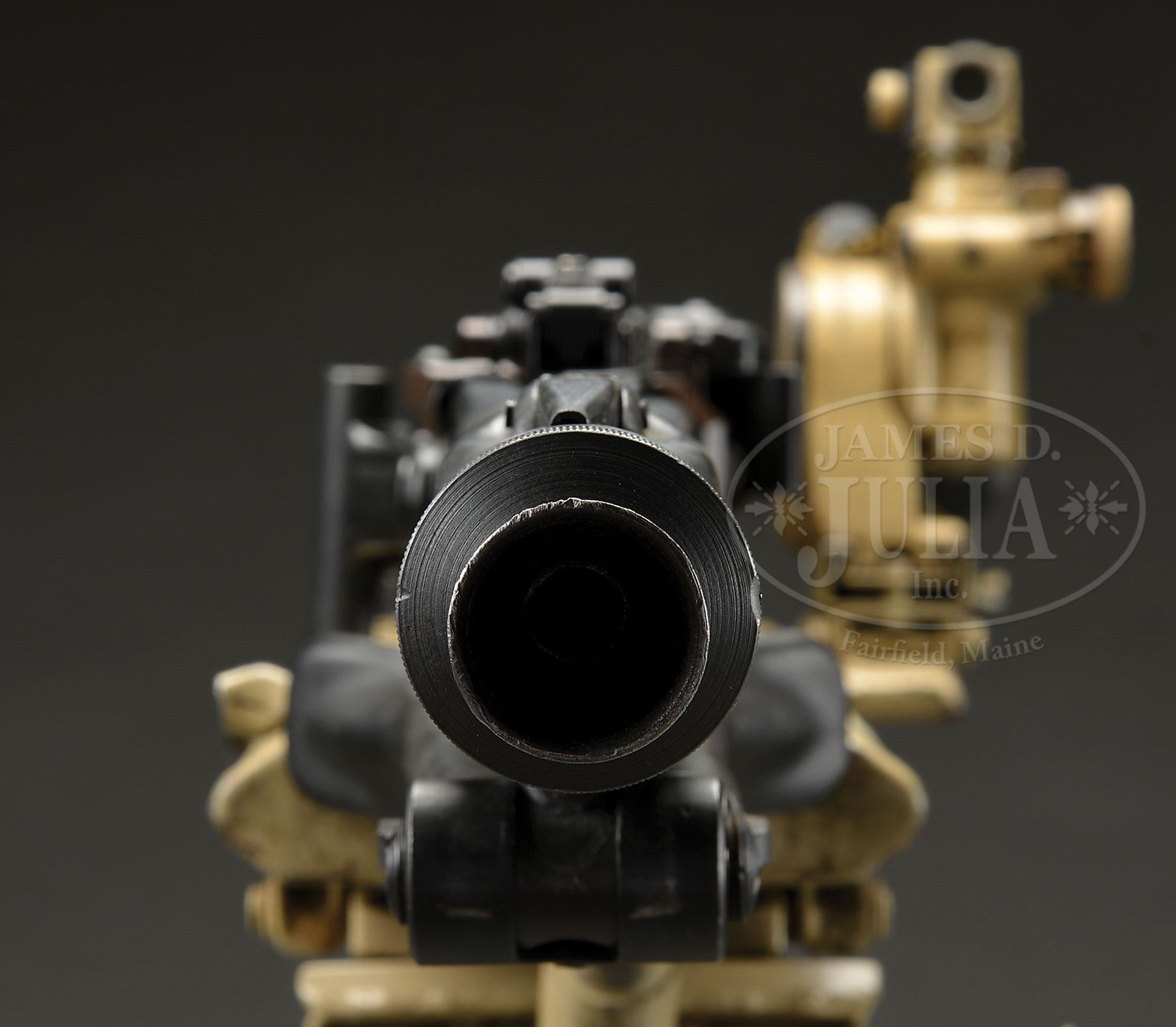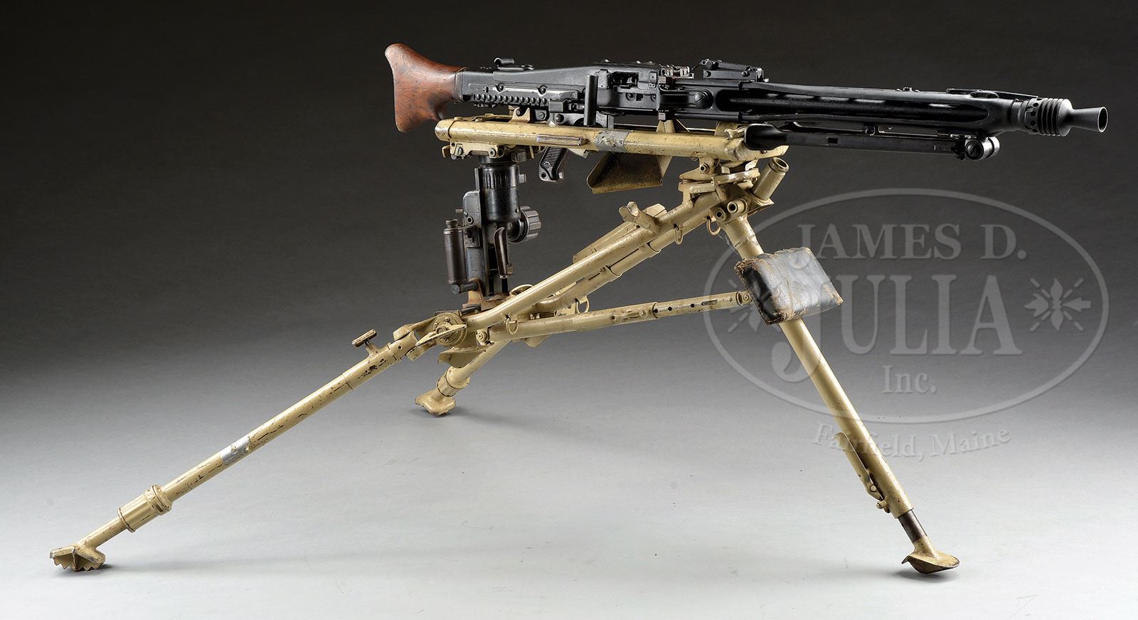 **GERMAN MG 42 MACHINE GUN ON DESERT TRIPOD WITH OPTIC (C&R).SN 3775K. 8 mm. 21″ bbl. This MG 42 was manufactured in 1944 by Maget and comes on a Nazi marked Lafette tripod in desert tan paint with spare bolt box. Also included is desert tan painted ZF40 optic in its orig desert tan box. Also included are 5 orig WWII MG 34/42 belts. Bbl in gun is marked “dfb” (Gustloff) and SN 8137c. Bolt body is marked “A8425” with maker code “csd” and also “clc” with Nazi proof mark for Herder. Bolt head appears to be post war manufacture with stock number “12-121-2203”, and bolt does include bolt locking spring. Unnumbered top cover is marked “bpr” (Grossfuss), receiver marked on left side “NC” / “Mg 42” / “3775 k” / “CRA”. Top of receiver also marked with eagle / “WaA11” proof marks indicating manufacture by Maget. Front shroud assembly also marked “bpr” and “pg”. Bipod is marked “dfb 1943” with eagle / “4” proof mark. Underside of bolt locking collar marked with “cra” within a shield proof mark and marked on side “8549E” indicating it is a replacement. This tends to support that this gun was arsenal refinished. Feed tray is also marked “bpr” as is charging handle. This specimen has flip up rear anti aircraft sight attached to rear sight. Mechanism functions smoothly when operated by hand. This gun appears fully functional. PROVENANCE: Ex-Dolf Goldsmith collection; The class III weapons formerly on loan to Evergreen Aviation & Space Museum. CONDITION: Overall finish and appearance is near excellent with over 95% dark blue refinish probably at arsenal. One can see some gouges under refinish particularly on top cover. Bolt locking collar is electropenciled “72,39” underneath refinish. Hand grip does not appear to be refinished and retains about 30% of its blued finish, the rest a gray patina. Eagle / “WaA518” is present. Orig wooden buttstock is sound and serviceable with some chips and handling marks. Bore has shiny rifling with some darkness in grooves. Muzzle has green verdigris in vent holes and some evidence of carbon buildup. Bolt face is fine with a small ring around firing pin hole. Tripod retains about 80% of its very light sand color paint. Tripod elevation gear assembly is marked “dar” with SN 1294 and has a blue finish. Oil brush cap not present. Optic exterior paint matches tripod perfectly and is marked “gug” and rubber eye cup is present, complete and just starting to get stiff; optic is clear. Optic box has a somewhat darker mustard tan paint that is 90% and is stenciled “M.G.Z.40” & marked “LUX” and does not include any additional accessories. Pads and straps are present and serviceable. This is a fine example of a WWII MG 42 complete on a the very stable ground tripod whose desert color paint indicates its use in North Africa. 4-51688 JWK43 (30,000-40,000) – Lot 1033