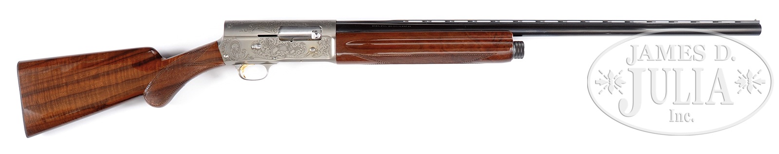 *BROWNING AUTO-5 CLASSIC LIMITED EDITION SEMI-AUTO SHOTGUN.SN 211BC1028. Cal. 12 ga. 28″ bbl, vent rib, 2-3/4″ chamber, MOD choke. Code NO. C10183. Made in Japan, engraved in Belgium. One of 5,000 produced. Satin finish receiver handsomely embellished on left side with dog hunting scene and flying mallard. Right side with a bust of John Browning and mallards. Scenes surrounded by foliate scroll. Left side of receiver marked “Jean H. Diet”. Gun is mounted with select fancy figured walnut with bold grain and fiddle back. Round knob pistol grip. Beautifully checkered with small circular border lines. Orig box identified by SN on end label & shipping box. CONDITION: Exceptionally fine. This gun is “as new” in box. Box is in fine condition. 50827-6 TJW (2,250-4,250) – Lot 1034 Click here to view provenance
