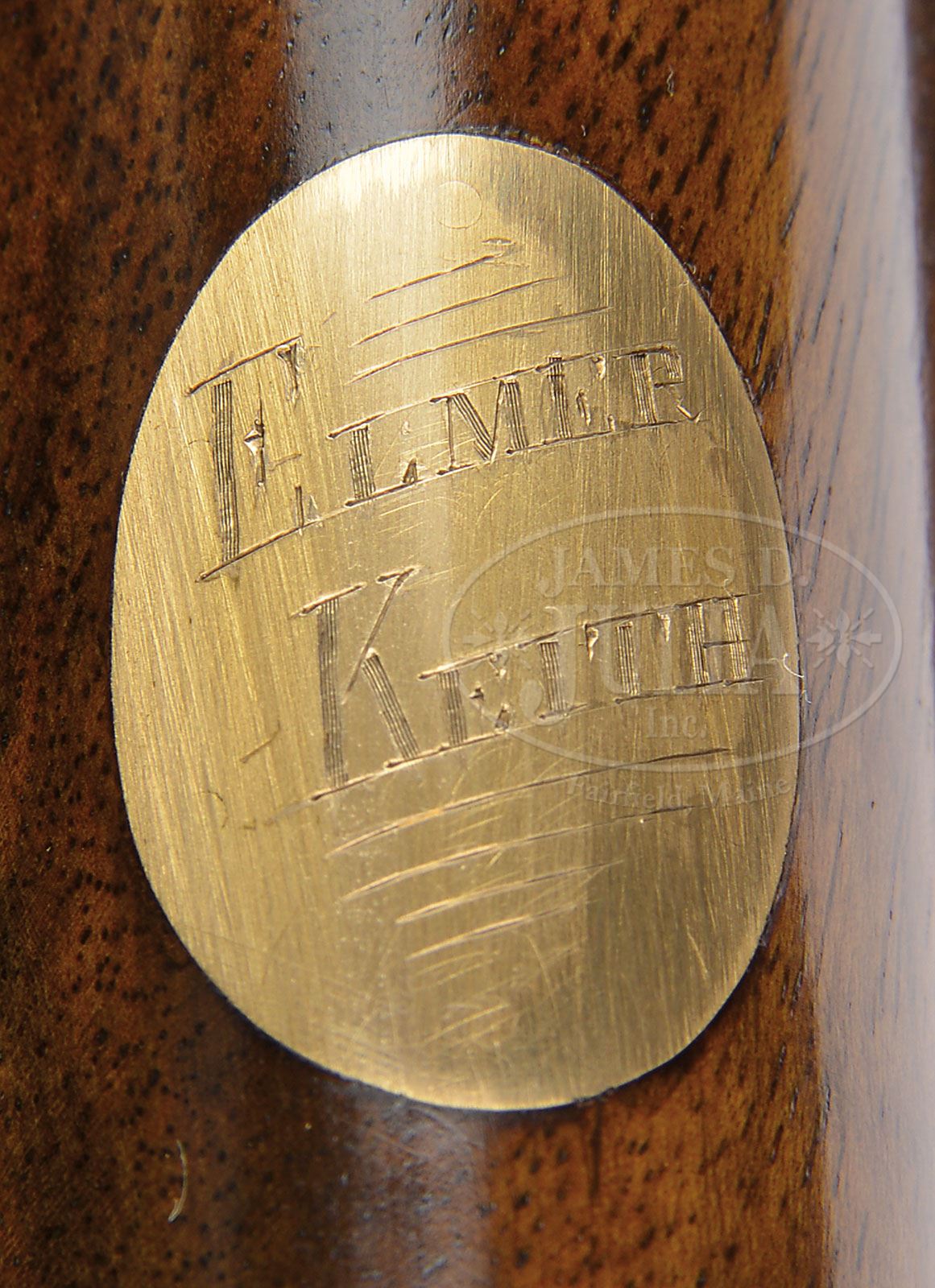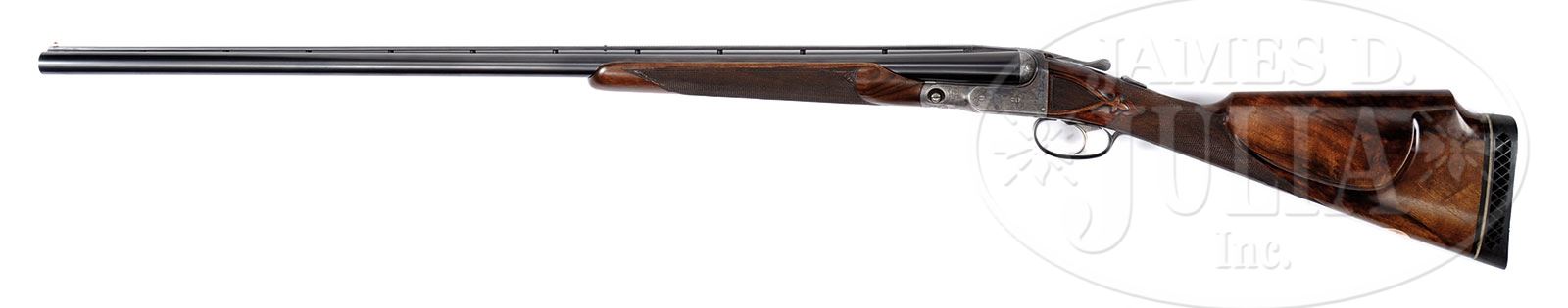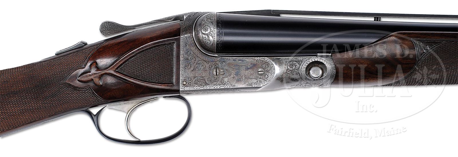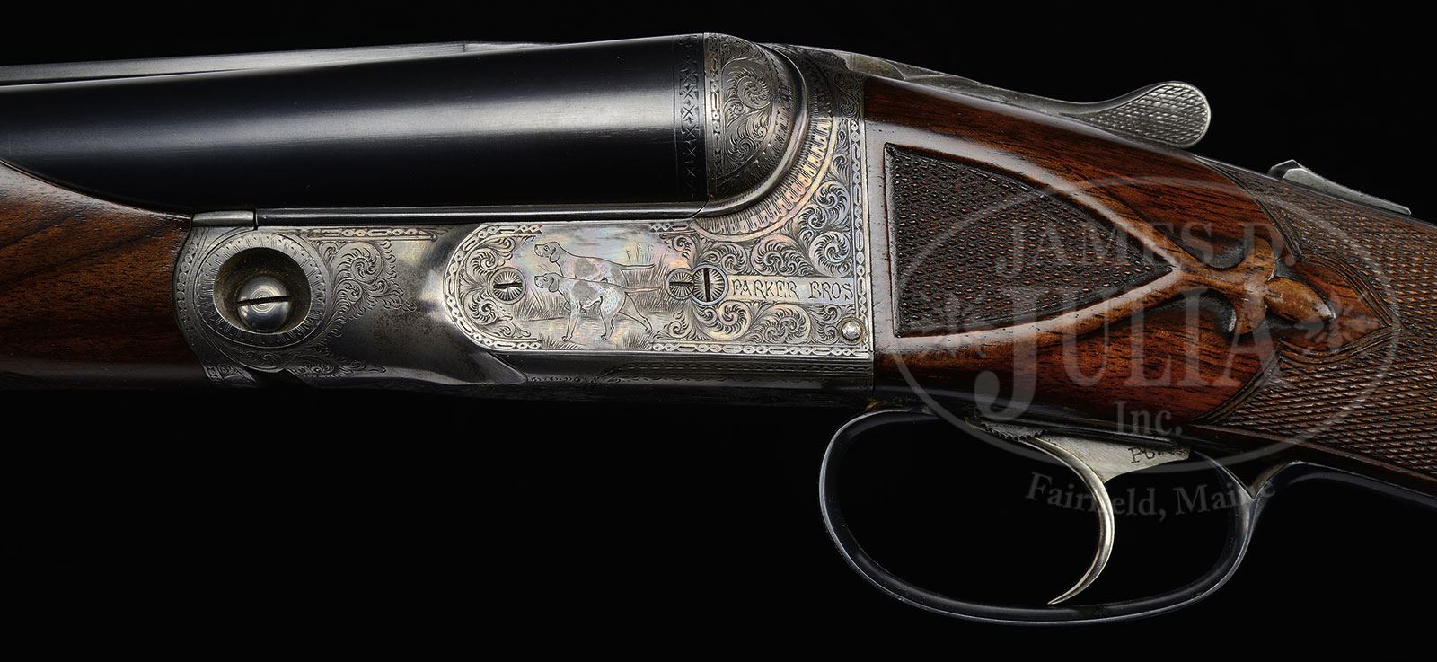 Please Note: Certifiable antique ivory bead sight. Special Note: This item contains or is made of ivory. Do not bid on this lot unless you have read and agreed to our “Ivory Position Statement” and the “Waiver of Legal and Financial Risk to James D. Julia in regards to your Purchase of an Ivory Object“. This information is located in our catalog on pages 30 and 31. *FABULOUS PARKER BHE SINGLE TRIGGER VENTILATED RIB BEAVERTAIL FOREND TRAP GUN OF ELMER KEITH.SN 228351. Cal. 12 ga. 1-1/2 Frame. 2-3/4″ Chambers. 32″ Bbls are marked with Parker Bros Meriden, CT address and “ACME STEEL” on raised, ventilated rib with two white beads. Bbl flats and lump have all correct markings. Splinter/ loop is of one piece reinforced type. Case hardened action features non-automatic safety (SAFE engraved), and single selective Parker trigger. Action is nicely filed with chevron on top lever and single bead around fences. It is engraved in typical “B” style with 80% coverage various sized scroll surrounding vignettes of double dogs on each side, with “PARKER BROS” at rear; a pair of pointers on left, and setters on right. A pair of geese fly over marsh on trigger plate. Trigger guard with scroll on bow, has SN at grip. Unusual, nicely marbled European walnut straight grip buttstock measures 14-5/16″ over black open-sided “White Line” pad, and features high Monte Carlo comb, right hand cheekpiece, and a gold oval on toe line engraved “Elmer Keith”. Stock also features typical “B” style checkered side panels with fleur-di-lis drop points and fancy border checkering. Matching long beavertail forend with reinforcing bolt, has 1901 patent date on iron, and typical latch. This gun matches all specifications in the PARKER IDENTIFICATION & SERIALIZATION ledger. Accompanied by a Brauer Bros leather Leg-o-Mutton style case w/ “Ted Keith” address label affixed. Bore diameter: left -.730, right -.729. Bore restrictions: left -.027 (IMod), right -.037 (full). Minimum wall thickness: left -.029, right -.033. Drop at heel: 2-7/16″, drop at rear of Monte Carlo: 1-1/2″, drop at comb: 1-9/16″. Weight: 8 lbs 2 oz. LOP: 14-5/16″. PROVENANCE: The Elmer Keith Estate Collection. CONDITION: Excellent, as partly refinished. Bbls retain nearly all of a professional quality re-black. Action retains 50 – 60% orig case hardening color, vivid where protected, balance a fine pewter gray. Trigger guard has been refinished and retains essentially all of that blue. Stocks retain nearly all of what appears to be their orig finish, with a few light marks and scratches. Bores are excellent. Action is tight. Ejectors are in time. Trigger works. 4-47964 MGM164 (10,000-20,000) – Lot 1035