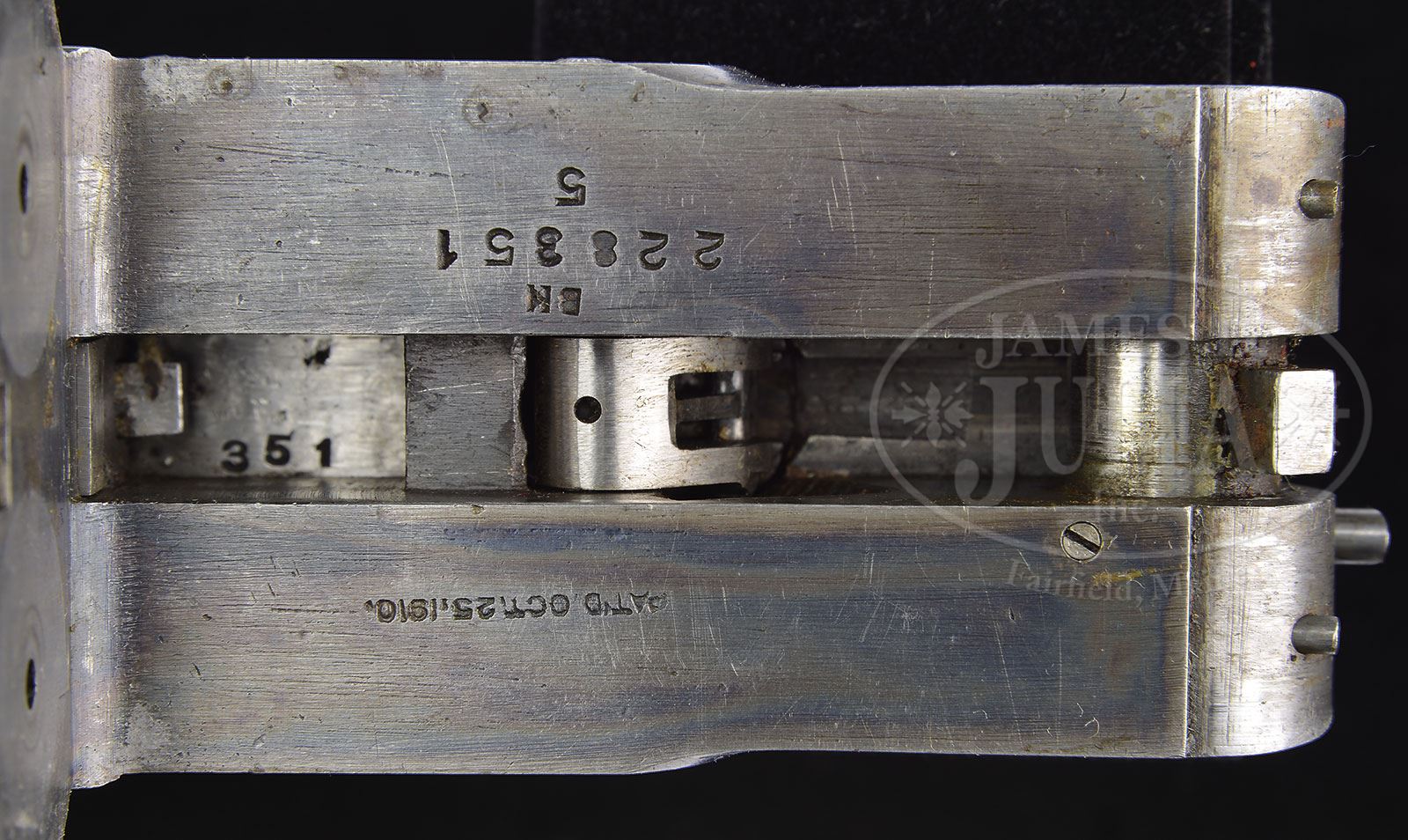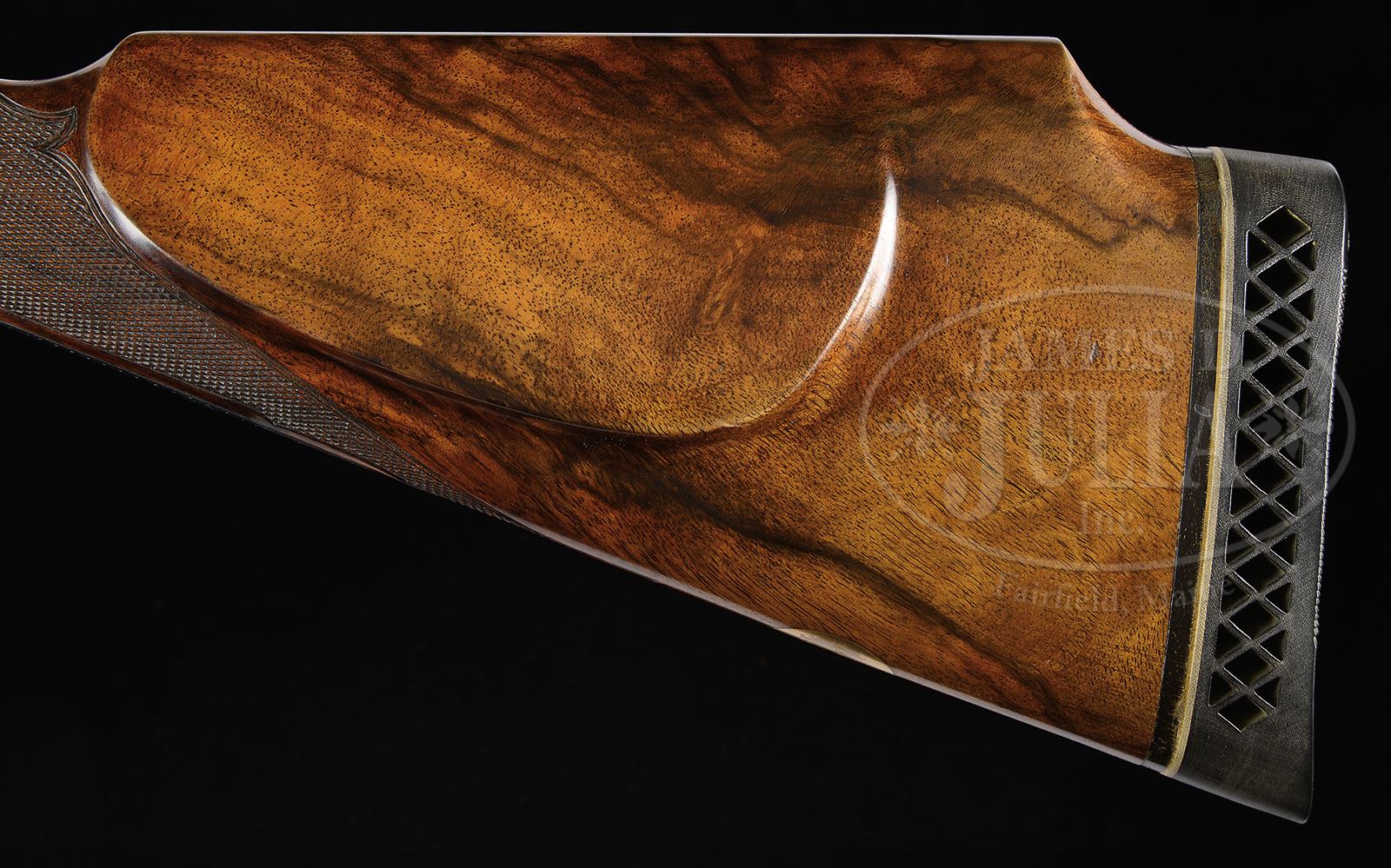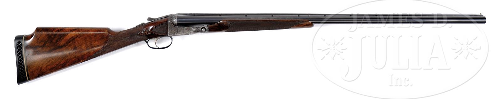 Please Note: Certifiable antique ivory bead sight. Special Note: This item contains or is made of ivory. Do not bid on this lot unless you have read and agreed to our “Ivory Position Statement” and the “Waiver of Legal and Financial Risk to James D. Julia in regards to your Purchase of an Ivory Object“. This information is located in our catalog on pages 30 and 31. *FABULOUS PARKER BHE SINGLE TRIGGER VENTILATED RIB BEAVERTAIL FOREND TRAP GUN OF ELMER KEITH.SN 228351. Cal. 12 ga. 1-1/2 Frame. 2-3/4″ Chambers. 32″ Bbls are marked with Parker Bros Meriden, CT address and “ACME STEEL” on raised, ventilated rib with two white beads. Bbl flats and lump have all correct markings. Splinter/ loop is of one piece reinforced type. Case hardened action features non-automatic safety (SAFE engraved), and single selective Parker trigger. Action is nicely filed with chevron on top lever and single bead around fences. It is engraved in typical “B” style with 80% coverage various sized scroll surrounding vignettes of double dogs on each side, with “PARKER BROS” at rear; a pair of pointers on left, and setters on right. A pair of geese fly over marsh on trigger plate. Trigger guard with scroll on bow, has SN at grip. Unusual, nicely marbled European walnut straight grip buttstock measures 14-5/16″ over black open-sided “White Line” pad, and features high Monte Carlo comb, right hand cheekpiece, and a gold oval on toe line engraved “Elmer Keith”. Stock also features typical “B” style checkered side panels with fleur-di-lis drop points and fancy border checkering. Matching long beavertail forend with reinforcing bolt, has 1901 patent date on iron, and typical latch. This gun matches all specifications in the PARKER IDENTIFICATION & SERIALIZATION ledger. Accompanied by a Brauer Bros leather Leg-o-Mutton style case w/ “Ted Keith” address label affixed. Bore diameter: left -.730, right -.729. Bore restrictions: left -.027 (IMod), right -.037 (full). Minimum wall thickness: left -.029, right -.033. Drop at heel: 2-7/16″, drop at rear of Monte Carlo: 1-1/2″, drop at comb: 1-9/16″. Weight: 8 lbs 2 oz. LOP: 14-5/16″. PROVENANCE: The Elmer Keith Estate Collection. CONDITION: Excellent, as partly refinished. Bbls retain nearly all of a professional quality re-black. Action retains 50 – 60% orig case hardening color, vivid where protected, balance a fine pewter gray. Trigger guard has been refinished and retains essentially all of that blue. Stocks retain nearly all of what appears to be their orig finish, with a few light marks and scratches. Bores are excellent. Action is tight. Ejectors are in time. Trigger works. 4-47964 MGM164 (10,000-20,000) – Lot 1035
