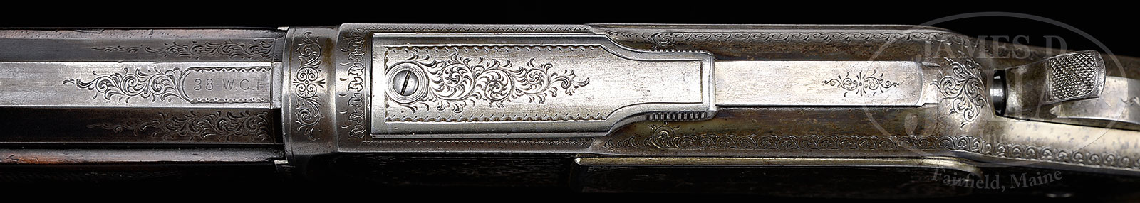 RARE JOHN ULRICH ENGRAVED WINCHESTER MODEL 1873 DELUXE LEVER ACTION “LIKE 1 OF 1000” RIFLE.SN 335484B. Cal. 38 WCF (38-40). SN 335484. Beautiful special order rifle with 26″ oct to rnd bbl, gold washed Beech’s front sight, semi-buckhorn rear sight & Lyman tang sight with loop. Mounted with extremely beautiful 3-4X American walnut with “H” style checkered forearm & straight stock with checkered steel buttplate. Left side of lower tang under the wood is marked with assembly number “25”, which number is also found in top tang channel of buttstock & inside toe of buttplate. Forend cap & buttstock have factory sling swivels. Receiver is spectacularly engraved by John Ulrich & signed on bottom tang. Left sideplate has a large vignette of a whitetail buck & doe in a very detailed woodland scene surrounded by extremely well executed foliate arabesque patterns and wavelet border patterns. Balance of receiver has light arabesque patterns with matching border patterns and a section of heavy border pattern at top left. Right sideplate has rare vignette of a cougar in a woodland scene, surrounded by matching borders with balance of right side is a mirror image of left. There are light arabesque patterns on both sides of lever & hammer with matching patterns on dust cover & top three flats of bbl at receiver. Muzzle also has a ring of engraving & buttplate tang is engraved to match. Carrier & forend cap & bottom of lever have matching engraving & serial number is encased in a ribbon. This exact rifle has two large photographs with description on p. 158 of Winchester Engraving, Wilson. Accompanied by a Cody Firearms Museum letter fully identifying this rifle with $15.00 engraving and originally shipped with a blank in rear seat but accompanied by a buckhorn sight. SIZE: Ex-Dr. James M. Goforth Collection; Floyd Everhart. Special Note: This item(s) contains plant or animal properties that may be covered by the Endangered Species Act (ESA). We have taken care to ensure that this item(s) meets the standard for sale under the ESA. However, certain states and other countries have laws that are more restrictive than the ESA. It is the bidder’s responsibility to ensure that it is lawful to purchase or transport this item(s) into their state, and to obtain the necessary import and export approvals. Delay or failure to obtain any such permit or approval does not relieve the buyer of paying for the item(s) and consummating the purchase. CONDITION: Bbl retains 85-90% thin orig blue with wear at muzzle and over chamber areas. Receiver retains traces of case colors in very sheltered areas, having turned silver over most areas. Hammer retains 75-80% bright case colors & lever is a silver patina. Wood is sound showing moderate to heavy wear with light handling & use marks with forearm retaining about 50% orig varnish & buttstock about all of a fine restored finish. Mechanics are fine, bright shiny bore with scattered spots of light pitting. 50832-1 (60,000-80,000) ESA – Lot 1035 | Click here to view provenance
