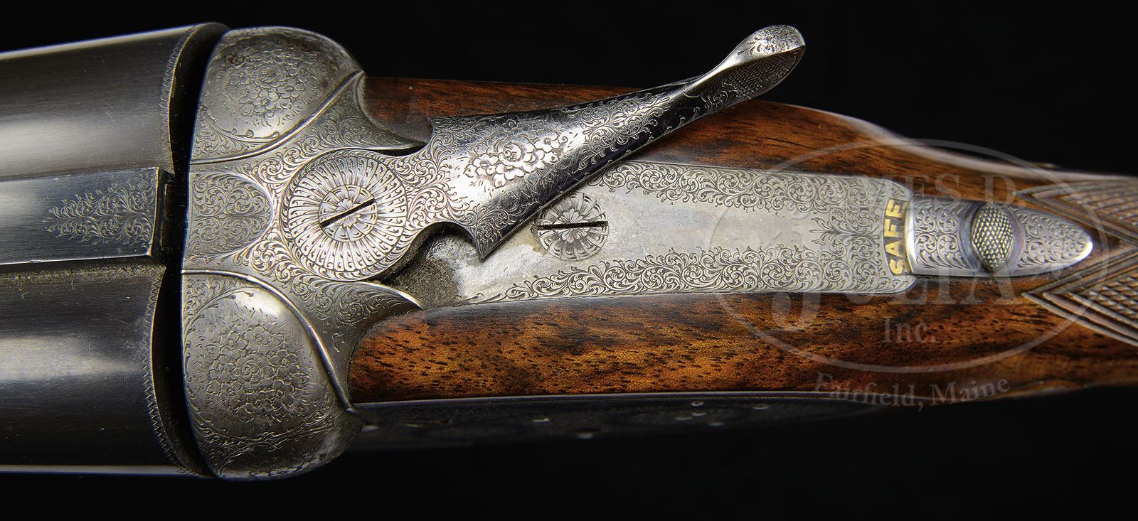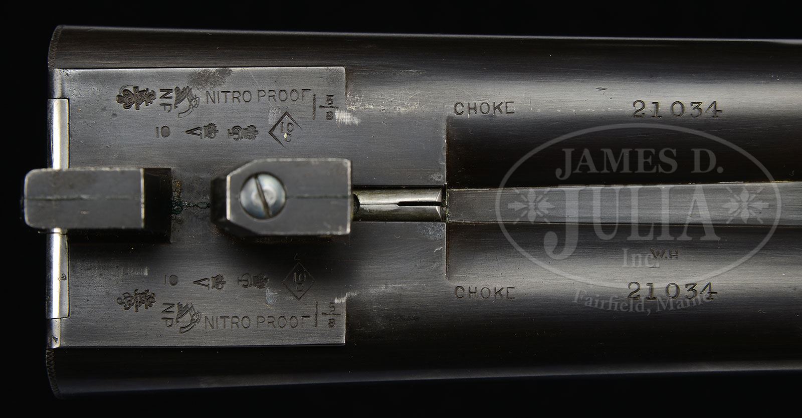 Please Note: Pre-ban ivory bead sight. Special Note: This item contains or is made of ivory. Do not bid on this lot unless you have read and agreed to our “Ivory Position Statement” and the “Waiver of Legal and Financial Risk to James D. Julia in regards to your Purchase of an Ivory Object“. This information is located in our catalog on pages 30 and 31. *TEN BORE PURDEY SIDELOCK EJECTOR GAME GUN WITH CASE.SN 21034. (ca 1914) Cal. 10 bore. 2-7/8″ Chambers. 30″ Chopper lump bbls with raised game rib, mounted with two white beads, are engraved “J. Purdey & Sons. Audley House. South Audley Street. London.” and “Made of Sir Joseph Whitworth’s Fluid-Pressed Steel” on rib. Bbl flats are stamped with London nitro proofs for 1-5/8 oz of shot. Bottoms of bbls are stamped “CHOKE” with SNs and bbl makers initials “WH” (Bill Hill). Tube nos. 45373 and 45374 are on loop. Large case hardened Beesley patent self-opening sidelock action features automatic safety (SAFE inlaid in gold), Purdey’s patented third fastener, bushed strikers, raised rib tumbler end cocking indicators, and double triggers (front articulated). Action is engraved with exceptionally well cut small shaded scroll with rose bouquet highlights in typical Purdey house style. “J. Purdey & Sons” is at the bottom of each lockplate, and also on bottom of action over “London”. Top lever and trigger guard are blued. SN is at grip. Well marbled and nicely figured circassian walnut round knob long pistol grip buttstock measures 14″ over solid basket-weave white line red pad. Stock features drop points, and typical point pattern checkering with mullered borders at grip. Matching splinter ejector forend has Anson release. Iron is engraved with actioner’s initials “J.T” (Joe Thompson). Bore diameter: left -.778, right -.777. Bore restrictions: left -.049 (extra full), right -.037 (full). Minimum wall thickness: left -.033, right -.036. Drop at heel: 2-7/16″, drop at comb: 1-5/8″. Weight: 8 lbs 5 oz. LOP: 14″. Orig makers oak and leather case with brass corners is lined in scarlet cloth and has small paper Purdey label in lid, along with charge card for this particular gun. Case contains 2-pc mahogany and brass cleaning rod with short handle, with brush, jag, and lead remover, bone striker bottle containing striker springs, round oil bottle, small turnscrew, pull through cleaning kit in black morocco wallet, and a pair of C&E aluminum snap caps. PROVENANCE: The Elmer Keith Estate Collection. Ross Seyfried states: “Elmer referred to this as a Purdey Super 10 Bore (being one with 2-7/8″ chambers). He said in his books and writings that this gun was originally made for Daniel Beard, the first Head of the Boy Scouts of America. (Daniel Beard founded the Sons of Daniel Boone in 1905, which merged with the Boys Scouts in 1910.)” CONDITION: Fine, as partially refinished. Bbls retain approx 80% of an old re-black, with thinning around forend from normal hand wear. Action and lockplates retain a considerable amount, perhaps 30%, orig case hardening color, faded overall. Top lever retains a considerable amount of its orig bright blue. Trigger guard and forend metal have been re-blued, retaining nearly all that blue, and are quite shiny. Stocks retain 90% of an old oil refinish, or possibly old well done replacements, checkering re-cut and relatively sharp. Bores are excellent, bright and shiny throughout. Action is tight. Bbls are on face. Drop is good. Ejectors are in time. Case leather is stained and darkened, with a number of rubs and areas of lifting of grain. Central brass medallion and handle are missing. Newer straps are very fine. Interior cloth is fine with marks and rubs from contact with gun and bbls. Labels are foxed, with some stains. Accessories are fine. There is a heavy ding in the small cover of oil bottle. An unusual big bore Purdey. 4-47966 MGM147 (15,000-25,000) – Lot 1036