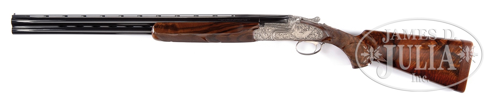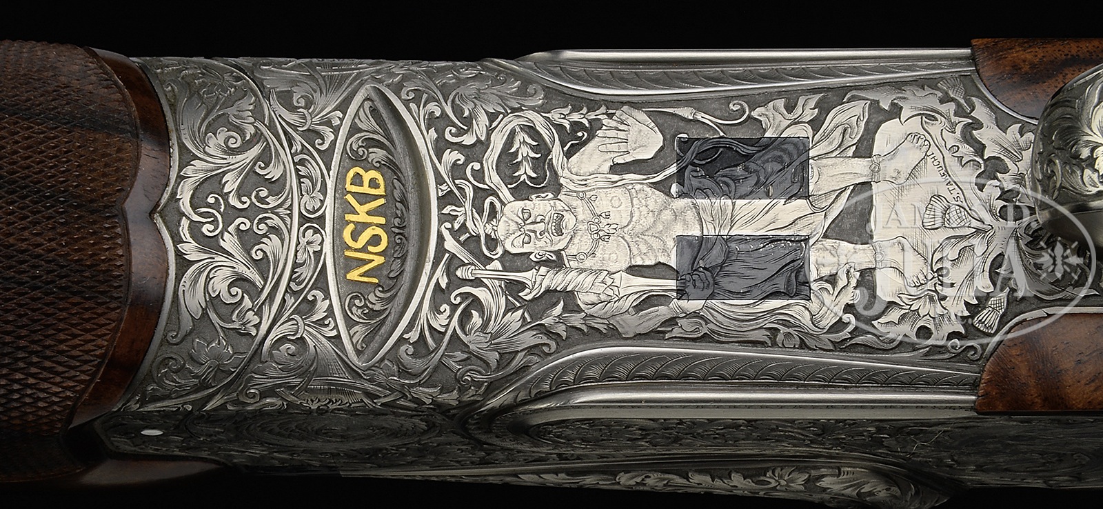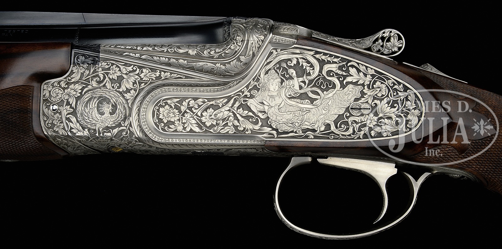 *NEW SKB ARMS GRAND SPECIAL CASED OVER/UNDER SHOTGUN.SN NS10729. Cal. 12 ga. 26″ bbl vent rib with ventilated side ribs. Right side marked in gold “SKB Grand Special”. 2-3/4″ chambers fitted for interchangeable choke tubes with IC & MOD tubes installed in gun. Sideplated boxlock action with detachable trigger assemblies. Trigger assemblies “A” and “B” have hand checkered 1/4″ wide triggers with similar pull weights. Pierced top lever, trigger guard and action have exquisite full coverage deep relief engraving with foliate scroll surrounding warrior goddess scenes on sideplates and warrior on floorplate. Engraving is signed by “S. Takeuchi”. Indentation in forward part of receiver has gold inlaid “NSKB”. Forearm and pistol grip stock of exhibition quality walnut. Features include contrasting wood grip cap, nameplate and toeline and borderless wraparound segmented fleur de lis hand checkering. LOP: 14-5/8″ over leather covered pad. Drop at comb: 1-5/8″; drop at heel: 2-7/8″. Weight 7 lb 13.6 oz. Housed in a black covered luggage case with New SKB maker’s label. Case contains four extra choke tubes, wrench and case keys. PROVENANCE: Remarkable William Larkin Moore Private Estate Collection of Fine Sporting Arms. CONDITION: Bbls retain nearly all of their bright highly polished blue finish. Action and small metal parts have excellent satin nickel finish. Stocks have very good semi-gloss finish. Case has loose divider. 50595-72 DS (4,500-7,500) – Lot 1036