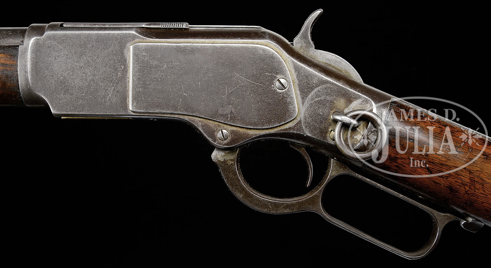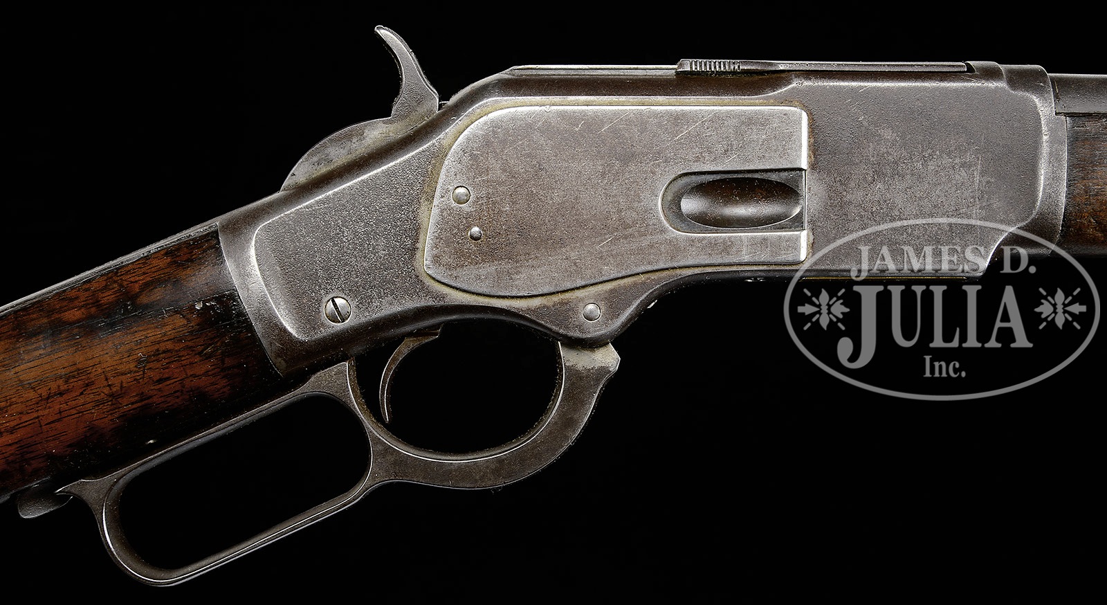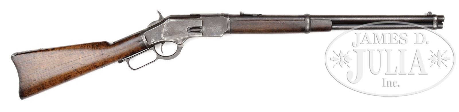 *VERY LATE WINCHESTER MODEL 1873 SADDLE RING CARBINE.SN 702589. Cal. 44 WCF (44-40). Standard grade carbine with 20″ bbl, full magazine, square base front sight and three leaf express rear sight. Left side of receiver has a staple & ring. Mounted with uncheckered straight grain American walnut with straight stock and carbine buttplate with trap. This is a very late production carbine from the late 1920’s or early 1930’s. PROVENANCE: Tommy Rholes Estate Collection. CONDITION: Fair to good. Bbl & magazine tube retain blue in sheltered areas with the balance of the metal a dark brown patina with fine frosty pitting over the receiver & side plates; stock has several grain checks and a nail in the comb, shows heavy and hard use with an old restored finish; forearm has a crack on the left side and shows hard use with a hand worn patina. Mechanics are fine; strong bore, dark in the grooves. 4-50505 JR301 (2,000-3,000) – Lot 1037