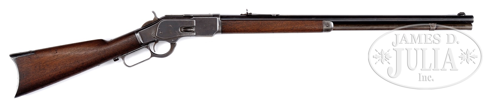 WINCHESTER 2ND MODEL 1873 ROUND BARREL FULL MAGAZINE RIFLE WITH CRESCENT BUTT AND IVORY BEAD FRONT SIGHT.SN 49553. Cal. 44 WCF. 24″ rnd bbl, full magazine, blue finish. Straight grained American walnut stocks with crescent buttplate. Bbl has 2-line Winchester address in front of rear sight. No cal marking, which is correct for this model. Front sight is a blade type with an “certifiable pre-ban elephant ivory” bead. Rear sight is a standard Buckhorn style. Receiver is of 2nd model type having dust cover guide rail attached with a screw. Upper tang is marked “Model 1873”. SN is engraved on lower tang behind lever. Elevator is unmarked, which is correct. Stocks have a crescent buttplate and a steel fore-end cap. Special Note: This item contains or is made of ivory. Do not bid on this lot unless you have read and agreed to our "Ivory Position Statement" and the "Waiver of Legal and Financial Risk to James D. Julia in regards to your Purchase of an Ivory Object." This information is located in the front section of our catalog. CONDITION: Very good. Bbl retains 50% blue overall, blending to a plumb brown patina with some scratch marks towards the muzzle. Magazine tube is a gray brown patina overall. Sights are very good. Bore is frosty with strong rifling. Receiver is a dull gray blue patina with some scratching on both sides, especially around the loading port. Hammer is a silver gray patina. Lever is a plumb brown patina. Elevator is a mustard patina. Tang markings are sharp. Stocks are very good, lightly cleaned with numerous mars and dents, especially on the bottom of the butt. Fore-end has two deep dents at mid-point and a chip missing on the forward left side. Buttplate is a silver gray patina as is the fore-end cap. A nice early Winchester Model 1873 rifle, made in 1880. 49971-10 TEP IVORY (2,000-3,000) – Lot 1037