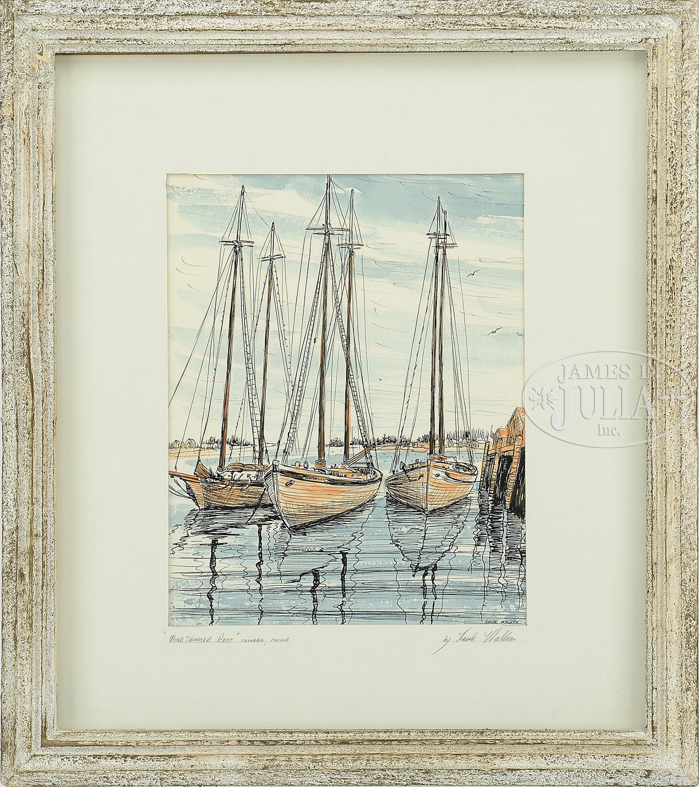 HANK (HENRY) A. WALKER (American, 1919-1995) TWO WORKS: WINDJAMMER WEST CAMDEN, MAINE AND ROCKPORT HARBOR IN WINTER.Pen and ink and watercolor and pen and ink Housed in similar white painted frames with white mats Signed on mat and bottom right on watercolor “Hank Walker”, the other signed bottom right “Hank Walker 79″ SIZE: Sight: 10-1/4″ x 8″ and 10-1/4″ x 13-1/4″ Overall: 18″ x 16″ and 18″ x 22” CONDITION: Very good 9-93450 (700-900) – Lot 1040