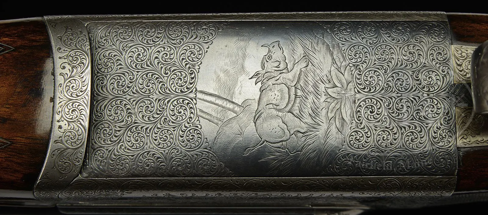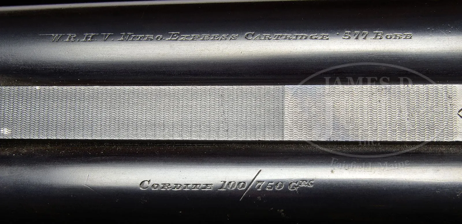 Please Note: Pre-ban ivory bead sight. Special Note: This item contains or is made of ivory. Do not bid on this lot unless you have read and agreed to our “Ivory Position Statement” and the “Waiver of Legal and Financial Risk to James D. Julia in regards to your Purchase of an Ivory Object“. This information is located in our catalog on pages 30 and 31. *.577 NITRO EXPRESS WESTLEY RICHARDS BEST DETACHABLE LOCK EJECTOR DOUBLE RIFLE WITH CASE.SN 17336. Cal. .577 Nitro Express, built and regulated for the maximum load (100 grains cordite, 750 grain bullet). This fine rifle has 26″ Shoe lump bbls which have full length top rib deeply swamped at center forming quarter rib, at rear. Top of this quarter rib is matted behind one standing, one folding leaf rear express sight marked for 100 and 200 yards. Transition to mid rib is scroll engraved and has matching scroll at front portion behind Westley Richards patent flip-over hood for front sight base, fitted with white bead and flip-up gold moon bead. Mid rib is engraved “Westley Richards 178 New Bond St London Gun Makers By Appointment to His Majesty George V Rex Et Imp.” Tops of bbls are engraved “W. R. H. V. Nitro Express Cartridge .577 Bore” and “Cordite 100/ 750 Grs.” Bbl flats are stamped with London nitro proofs for this load and with “577EX”. Bottoms of bbls are stamped “H.L” and with SNs. A narrow sling loop is screwed and soldered to bottom rib. Coin finished robust Westley Richards patent hand detachable lock action (use no. “2212”), has hinged floorplate/ cover. Locks are not engine turned, but are gold inlaid “L” and “R” on tops. Action features non-automatic bolted safety with SAFE and BOLTED inlaid in gold, sliding bolt dolls head third fastener, bushed strikers, and double triggers. Action is engraved with 80% coverage large well cut scroll. “WESTLEY RICHARDS” is in scroll terminated ribands on each side. Top of action is engraved “WESTLEY RICHARDS” “EJECTOR” in front of pivoting top lever. Scroll engraved floorplate has central vignette of trotting rhino. Top lever and trigger guard are also blued, top lever scroll engraved, trigger guard has prowling tiger on bow, and SN at grip. Tang extends to large steel trap grip cap. Well marbled and figured European walnut capped pistol grip buttstock measures 14-1/4″ over red Old English smooth pad. Side panels are checkered and have drop points. Point pattern checkering with mullered borders is at grip. A large vacant gold oval and sling loop are on toe line. Matching splinter forend has inset horn tip, Deeley ejectors and release. Drop at heel: approx 2-1/2″, drop at comb: approx 1-7/8″. Weight: 13 lbs 4 oz. LOP: 14-1/4. Makers oak and leather case with nicely shaped brass corners has central leather rectangle on top embossed “E. K. Hoyt”. Interior is lined in close checked cloth and has Westley Richards paper label in lid. Case contains a spare pair of detachable locks SNed to this gun but with patent use number “2350”. Locks are engine turned, have “L” and “R” gold inlaid, and are engraved “Extra Locks”. Ross Seyfried relates that the case was relined by Iver Henriksen of Missoula, Montana “with a pair of Pendleton Britches. Accompanied by a target with hand-written “Wesley Richards 577-100-750″… shot at 40 yards… on April 27, 1968 with Kynoch Factory soft nose”. Also in case are 2-pc wood covered steel cleaning rod, jag, brush, round oil bottle, pair of brass snap caps, two red and yellow boxes of Kynoch 577 Nitro Express, and information label used when this rifle was displayed at Cabela’s in Boise, Idaho. Included with rifle are 3 5-rnd boxes Kynoch soft and 3 5-rnd boxes Kynoch solid Elmer Keith’s .577 x 3″ ammunition for this rifle. PROVENANCE: The Elmer Keith Estate Collection. Elmer Keith referred to this rifle as “elephant medicine”, and featured it in Guns & Ammo 1964 article “Put Your Double Rifle Into Action”, as well as in many other “Gun Notes” articles. G&H archivist relates that “this rifle was received on consignment 9/22/1953 from Demetrios Samaras. it was sold to the A & B Plastic Manf’g Co for $1450 on 4/14/1954. It was consigned again by Ben Schur in 1957 and withdrawn by him later that year. It was then consigned again by “H. Schur in 1961, and withdrawn again in 1962.” CONDITION: Excellent, as refinished. Bbls retain approx 80% of an old re-black over light pitting, engraving slightly softened. Action has been coin finished and is a pleasing silver gray. Top lever, floorplate, and trigger guard retain most of their re-blue, guard considerably silvered at grip. Stocks retain nearly all of an old oil finish over some light dents and marks, checkering competently re-cut. Bores are very fine, with strong rifling throughout, lightly frosted in grooves. Right bbl shows more wear than left. Action is tight. Bbls are on face. Ejectors are in time. Case leather is dark, considerably rubbed and scuffed. Handle is a bit tired, and shows old reinforcement. Newer straps are good. New lining cloth is fine. Old label on orig green baize shows many cracks and chips, and is considerably foxed. Accessories are good. Cleaning rod has large chip and crack in wood. An exceptionally rare big bore stopping rifle in good mechanical nick. 4-47963 RJS/MGM135 (50,000-80,000) – Lot 1040 | Click here to view provenance