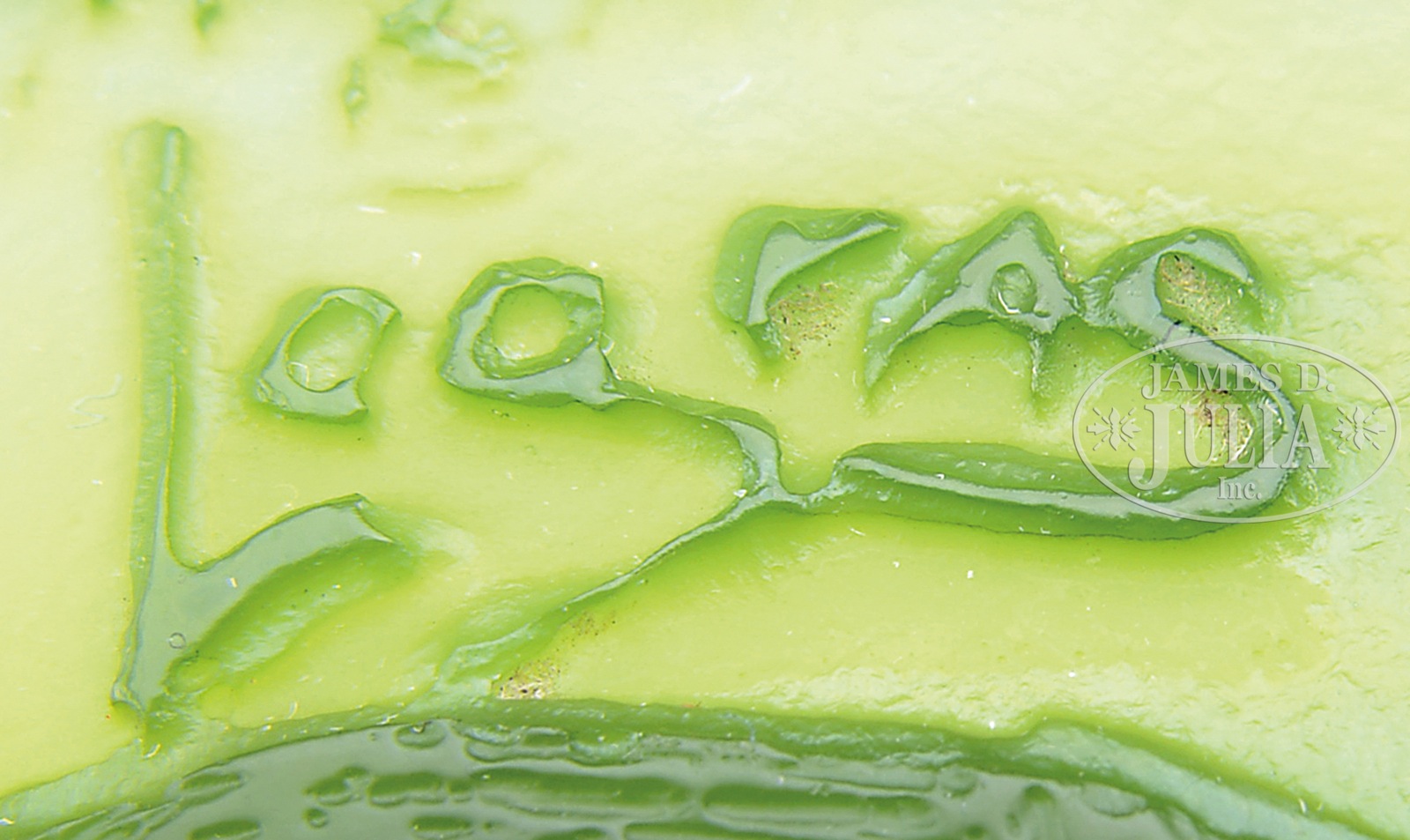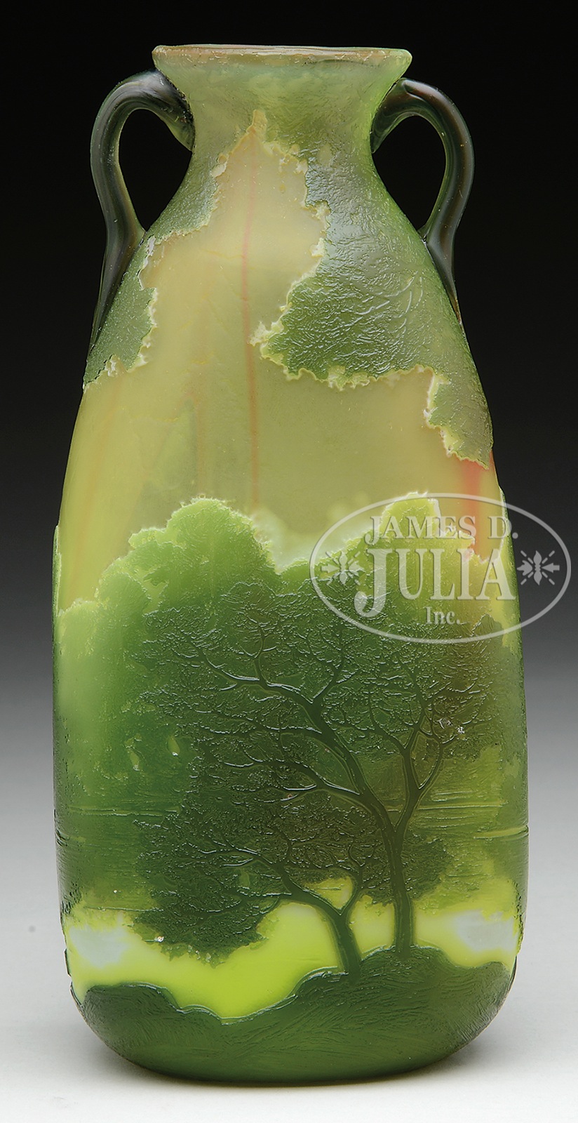 LEGRAS SCENIC CAMEO VASE.Legras vase has rich green acid cut cameo trees with mottled white outlines against a frosted citrine background with subtle red striations. Large trees on the front of vase frame a serene pond in green, yellow and white cameo. Vase is finished with 2 translucent green applied handles with red striations. Signed on the side in cameo “Legras”. SIZE: 9-1/2″ t. PROVENANCE: Dr. Robert LeVere Collection. CONDITION: Very good to excellent. 49726-18 (900-1,200) – Lot 1041
