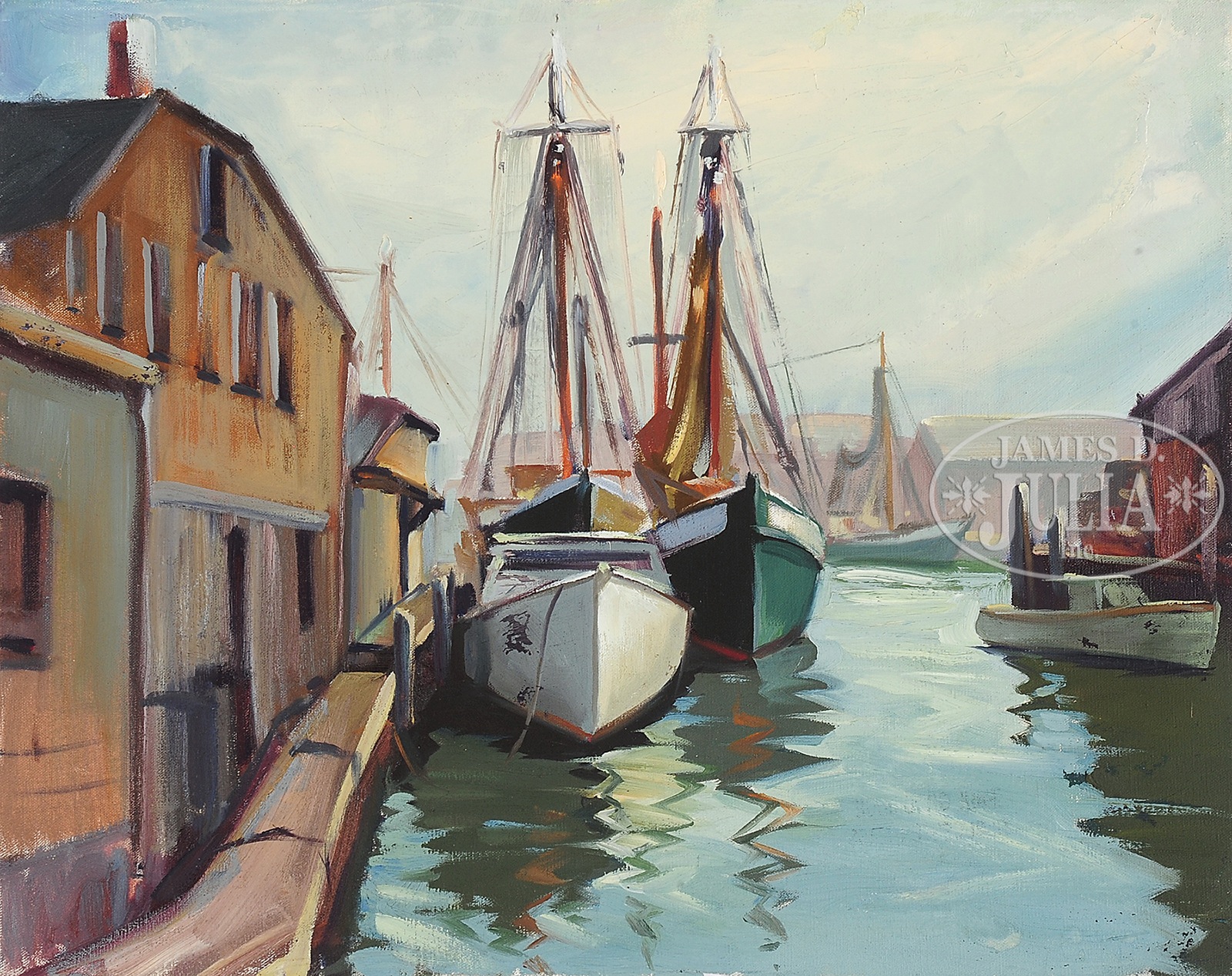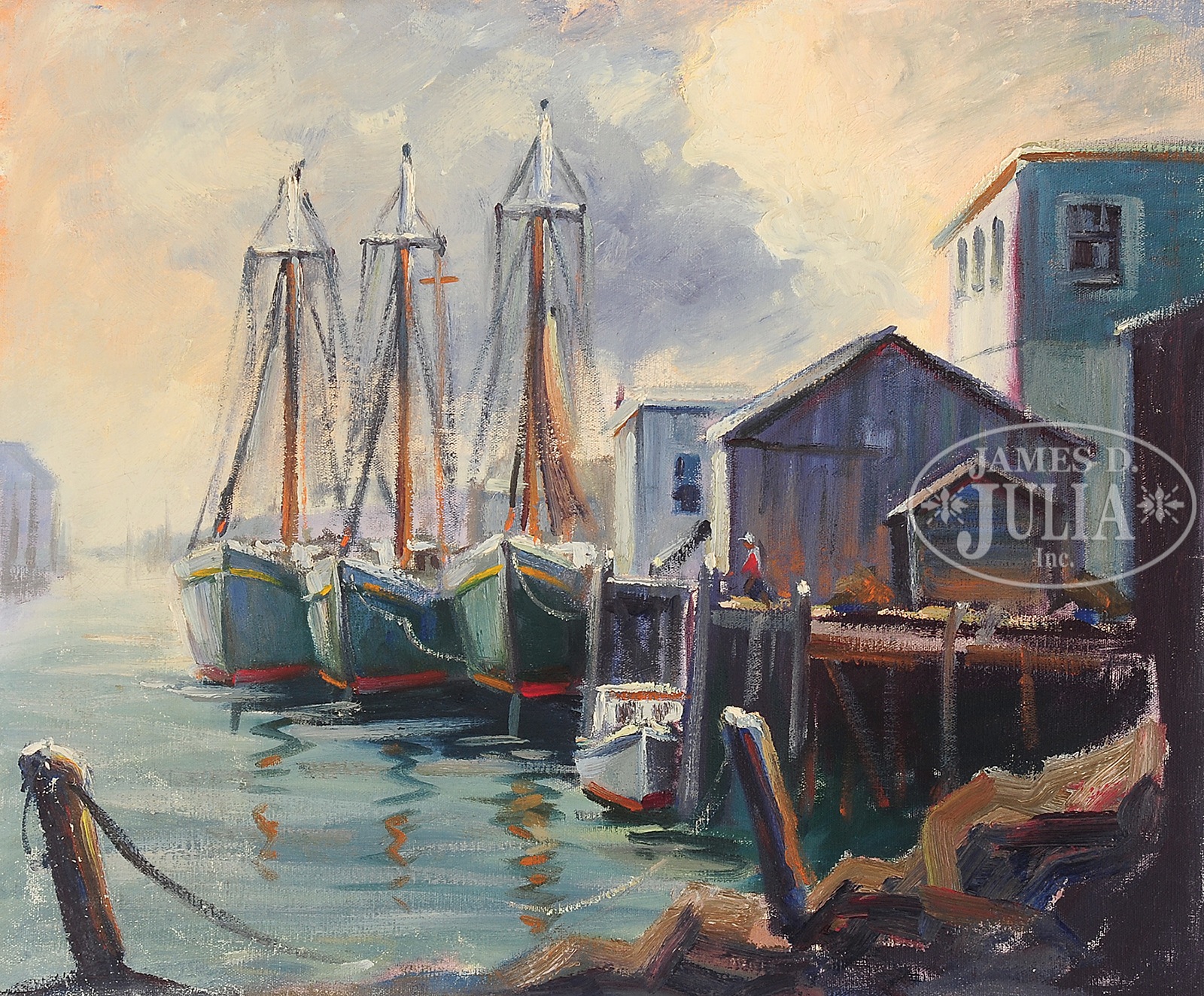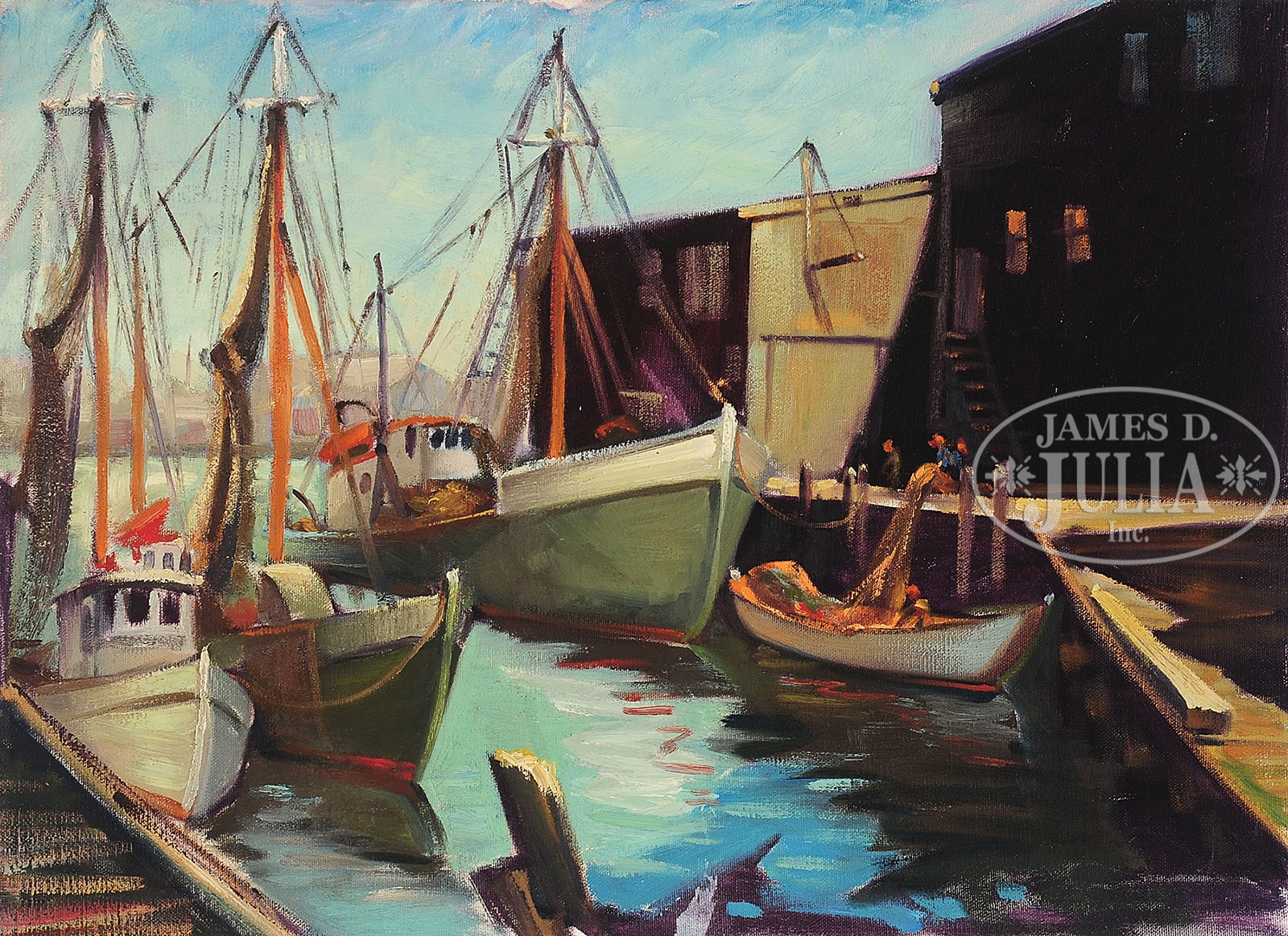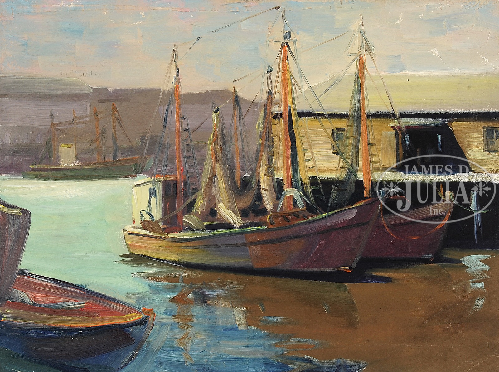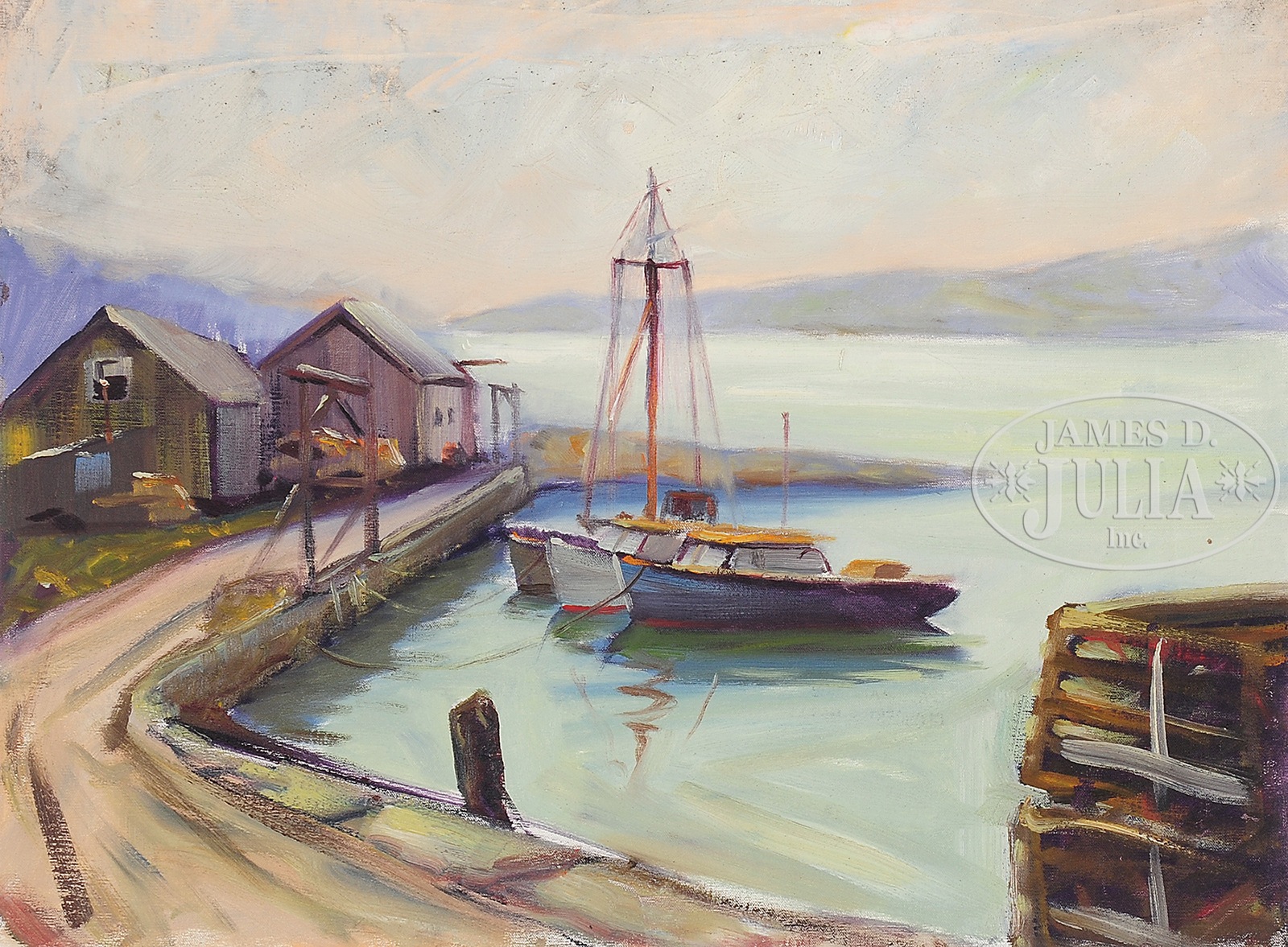 PAUL GOODRIDGE (American, 1912-1991) COLLECTION OF THIRTY-FIVE OIL PAINTINGS.Oils on canvas Unstretched and unframed All estate stamped on verso “Paul Goodridge, Gloucester, Mass” Including: 1) Boats at Dock, dated “July 12, 60″ on verso, 21″ x 27″; 2) 28 Dock Views, ranging from 16″ x 20″ to 20″ x 24″; 3) Small Dock View,. 11-1/2″ x 16″ 4) Seascape, 15″ x 18″ 5) Quarry in Autumn, 20″ x 24” 6) Still Life, signed and dated lower right “Paul Goodridge 34″, 19-1/4″ x 16″ 7) Two Portraits, 20″ x 16″ SIZE: Up to 21″ x 27” PROVENANCE: Acquired from the Estate of the Artist CONDITION: All loose, unstretched. Many in good condition, some with losses, creases and surface abrasions. 49932-7 (1,500-2,500) – Lot 1043