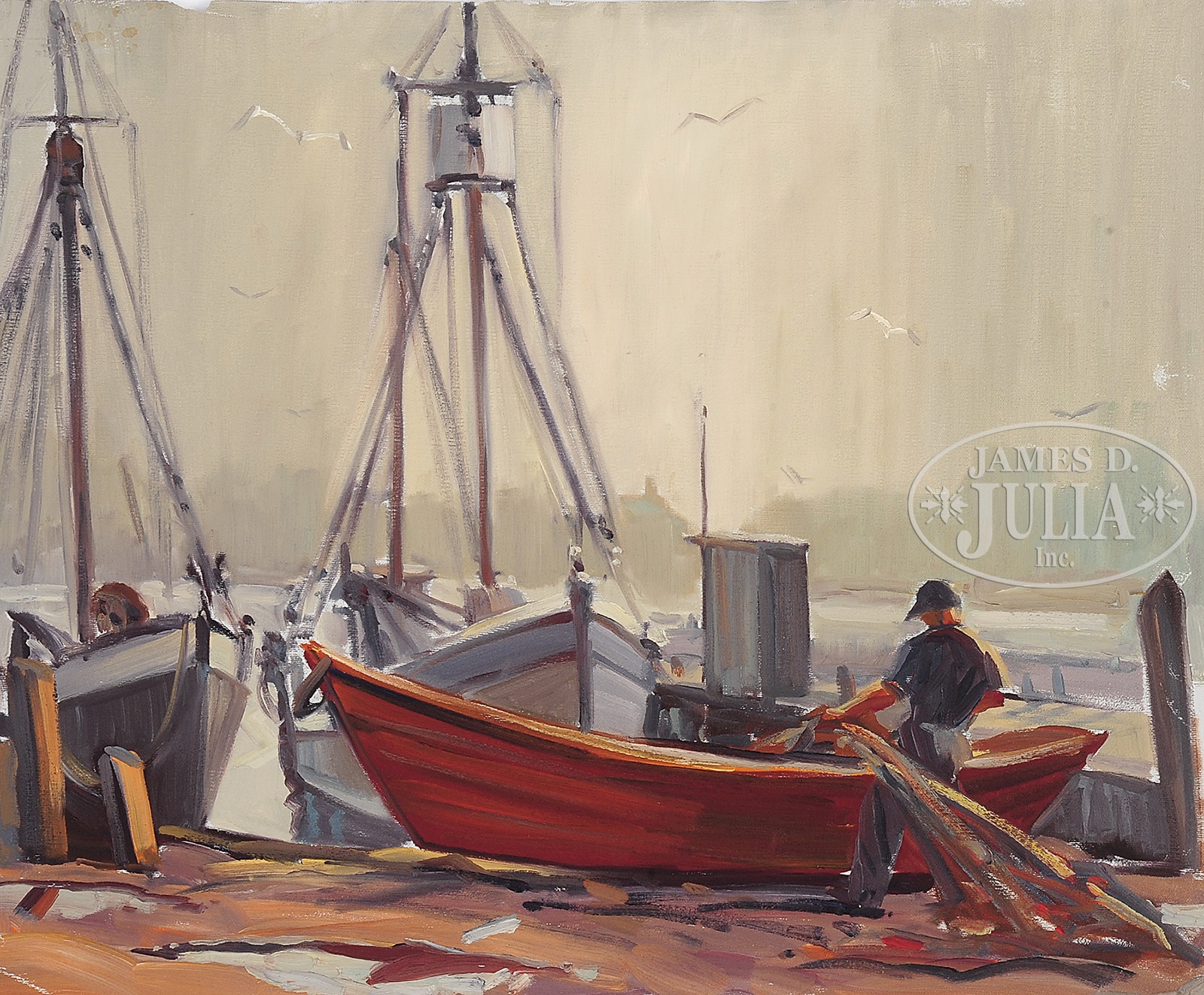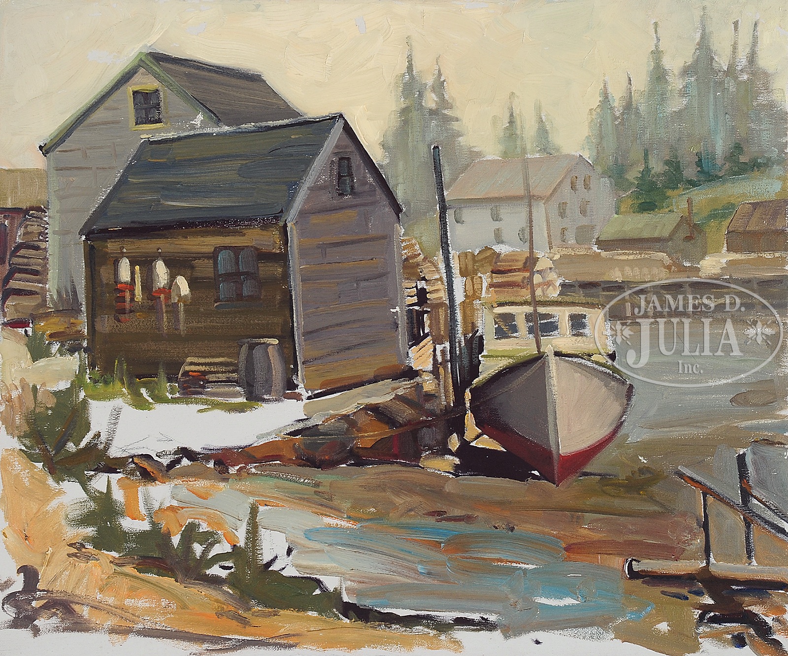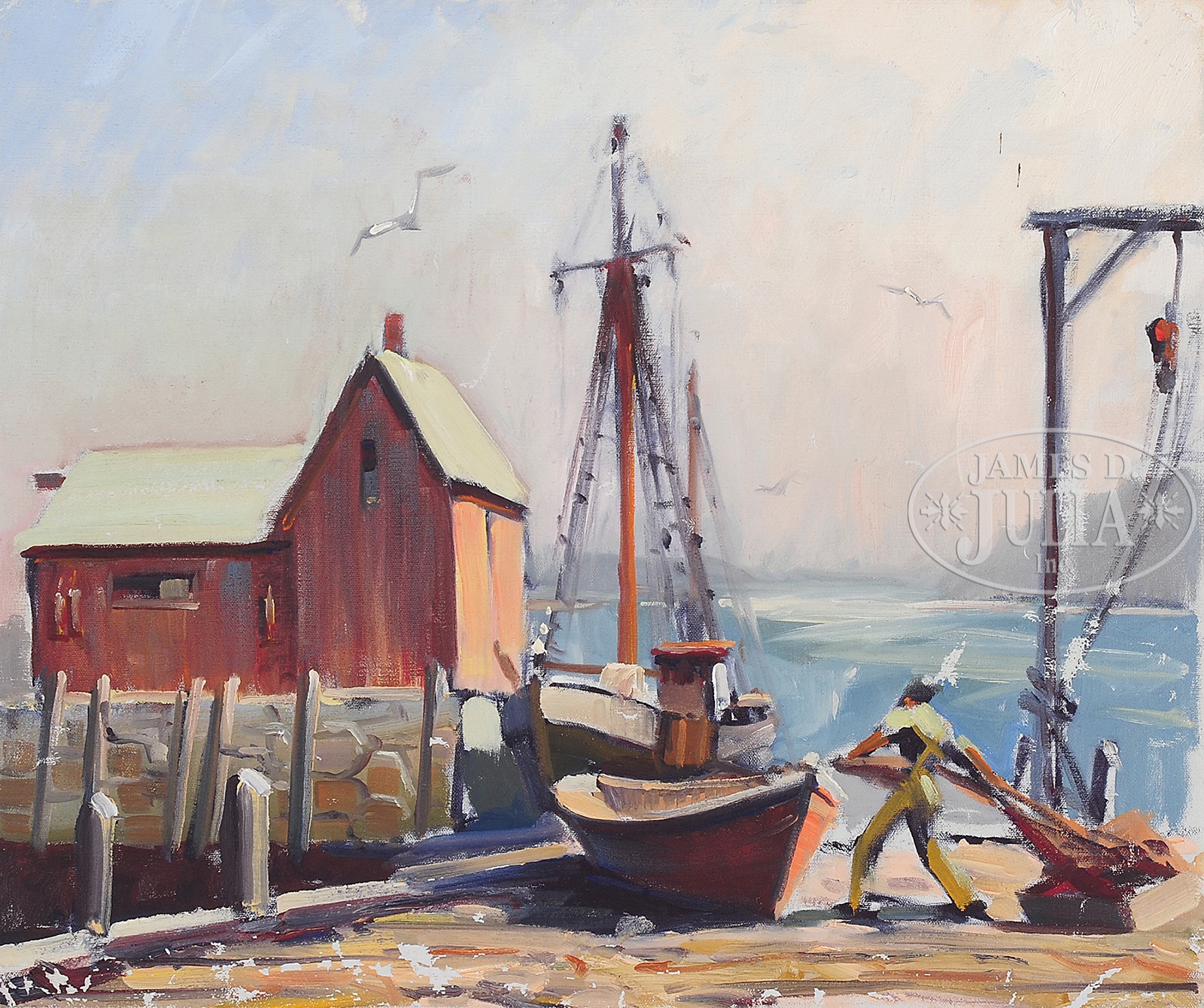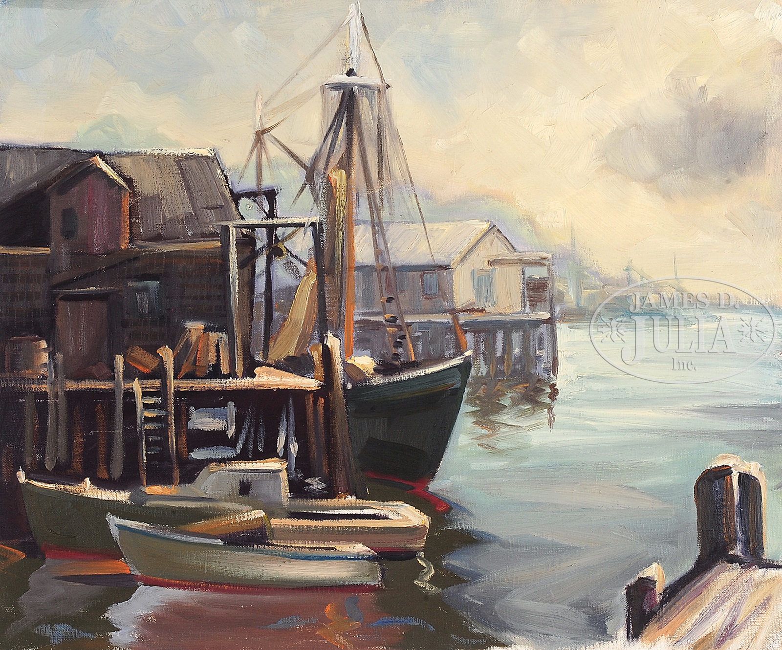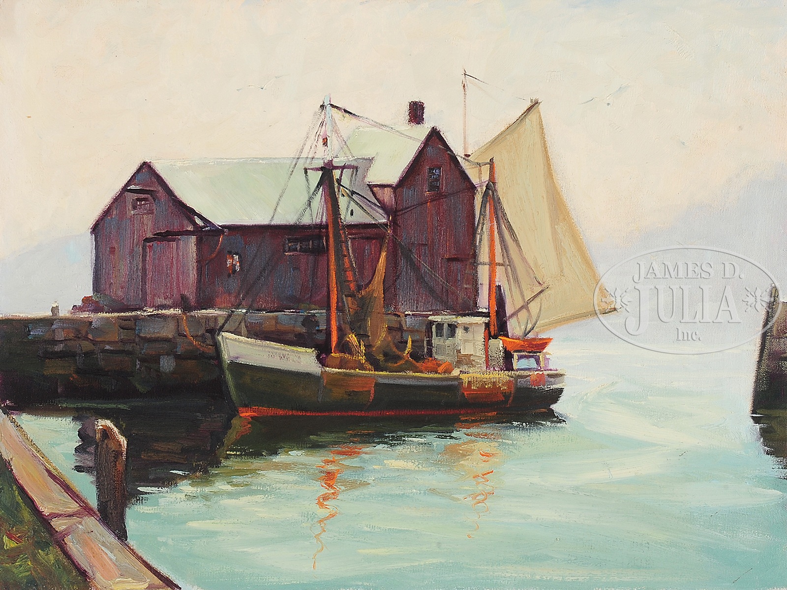 PAUL GOODRIDGE (American, 1912-1991) COLLECTION OF THIRTY-FIVE OIL PAINTINGS.Oils on canvas Unstretched and unframed All estate stamped on verso “Paul Goodridge, Gloucester, Mass” Including: 1) Boats at Dock, dated “July 12, 60″ on verso, 21″ x 27″; 2) 28 Dock Views, ranging from 16″ x 20″ to 20″ x 24″; 3) Small Dock View,. 11-1/2″ x 16″ 4) Seascape, 15″ x 18″ 5) Quarry in Autumn, 20″ x 24” 6) Still Life, signed and dated lower right “Paul Goodridge 34″, 19-1/4″ x 16″ 7) Two Portraits, 20″ x 16″ SIZE: Up to 21″ x 27” PROVENANCE: Acquired from the Estate of the Artist CONDITION: All loose, unstretched. Many in good condition, some with losses, creases and surface abrasions. 49932-7 (1,500-2,500) – Lot 1043