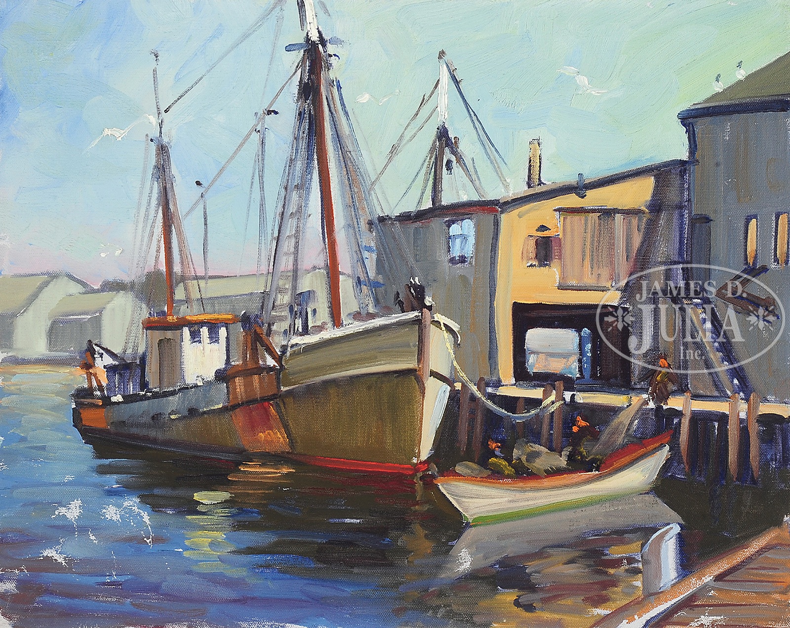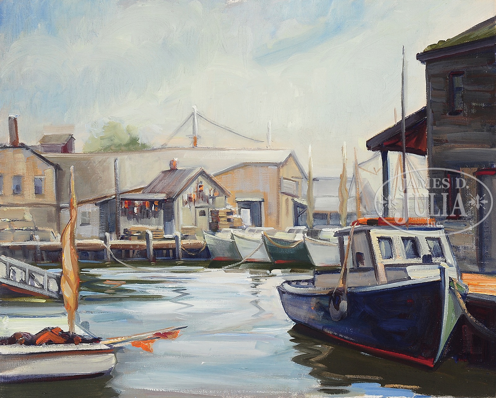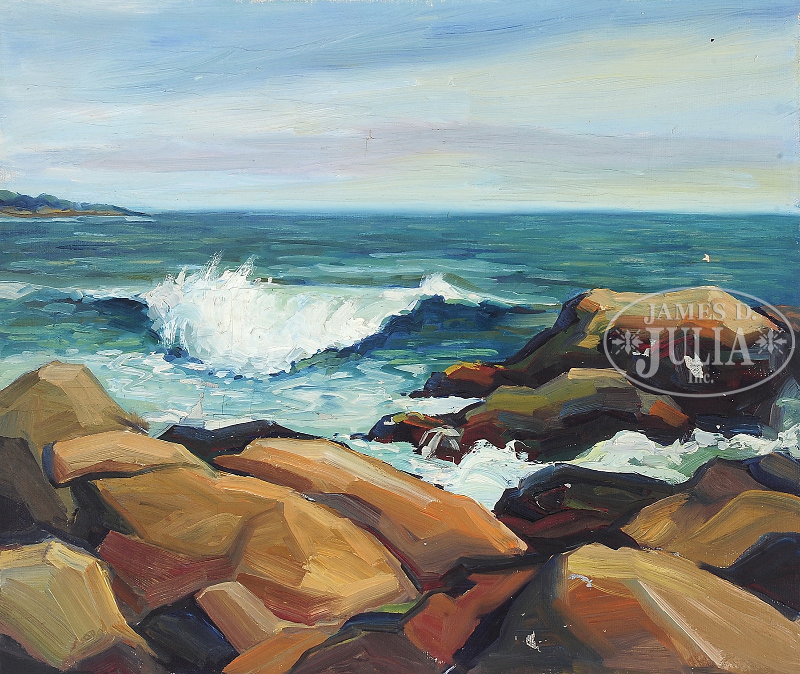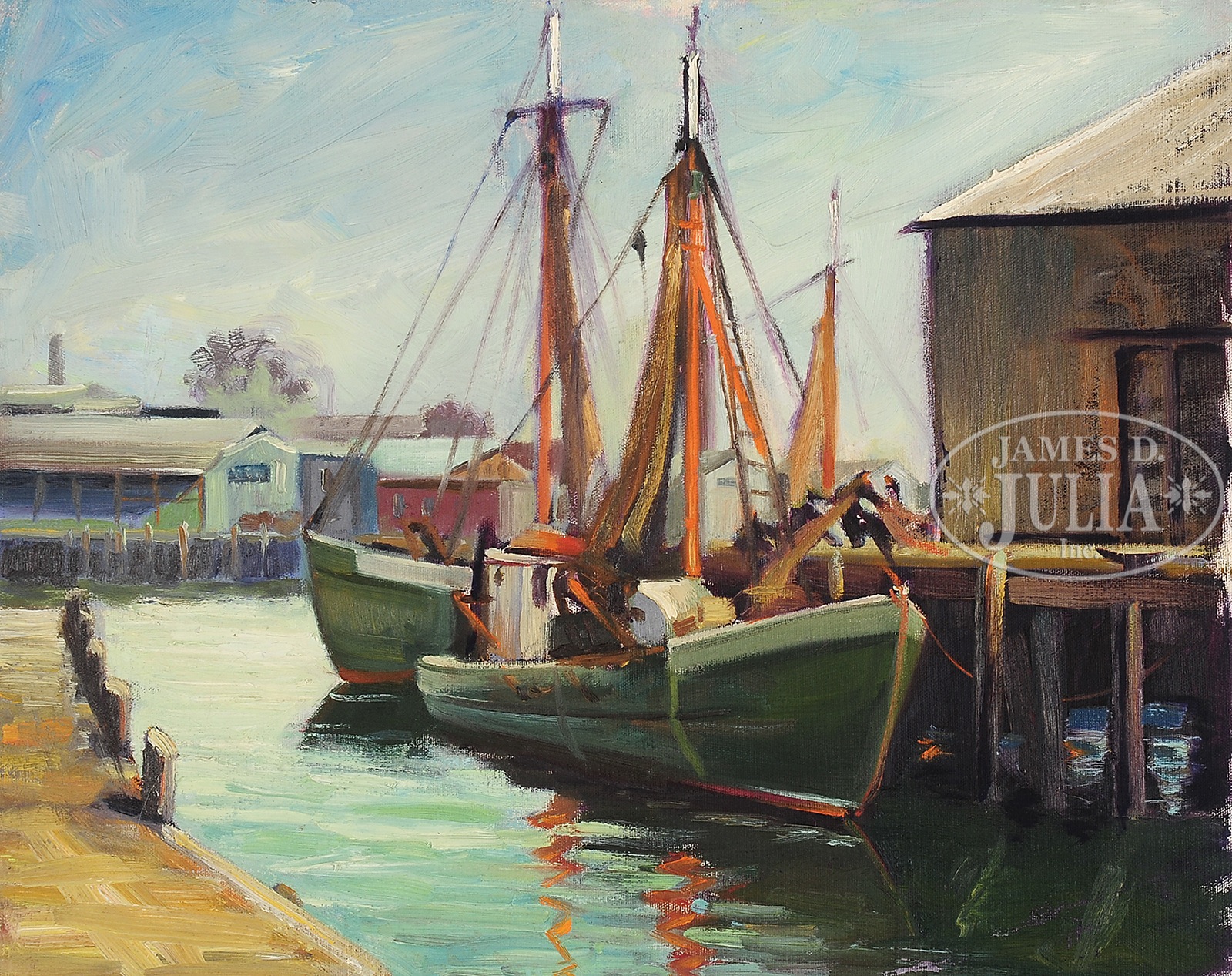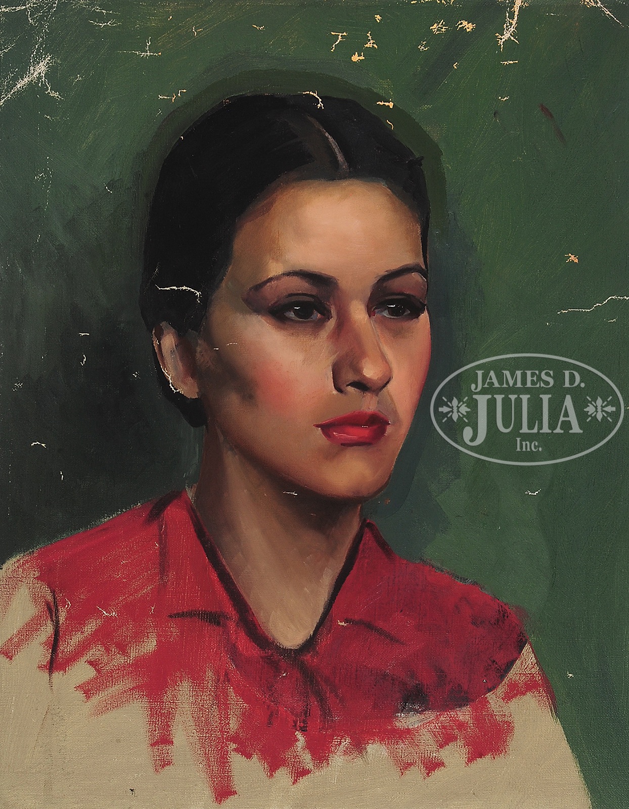 PAUL GOODRIDGE (American, 1912-1991) COLLECTION OF THIRTY-FIVE OIL PAINTINGS.Oils on canvas Unstretched and unframed All estate stamped on verso “Paul Goodridge, Gloucester, Mass” Including: 1) Boats at Dock, dated “July 12, 60″ on verso, 21″ x 27″; 2) 28 Dock Views, ranging from 16″ x 20″ to 20″ x 24″; 3) Small Dock View,. 11-1/2″ x 16″ 4) Seascape, 15″ x 18″ 5) Quarry in Autumn, 20″ x 24” 6) Still Life, signed and dated lower right “Paul Goodridge 34″, 19-1/4″ x 16″ 7) Two Portraits, 20″ x 16″ SIZE: Up to 21″ x 27” PROVENANCE: Acquired from the Estate of the Artist CONDITION: All loose, unstretched. Many in good condition, some with losses, creases and surface abrasions. 49932-7 (1,500-2,500) – Lot 1043