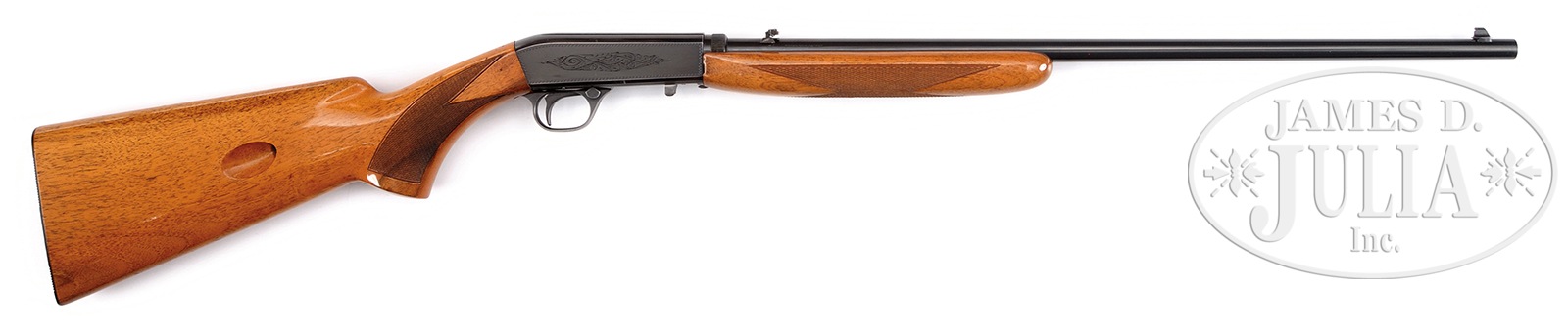 SN 5E21296. Cal. 22 short. Desirable rifle manufactured in Belgium in 1965. 22″ round bbl with bead front sight and folding leaf rear sight. Grooved top receiver with scroll and border engraving having bright blue finish. Beavertail forearm and pistol grip stock of light colored European walnut with hand checkering. CONDITION: Retains approx 90% orig blue with wear on sharp edges. Very good bright bore. Scope mounting grooves on top of receiver have uneven edges from scope mount attachment. Stocks have good orig finish showing numerous light handling marks. 51034-27 DS (1,000-2,000) C&R – Lot 1044