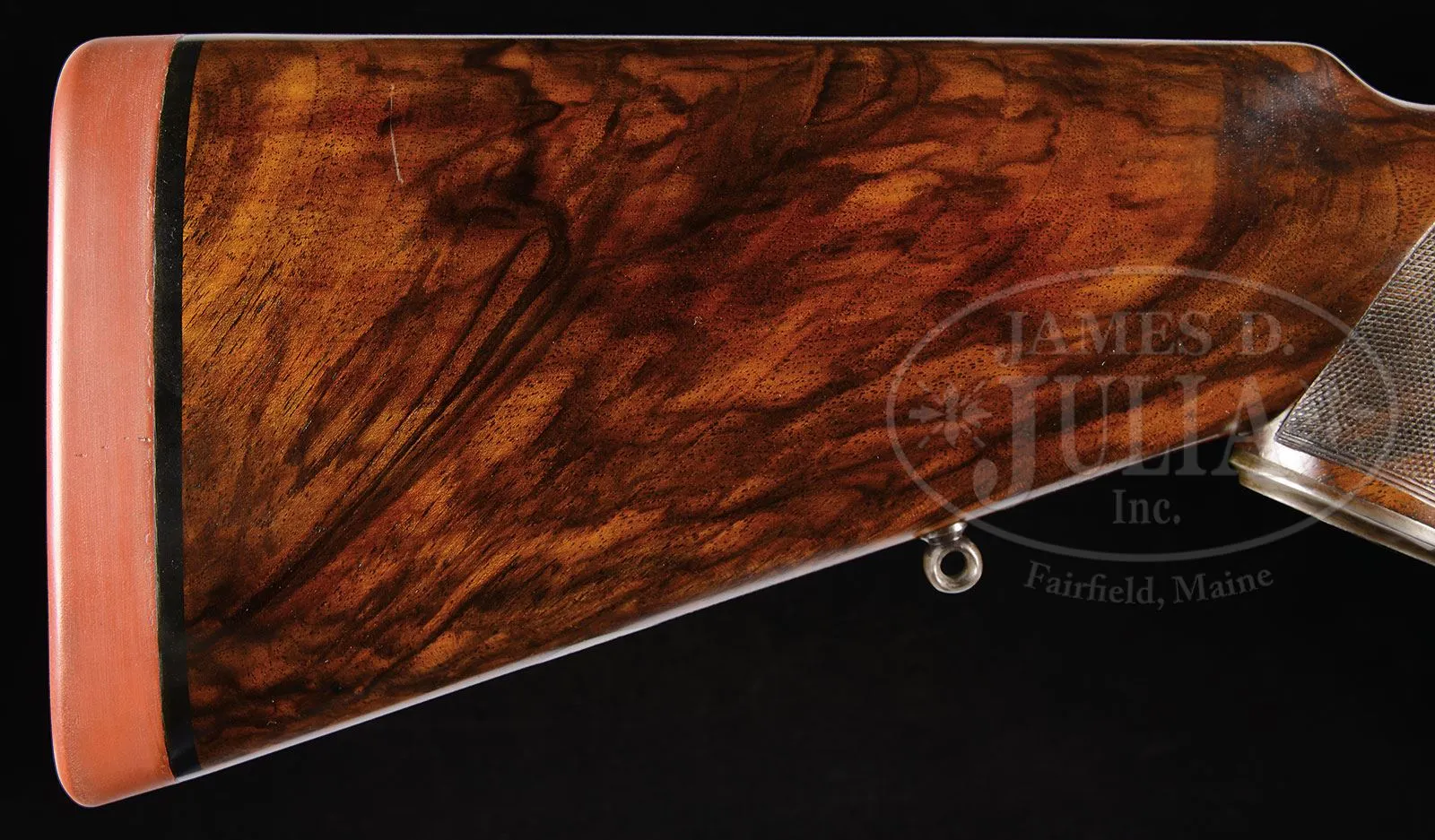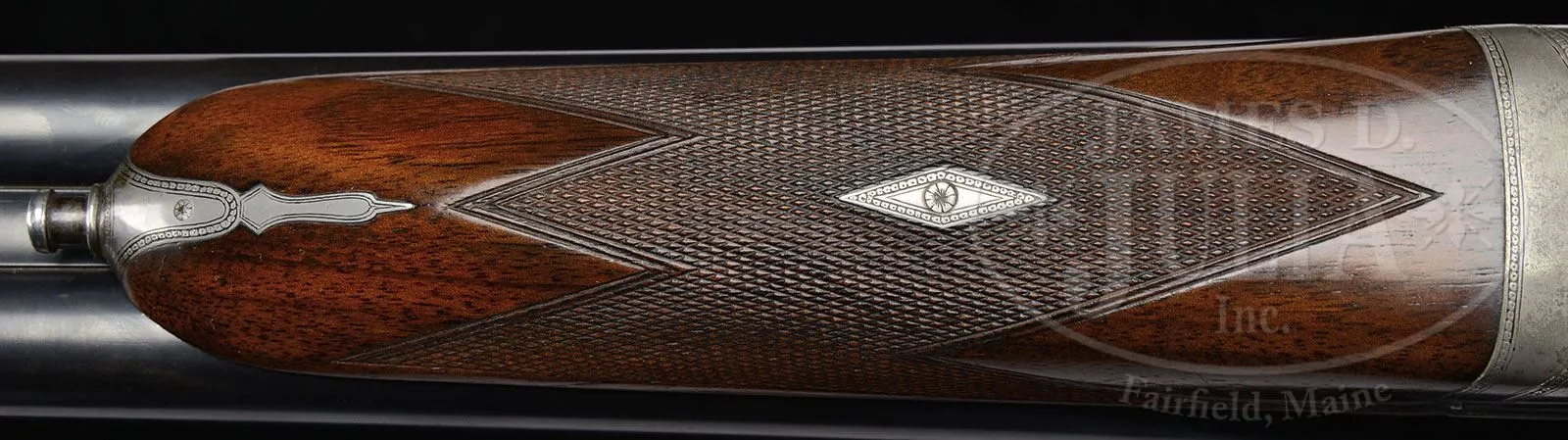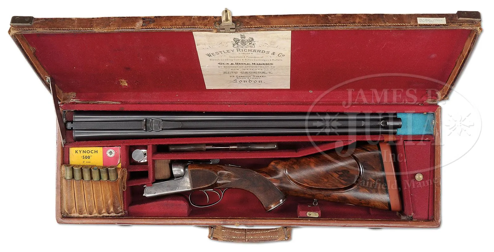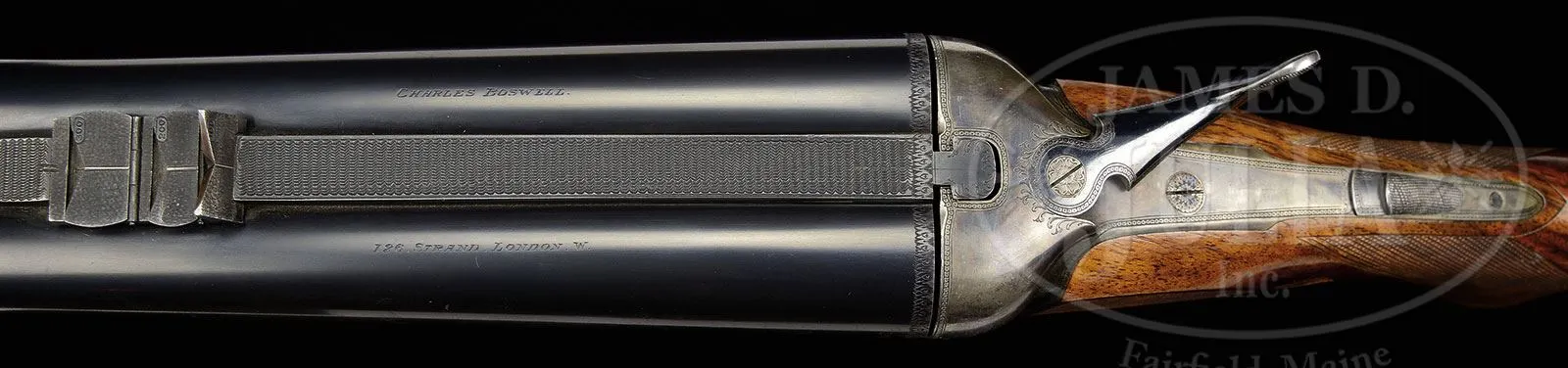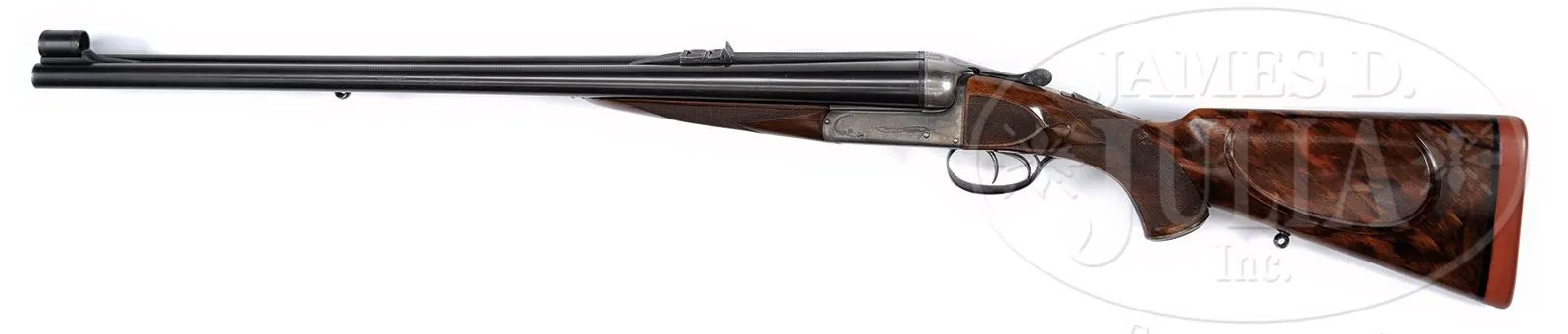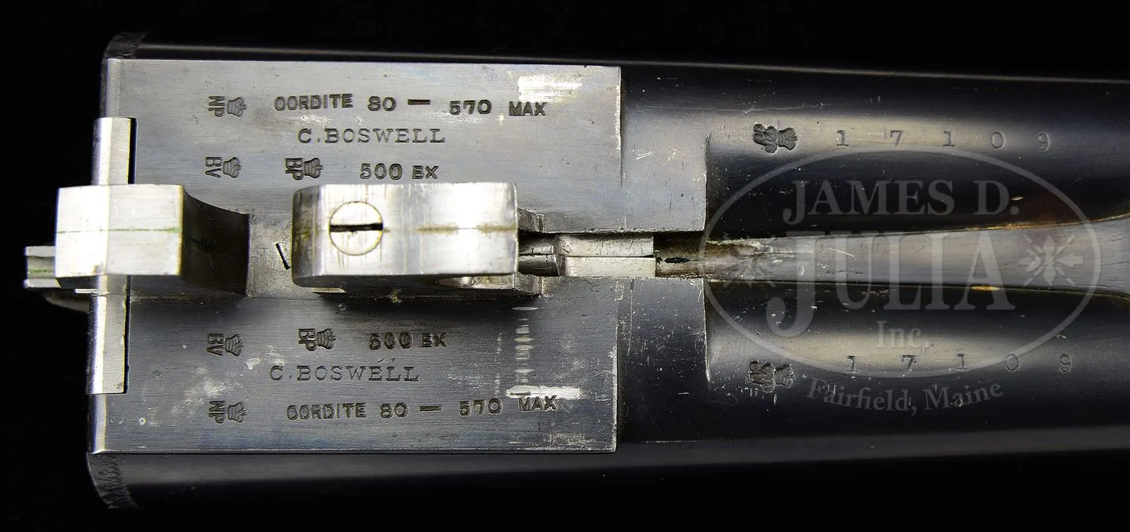 *CHARLES BOSWELL BOXLOCK EJECTOR BIG GAME DOUBLE RIFLE WITH CASE.SN 17109. Cal. .500 Nitro Express. 24″ Chopper lump bbls with matted quarter rib, mid-rib, and stippled front sight base, are fitted with one standing, two folding leaf express rear sight, with platinum lines marked for 100, 200, and 300 yards, and a sourdough front bead. A heavy machined sight protector mounts on front ramp. Tops of bbls are engraved “Charles Boswell.” and “126. Strand. London. W.” Bbl flats are stamped with Birmingham nitro proofs for 80 grains of cordite and 570 grain bullet, as well as “C. BOSWELL”. SNs are on bottoms of bbls. A sling eye is screwed to bottom rib. Case hardened boxlock action features non-automatic safety (“S” gold inlaid), square shouldered dolls head rib extension, bushed strikers, and double triggers. Front trigger is “loose”, to prevent trigger finger bruising. Action is engraved with beaded borders and “Charles Boswell” is in scroll flanked banner on each side. Top lever, floorplate, and trigger guard are blued. SN is on trigger guard tang which extends to plain steel trap grip cap. Finely marbled European walnut full pistol grip buttstock measures 14-1/2″ over Silver type pad, and features right hand shadow line cheekpiece, drop points, checkered side panels, classic point pattern grip checkering, along with a sling eye and silver oval engraved “EK” on toe line. Matching splinter ejector forend has Anson release. Drop at heel: approx 1-13/16″, drop at comb: approx 1-5/8″. Weight: 11 lbs 12 oz. LOP: 14-1/2″. Old Westley Richards leather case with brass corners, has “Ted F. Keith” address label on front edge of lid, and interior is lined in carmine cloth, and has large paper Westley Richards label in lid. Case contains T-handled striker key, two pairs of snap caps, felt bag with recovered bullets, spare front sight with silver bead and pop-up moon sight, all in covered compartment. Also included are a leather muzzle protector, square oil bottle, leather cartridge holder containing six Kynoch 500 nitro rounds, and three red and yellow boxes of Kynoch 3″ 500 nitro, Sections of two targets shot by Elmer Keith with this rifle, show excellent grouping, as well as, information label for this rifle. Also included are 3 5-rnd boxes Kynoch soft and 3 5-rnd boxes Kynoch solid Elmer Keith’s .500 x 3″ ammunition for this rifle. PROVENANCE: The Elmer Keith Estate Collection. Ross Seyfried relates: “This was Elmer’s “elephant rifle” that he used to take several bull elephant. In his later years, he kept this rifle beside his chair and would shoulder it several times every day to stay in shape. Accompanied by a target that was shot on April 27, 1968 with 570 grain factory Kynoch soft nose. Also, another target shot on August 7, 1968.” This rifle was mentioned and pictured in numerous articles by Mr. Keith, including “Worlds Biggest Big Game” in Guns and Ammo Sept 1970. CONDITION: Excellent, as partially refurbished. Bbls retain over 90% of an old professional re-black. Action retains approx 30% of what appears to be orig case hardening color, balance a smooth silver gray patina. Top lever and floorplate retain most of their orig charcoal blue. Trigger guard retains over 80% of a rust re-blue. Stocks retain over 90% of an old oil refinish. Checkering re-cut and lightly worn. Buttstock is a possible old high quality correctly shaped replacement. Bores are exceptionally fine, bright, sharp, and shiny throughout. Action is tight. Bbls are on face. Ejectors are strong and in time. Case leather is still relatively light in color, but has numerous heavy scuffs, marks, and rubs, some nearly through. Handle and straps are good. Interior cloth is good with many rubs and marks, some through. Case has been reinforced with screwed-in angle brackets in bbl channel, with muzzle support recovered in blue cloth. Partitions are generally good. Accessories are good. Despite its weight this rifle is exceptionally well balanced and handy. No wonder it was one of Elmer Keith’s favorites. 4-47959 RJS/MGM132 (20,000-30,000) – Lot 1045 Click here to view provenance