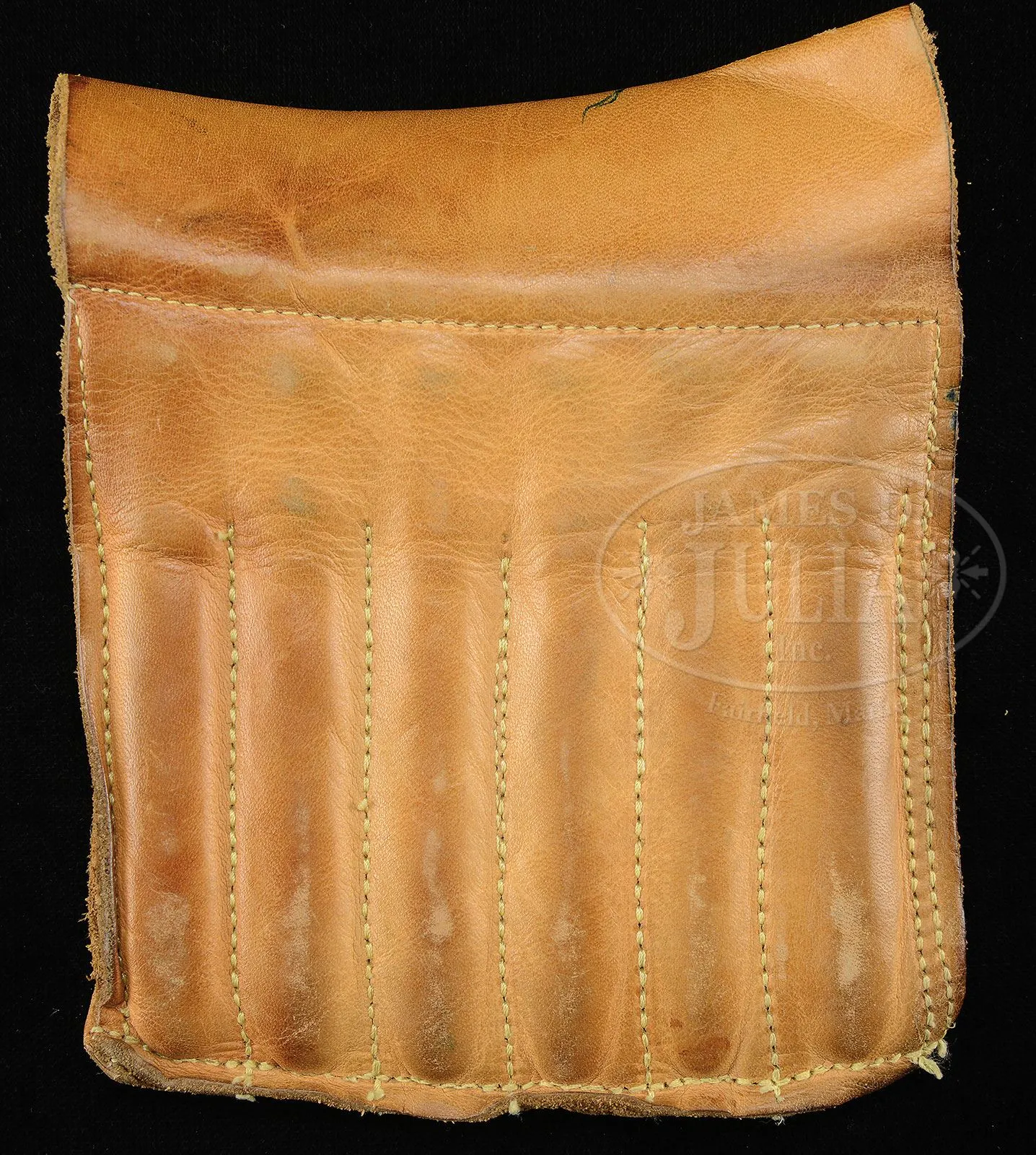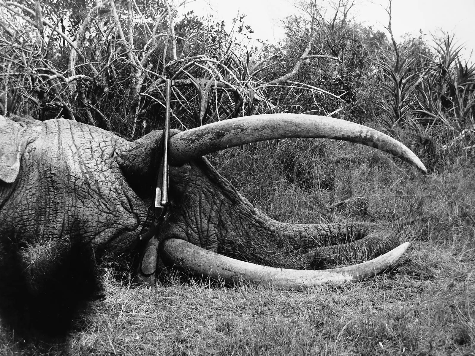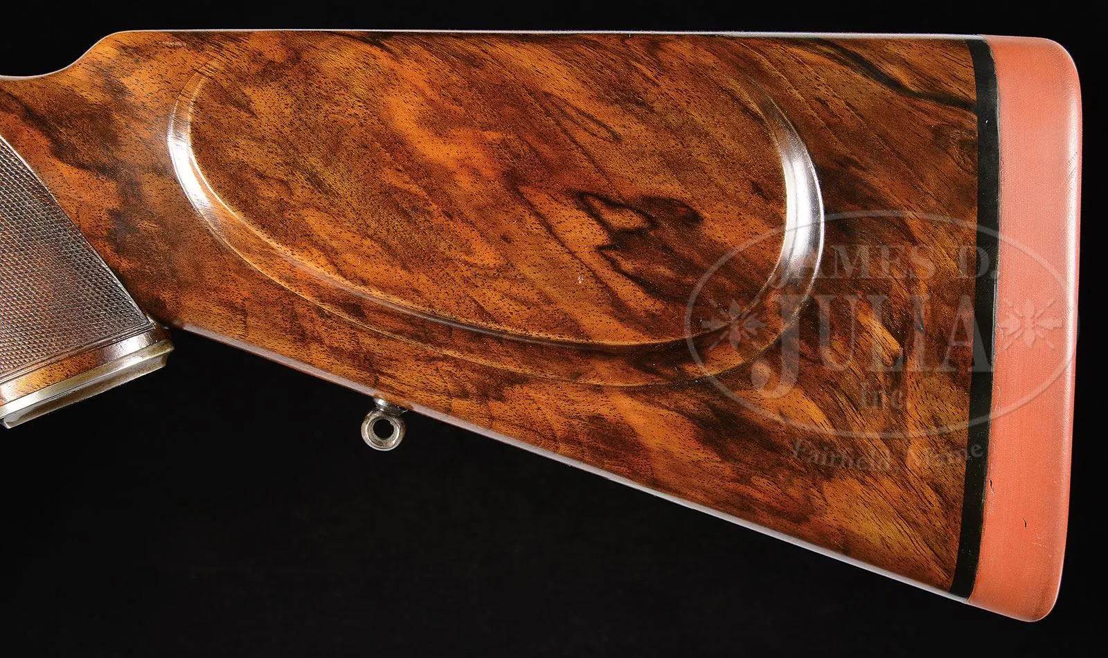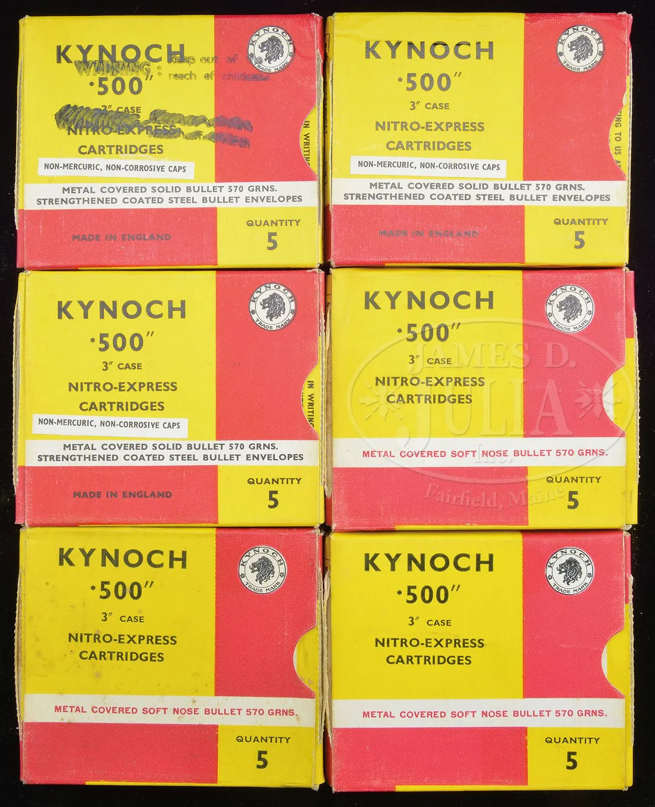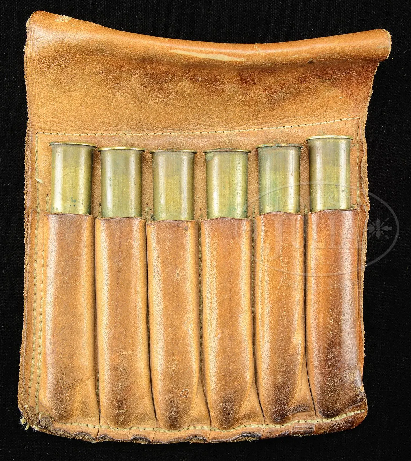 *CHARLES BOSWELL BOXLOCK EJECTOR BIG GAME DOUBLE RIFLE WITH CASE.SN 17109. Cal. .500 Nitro Express. 24″ Chopper lump bbls with matted quarter rib, mid-rib, and stippled front sight base, are fitted with one standing, two folding leaf express rear sight, with platinum lines marked for 100, 200, and 300 yards, and a sourdough front bead. A heavy machined sight protector mounts on front ramp. Tops of bbls are engraved “Charles Boswell.” and “126. Strand. London. W.” Bbl flats are stamped with Birmingham nitro proofs for 80 grains of cordite and 570 grain bullet, as well as “C. BOSWELL”. SNs are on bottoms of bbls. A sling eye is screwed to bottom rib. Case hardened boxlock action features non-automatic safety (“S” gold inlaid), square shouldered dolls head rib extension, bushed strikers, and double triggers. Front trigger is “loose”, to prevent trigger finger bruising. Action is engraved with beaded borders and “Charles Boswell” is in scroll flanked banner on each side. Top lever, floorplate, and trigger guard are blued. SN is on trigger guard tang which extends to plain steel trap grip cap. Finely marbled European walnut full pistol grip buttstock measures 14-1/2″ over Silver type pad, and features right hand shadow line cheekpiece, drop points, checkered side panels, classic point pattern grip checkering, along with a sling eye and silver oval engraved “EK” on toe line. Matching splinter ejector forend has Anson release. Drop at heel: approx 1-13/16″, drop at comb: approx 1-5/8″. Weight: 11 lbs 12 oz. LOP: 14-1/2″. Old Westley Richards leather case with brass corners, has “Ted F. Keith” address label on front edge of lid, and interior is lined in carmine cloth, and has large paper Westley Richards label in lid. Case contains T-handled striker key, two pairs of snap caps, felt bag with recovered bullets, spare front sight with silver bead and pop-up moon sight, all in covered compartment. Also included are a leather muzzle protector, square oil bottle, leather cartridge holder containing six Kynoch 500 nitro rounds, and three red and yellow boxes of Kynoch 3″ 500 nitro, Sections of two targets shot by Elmer Keith with this rifle, show excellent grouping, as well as, information label for this rifle. Also included are 3 5-rnd boxes Kynoch soft and 3 5-rnd boxes Kynoch solid Elmer Keith’s .500 x 3″ ammunition for this rifle. PROVENANCE: The Elmer Keith Estate Collection. Ross Seyfried relates: “This was Elmer’s “elephant rifle” that he used to take several bull elephant. In his later years, he kept this rifle beside his chair and would shoulder it several times every day to stay in shape. Accompanied by a target that was shot on April 27, 1968 with 570 grain factory Kynoch soft nose. Also, another target shot on August 7, 1968.” This rifle was mentioned and pictured in numerous articles by Mr. Keith, including “Worlds Biggest Big Game” in Guns and Ammo Sept 1970. CONDITION: Excellent, as partially refurbished. Bbls retain over 90% of an old professional re-black. Action retains approx 30% of what appears to be orig case hardening color, balance a smooth silver gray patina. Top lever and floorplate retain most of their orig charcoal blue. Trigger guard retains over 80% of a rust re-blue. Stocks retain over 90% of an old oil refinish. Checkering re-cut and lightly worn. Buttstock is a possible old high quality correctly shaped replacement. Bores are exceptionally fine, bright, sharp, and shiny throughout. Action is tight. Bbls are on face. Ejectors are strong and in time. Case leather is still relatively light in color, but has numerous heavy scuffs, marks, and rubs, some nearly through. Handle and straps are good. Interior cloth is good with many rubs and marks, some through. Case has been reinforced with screwed-in angle brackets in bbl channel, with muzzle support recovered in blue cloth. Partitions are generally good. Accessories are good. Despite its weight this rifle is exceptionally well balanced and handy. No wonder it was one of Elmer Keith’s favorites. 4-47959 RJS/MGM132 (20,000-30,000) – Lot 1045 Click here to view provenance