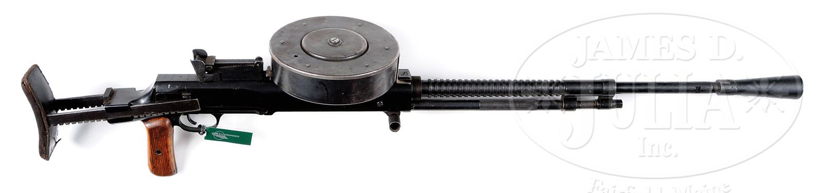 **RUSSIAN DEGTYAREV TANK MODEL MACHINE GUN (C&R).SN 3766. 7.62 x 54R mm. 28-1/4″ bbl with flash hider. This Degtyarev tank gun has a telescoping buttstock found on this model as well as one high capacity pan magazine. Gun was manufactured in 1935, bbl in 1937. SNs do not appear to be matching. Operating piston tube moves under proper tension of its spring to gas port however operating piston is frozen in forward position with rust in evidence where piston meets cylinder; this is a hazard of shooting corrosive ammunition and leaving a gun uncleaned. Otherwise telescoping buttstock moves freely, pan magazine fits positively onto top of action. Safety articulates properly. PROVENANCE: The class III weapons formerly on loan to Evergreen Aviation & Space Museum. CONDITION: Overall finish and appearance is fine as refinished with some scratches, gouges and slight pitting in evidence under refinish. Receiver retains about 90% of its lustrous refinish. Bbl has a much more rough and dark finish about 60% with some pitting and wear marks as well as some evidence of corrosion where gas cylinder meets gas port. Wooden hand grip rates very good with a couple of fairly deep gouges and some handling marks but still very complete and serviceable. Leather cover on butt thinning to holes at top corners and almost worn through at high points of lower corners but horsehair pad inside is still complete this is still a very serviceable pad. Magazine retains about 50% of its orig finish with some pitting showing through and mostly blue thinning to gray. Spring does have its tension although it seems a little bit weak. This is a rare model of a popular and sought after design and would make a welcome addition to a Russian machine gun collection. 4-51765 JWK51 (25,000-30,000) – Lot 1046