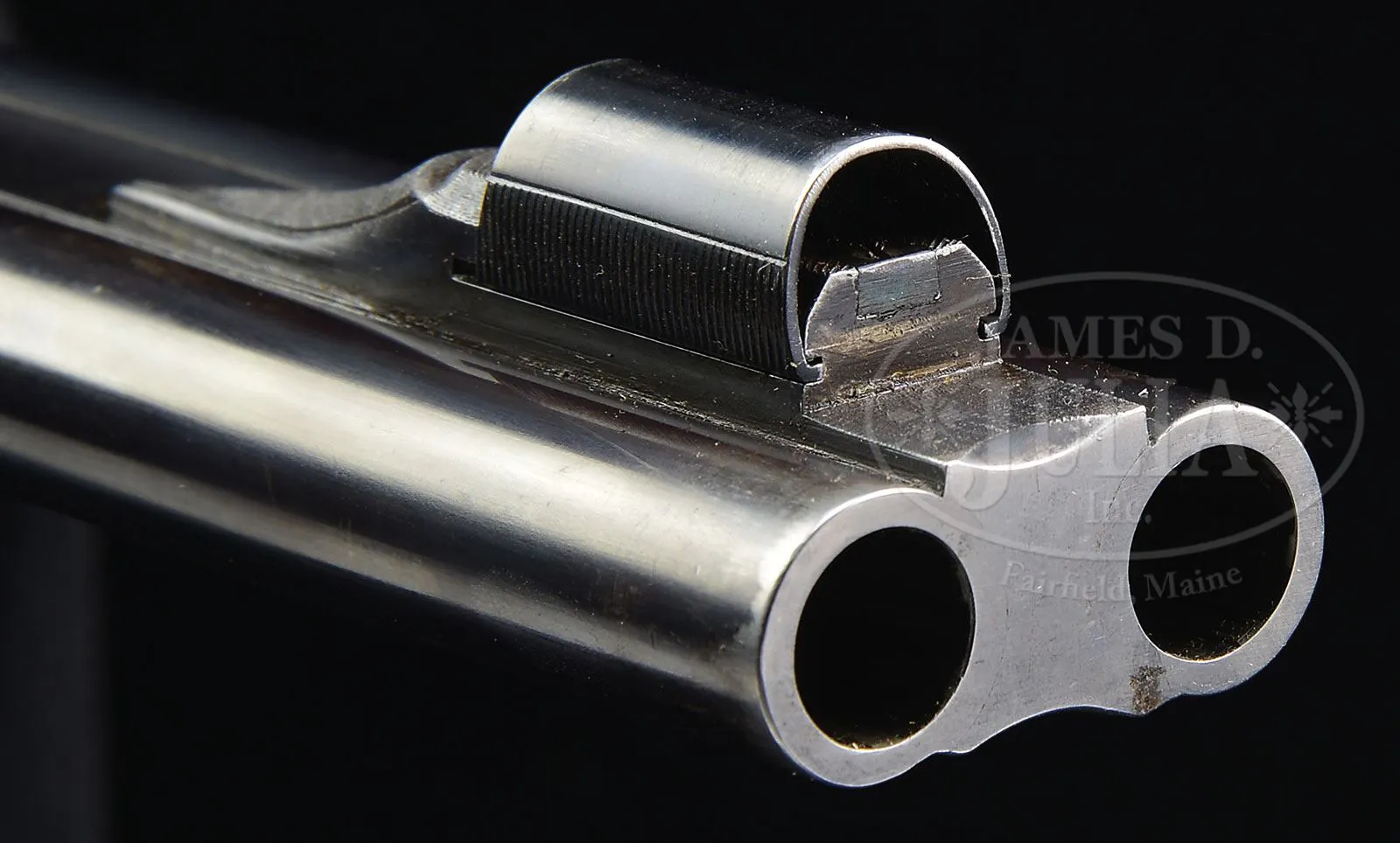 *VERY FINE HOLLAND & HOLLAND DOMINION SIDELOCK EJECTOR .465 H&H DANGEROUS GAME DOUBLE RIFLE WITH ORIGINAL CASE.SN 32002. (ca 1928) Cal. .500/.465 Nitro Express. 26″ Chopper lump bbls are fitted with file cut quarter rib and matching front sight base. Quarter rib is mounted with one standing, two folding leaf express sight with platinum lines marked for 100, 200, and 300 yards. Front ramp, with slip-on sight protector, holds fine small silver bead, and flip-up porcelain night bead. Mid rib is engraved “.465. Bore.” Tops of bbls are engraved “Holland & Holland” and “98. New Bond Street, London.” Bbl flats are stamped with London nitro proofs for 75 grains of cordite, and 480 grain bullet. Bottoms of bbls are stamped with SNs and “VICKERS STEEL”. Case hardened action features Purdey type hidden third fastener, non-automatic safety (SAFE inlaid in gold), top strap which extends over comb, bushed strikers, and double triggers. Front trigger is slightly “loose”, blade checkered. Action and lockplates are engraved with small scroll borders. “Holland & Holland” is at the center of each lockplate. “.465 BORE” “NITRO CARTRIDGE” “CASE 3-1/4 INCHES” is on bottom of action. Trigger guard has SN on tang, which extends to steel trap grip cap, with spare front sight in trap. Finely fiddle figured and lightly streaked European walnut capped pistol grip buttstock measures 14-1/2″ over NOSHOC pad fitted to orig curve. Stock features classic H&H style checkering, as well as, right hand cheekpiece with shadow line. A vacant silver oval and sling loop matching that on bottom of bbl, are on toe line. Matching splinter ejector forend has Anson release. Drop at heel: approx 3-3/16″, drop at comb: approx 1-7/8″. Weight: 10 lbs 11 oz. LOP:14-1/2″. Orig makers leather case has rectangular brass plate screwed to top marked “RICHARD. J. O’KEEFE”. Interior is lined in burgundy cloth and has gold embossed black leather H&H label, along with instruction label and charge card for this rifle in lid. Case contains 2-pc wood covered steel and brass cleaning rod with jag, horn handled striker key, bone striker bottle containing pair of strikers and marked in India ink “spare strikers 32002”, pair of snap caps, glass oil bottle with plated top with green label “Supplied by James Woodward & Co”, two boxes of Kynoch red and yellow cartridges, one soft nosed, the other solid, and a Holland marked box of soft nosed cartridges with yellow label. Along with 9 loose Kynoch rounds, as well as a black morocco leather wallet marked “465” with pull through cleaning equipment. Also included are 3 5-rnd boxes Kynoch solid and 3 5-rnd boxes Holland’s soft Elmer Keith’s .500/465 ammunition for this rifle. PROVENANCE: The Elmer Keith Estate Collection. CONDITION: Excellent, as found. Bbls retain 70% orig blue, silvering and thinning at muzzles, and above forend and action from normal handling wear. Action and lockplates retain approx 30% of their orig color hardening, faded and worn to bright silver, toning to gray. Top lever retains over 90% of its orig bright blue, silvered on thumbpiece. Trigger guard re-blued, and retains 80% of that blue. Stocks retain most of their orig hand rubbed oil finish with numerous light marks, more wear on forend, checkering lightly worn, again with more wear on forend checkering. Pad is relatively new, nicely fitted. Bores are brilliant with sharp rifling throughout. Action is tight. Bbls are slightly off face. Ejectors are in time. Case leather shows considerable scuffing on edges. Straps and handle are good. Interior cloth is good, with soiling and compressions. Accessories are fine. No. 2 grade rifles are exceptionally strong and highly regarded, this fine unmolested example would make a perfect safari rifle. 4-48023 MGM161 (30,000-50,000) – Lot 1047 Click here to view provenance