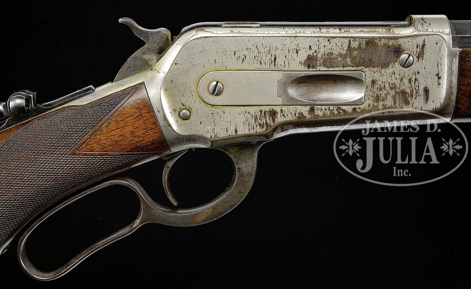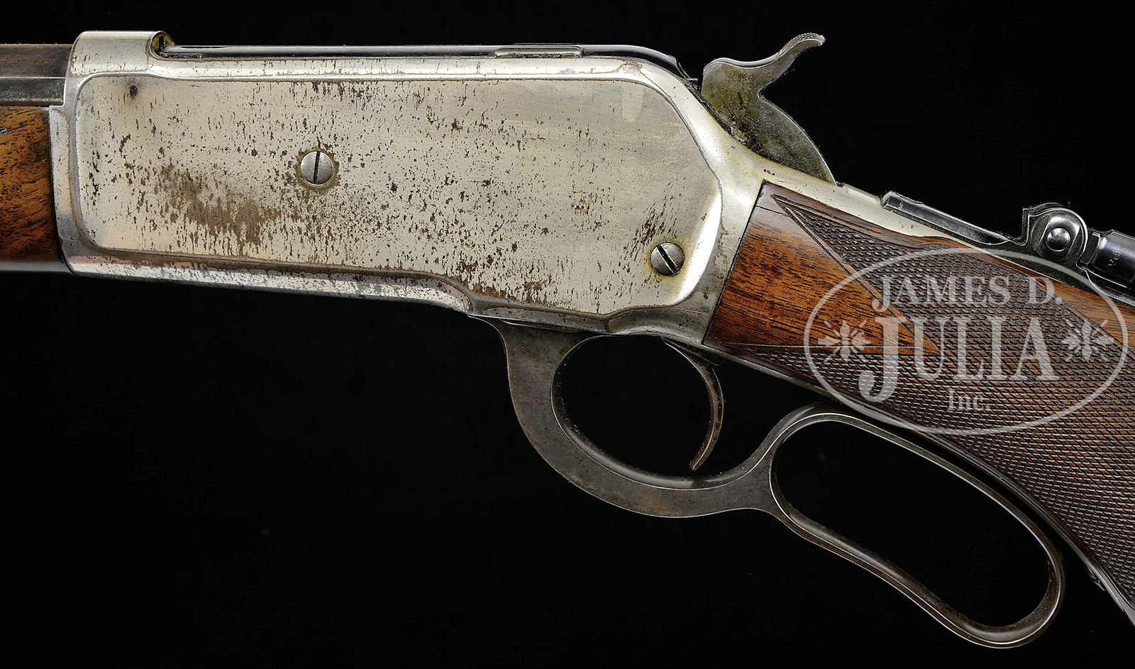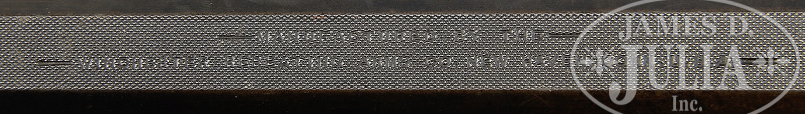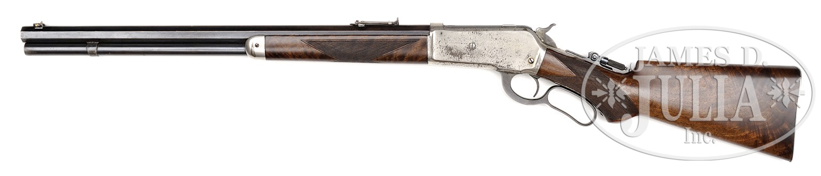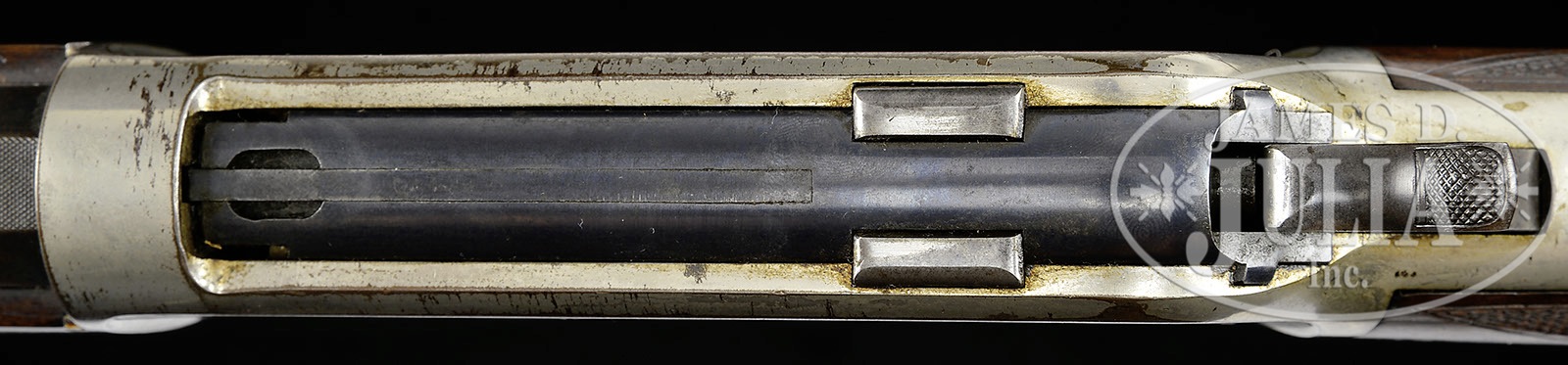 EXTREMELY RARE SPECIAL ORDER DELUXE WINCHESTER MODEL 1886 LEVER ACTION SHORT RIFLE.SN 10897. Cal. 45-70. Wonderful half nickel deluxe ’86 with rare 22″ heavy oct bbl, full magazine, gold washed Beach’s combination front sight, “1876” marked ladder rear sight and a Lyman combination tang sight. Top flat of bbl is fully matted with caliber marking on left top flat. Receiver, forend cap & buttplate are factory nickel finish. Mounted with 2-3X center crotch, flame grain American walnut with 8-3/8″ H-style checkered forearm and black insert serpentine grip buttstock that has smooth steel shotgun buttplate. Left side of lower tang is marked with assembly number “2890” and “XXX” with an “S”. The “S” signifies shotgun buttplate. Matching assembly number is also found in top tang channel of buttstock and inside toe of buttplate. Accompanied by a Cody Firearms Museum letter which identifies this rifle in caliber 45-70 with 22″ matted oct bbl, plain trigger, checkered stock with pistol grip, Lyman sporting sights, shotgun butt and half nickel. Received in warehouse Dec. 3, 1887 and shipped two days later to Order #1874. Early 1886 rifles with this many and unusual special order features are extremely rare. PROVENANCE: Tommy Rholes Estate Collection. CONDITION: Fine, all matching. Bbl retains about 85-88% orig blue mixed with light patina; magazine tube has a small cleaned spot and retains about 90% orig blue; receiver, overall retains 65-70% orig nickel turning milky; forend cap retains about 85% orig nickel and the buttplate is mostly polished metal with light pitting on the heel. Stock has a hairline back of top tang, otherwise wood is sound and retains a restored finish. Mechanics are fine, strong bright bore with scattered light pitting and a light ring about 1″ from muzzle. Altogether an extremely rare and desirable ’86 rifle. 4-50538 JR11 (20,000-30,000) – Lot 1048