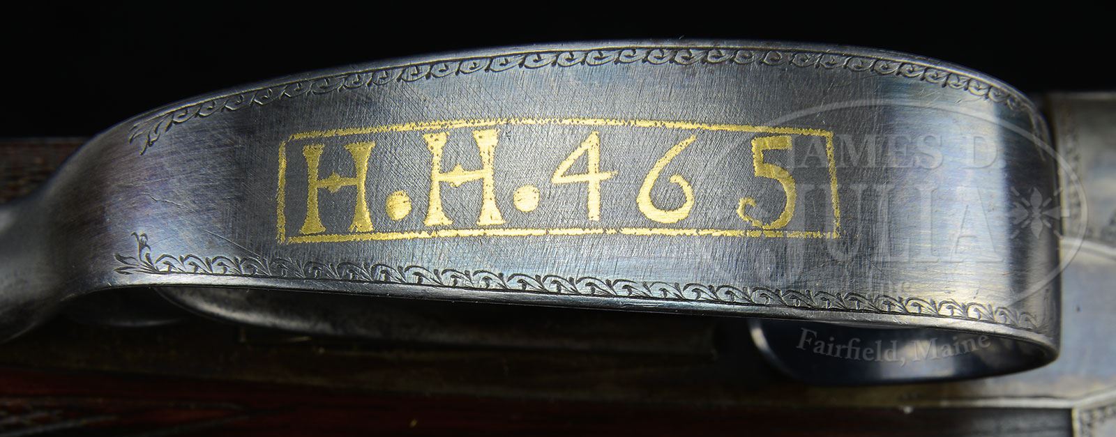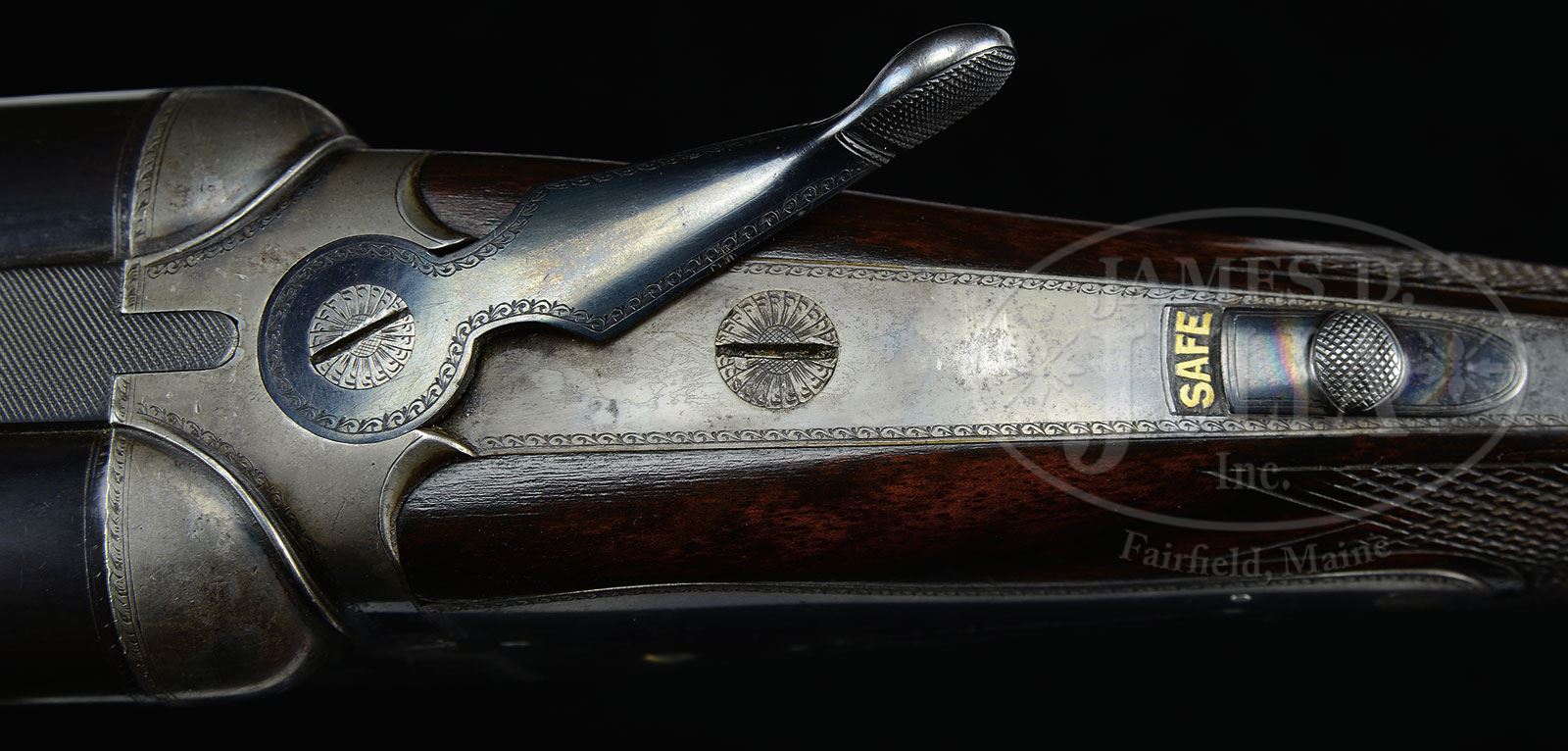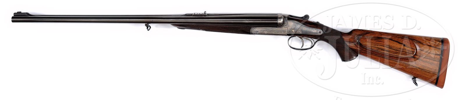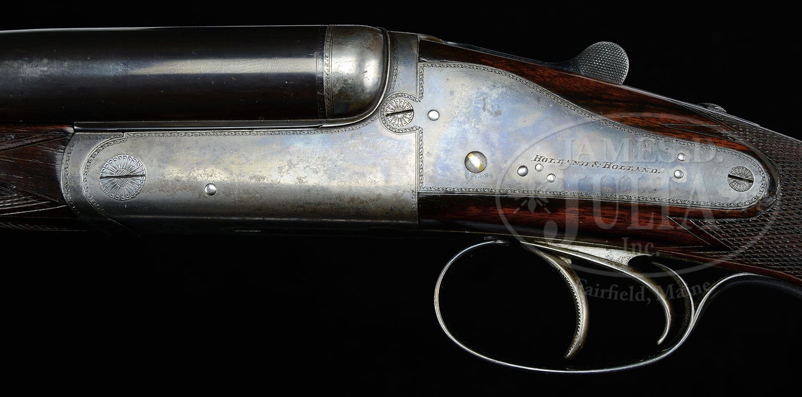 *HOLLAND & HOLLAND NUMBER 2 GRADE SIDELOCK DANGEROUS GAME DOUBLE RIFLE.SN 19127. (ca 1909) Cal. .500/465 Nitro Express. This grade later became known as the “Dominion”. It was a plain finished, but high quality and extremely strong, with a high reputation in Africa. This rifle has 26″ chopper lump bbls fitted with quarter rib, and front sight ramp that are file cut, and nicely filed. Quarter rib is fitted with one standing, two folding leaf express sight marked for 100, 200, and 300 yards. Front ramp is fitted with silver bead and flip-up moon bead. Tops of bbls are engraved “Holland & Holland. 98. New Bond Street, London.” and “Winners of All The “Field” Rifle Trials, London.” Bbl flats are stamped with London nitro proofs for .465 express, 75 grains of cordite, and 480 grain bullet. SN is stamped on broad flat splinter. A sling loop is soldered to bottom rib. Case hardened action fitted with back action sidelocks features long top strap which extends over comb, automatic safety (SAFE inlaid in gold), bushed strikers, sliding third fastener which engages rib extension, gold band tumbler end cocking indicators, and double triggers with front trigger “loose”. Lockplates are engraved “Holland & Holland”. Bottom of action is engraved “Charge” “75 Grains Cordite” “.465” “Case 3-1/4 Inches”. Action and lockplates have small scroll borders. Trigger guard is gold inlaid “H.H .465″ on bow. SN is on tang which extends to steel trap grip cap, which contains a pair of strikers. Flesh-toned circassian walnut buttstock is nicely streaked, and measures 14-1/4″ over Silver type pad, and features classic Holland & Holland right hand cheekpiece with broad transition to shadow line, and point pattern checkering with mullered borders. A vacant silver oval and a sling loop matching that on bbl, are on toe line. Matching splinter forend has forward pivoting release. Drop at heel: approx 2-3/4″, drop at comb: approx 1-3/4″. Weight: 10 lbs 15 oz. LOP: 14-1/4”. PROVENANCE: The Elmer Keith Estate Collection. CONDITION: Excellent, as partially refinished. Bbls retain most of an old glossy re-black over light pits, scratches, and marks, engraving and file cutting somewhat softened. Action and lockplates retain a considerable amount, perhaps 40%, orig case hardening color, locks somewhat stronger. Trigger guard retains perhaps 10% orig blue. Stocks retain nearly all of an old oil refinish, details and shadow line are softened, checkering re-cut. Borders have not been re-mullered. Bores are fine with strong rifling, dark in grooves toward breech ends. Action is tight. Top lever spring is broken, and action will not “snap”. This well balanced, fine handling rifle would make a great working rifle. 4-48028 MGM150 (25,000-35,000) – Lot 1048
