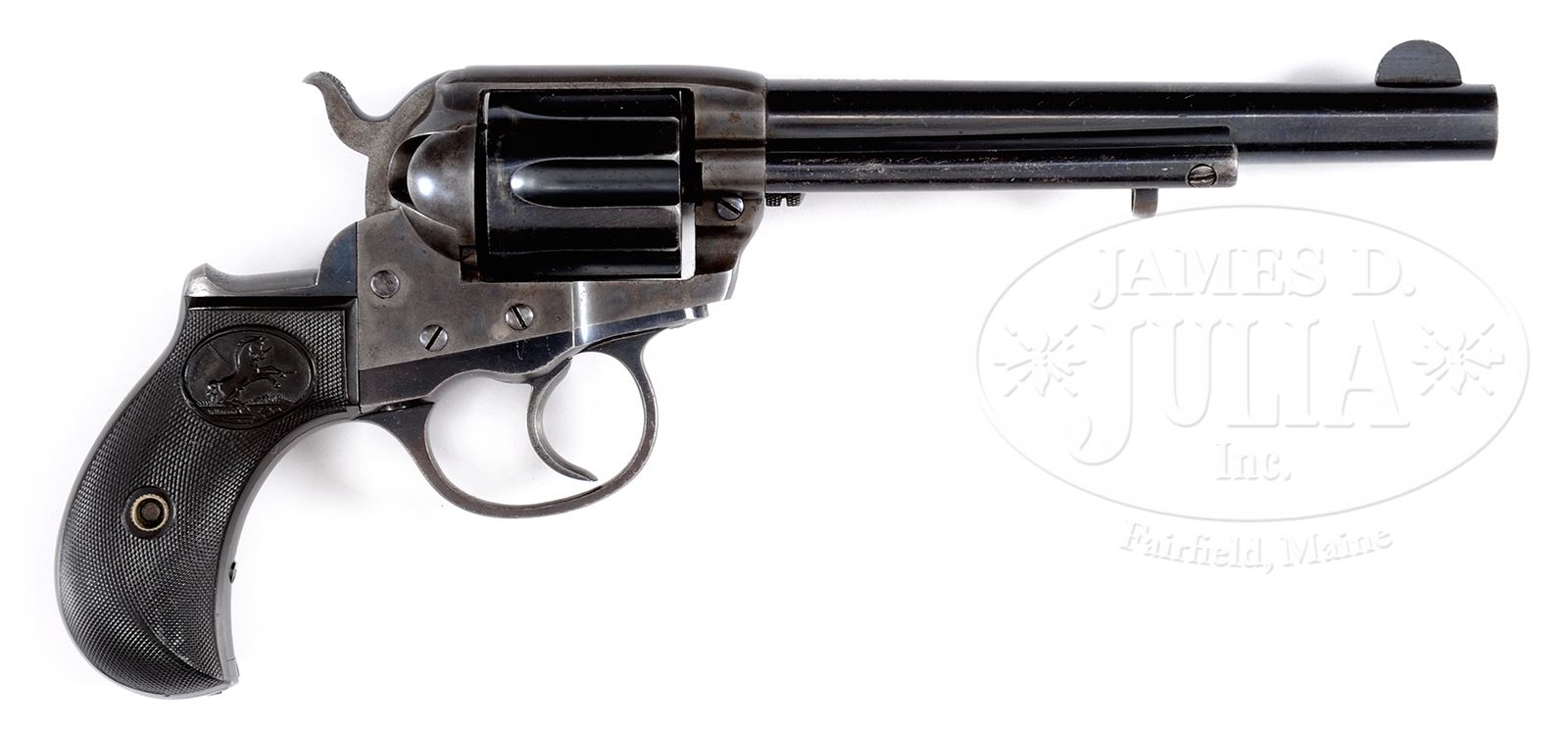 *COLT MODEL 1877 DOUBLE ACTION THUNDERER REVOLVER WITH RARE SIX INCH BARREL.SN 147701. Cal. 41. 6″ rnd bbl, blue and case color finish. Checkered hard rubber grips. SN’s on frame, trigger guard, backstrap all match. PROVENANCE: The Estate Collection of Phil A. Bleakney, Jr. CONDITION: Very good, bbl retains 50% bright blue blending with a plum patina, slight scratches and some muzzle wear. Front sight is full size. Bbl address is sharp, cal. mark is sharp. Bore is bright with some staining and strong rifling. Ejector rod shows 80% blue with high point wear. Cylinder retains 60% blue with scratches overall, no heavy pits, deep blue in flutes. Frame retains 60% muted case color with some vivid color in protected areas. Frame screws retain 50% blue. Trigger retains 50% blue. Hammer retains 30% blue in protected areas. Trigger guard and backstrap retain 30% blue blending with a pleasing plum patina. Grips are very good with some high point wear and a couple of minor dents. Mechanics function well. Nice Thunderer in a rare bbl length. 49059-98 TEP C&R (1,000-2,000) – Lot 1048