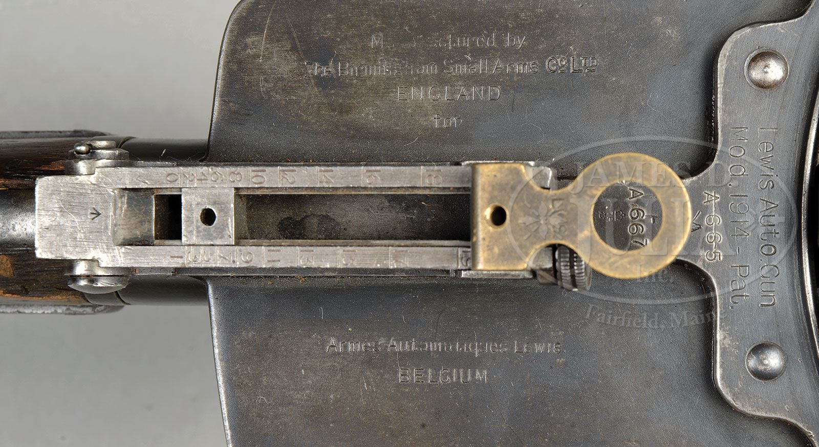 **LEWIS MODEL 1914 BY BIRMINGHAM SMALL ARMS COMPANY LTD.(C&R).SN A667. 303 British. 28″ bbl. This Lewis gun is marked with broad arrow proofs and is an arsenal renumber from SN 8226 to A667. Marked on rear of receiver “Manufactured by” / “The Birmingham Small Arms Co LTD” / “ENGLAND” / “for” / “Armes Automatiques Lewis” / “BELGIUM” just forward of rear sight marked “Lewis Auto Gun” / “Mod.1914-Pat.” Also displays British proof marks with broad arrow. Top of shroud and pan recess have orig struck through SN and current number. Included on this arm is a clamp on bipod with broad arrow proof, clamp on front anti aircraft sight and two 47 round pan magazines marked with broad arrow and British proofs. Oiler is present in buttstock. Bolt is arsenal renumbered to match rest of gun. Mechanism functions smoothly when operated by hand. This gun appears fully functional. PROVENANCE: The class III weapons formerly on loan to Evergreen Aviation & Space Museum. CONDITION: Overall finish and appearance is good to very good with about 50% finish remaining on metal parts thinning to gray patina with areas of bare metal.There is a 1/2″ ding to shroud at 10 o’clock position. Wooden stock has a floating 1″ x 1/2″ chip at right side base where it meets receiver hardwood. On other side of stock there is a corresponding size chip out of stock. There is also a small approximately 1/2″ chip out of top of stock where it meets receiver hardware. Stock retention screw has been replaces with a round head aluminum screw. Another floating wood chip at top left of stock where it meets receiver. There is also evidence of liquid wood being applied in these areas where chips have come off. Wooden hand grip is in very good condition with some bruises and handling marks. Pans retain about 70% of their finish worn to bare metal at high points, marked with British broad arrow proofs. Bore is shiny and bright with some slight frosting in grooves. Bolt face extremely fine. A good solid example of Lewis machine gun with an extremely fine bore makes this a very collectable gun. 4-51736 JWK37 (11,000-16,000) – Lot 1049