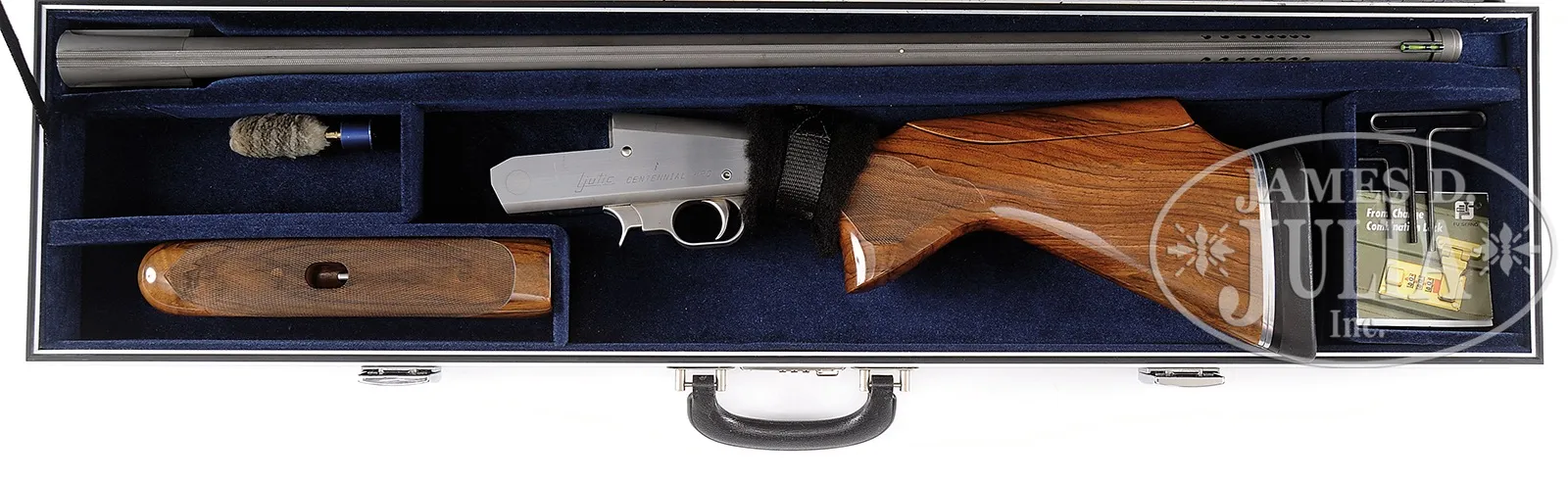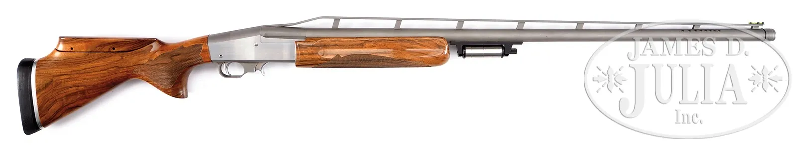 SN 25. Cal. 12 ga. 34″, 2-3/4″ chambers with forcing cones opened, custom ported, high vent rib, stainless steel bbl with interchangeable choke tube. Back-bore to modified choke. Adj. bottom mounted bbl weight. Extractor. Stainless steel machined receiver marked “LJUTIC CENTENNIAL PRO”. Release trigger. Straight grain, palm-swelled, futuristic pistol-grip stock with adj comb with 14-1/4 LOP over adj. black rubber pad. Factory LJUTIC Americase with few accessories. CONDITION: Gun in excellent mechanical condition. Scattered light handling marks on frame and wood. A solid, unique target gun with faux-ivory mid bead. 50973-6 FTL (3,000-4,000) – Lot 1049