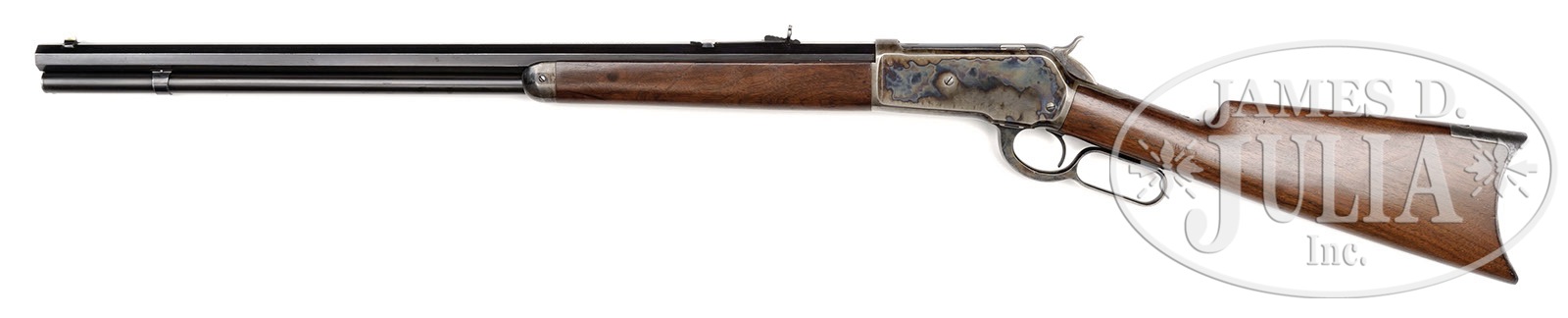 WINCHESTER MODEL 1886 LEVER ACTION RIFLE.SN 76393. Cal. 45-90. Standard grade rifle with 26″ oct bbl, full magazine, half nickel front sight and semi-buckhorn rear sight. Mounted with uncheckered nicely figured American walnut with straight stock & crescent buttplate. Accompanied by a Cody Firearms Museum letter which identifies this rifle in caliber 45-90 with oct bbl & plain trigger, received in warehouse March 7, 1893 and shipped June 5, 1894 to Order #14672. Standard grade rifles are substantially more common than deluxe & special order rifles but are rarely found with high orig finish. They were a working tool and usually saw hard service with little or no maintenance. The era of this rifle was when business & work were conducted from the back of a horse, wagon or buggy which necessitated these rifles being exposed continuously to hard service and the elements. PROVENANCE: Tommy Rholes Estate Collection. CONDITION: Extremely fine. Bbl & magazine tube retain 97-98% strong orig blue with a few small scattered spots of surface rust; receiver retains virtually all of its orig case colors, brilliant on sides and top, moderately to heavily faded on bottom; lever & hammer retain brilliant case colors on sides; right side of lever & outer faces are moderately faded; buttplate is faded to silver with brown patina. Wood is sound with a few scattered light nicks & scratches, shows dulling at carry point on forearm, otherwise the wood retains about all of its strong orig factory finish. Mechanics are crisp, bright shiny bore. 4-50622 JR12 (12,500-17,500) – Lot 1050