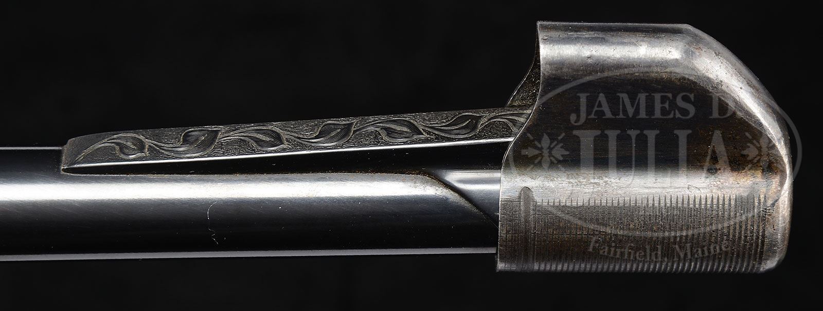 *FINE HOLLAND & WOODWARD PATENT H&H SINGLE SHOT CUSTOM RIFLE.SN 24-189. Cal. .30/40 Krag. This unusual rifle was re-barreled by Elmer Keith in .30/40 Krag utilizing the orig one standing, four folding leaf express rear sight. 26-1/2″ Tapered round bbl is also fitted with banded-on sling eye, and front ramp mounting sourdough bead. Orig muzzle protector is present. Blued Holland & Woodward action features non-automatic tang safety (SAFE inlaid in gold), with top tang fitted with flip-up screw adjustable aperture sight. Both sides of action are engraved “HOLLAND & HOLLAND” and “Patent 17578″ within double line borders with small flourishes at ends. Right side of action is fitted with mechanism dis-assembly pin. SN is at rear of trigger guard. Orig Holland & Holland well streaked European walnut steel trap capped pistol grip buttstock measures 13-5/8” over serrated horn buttplate, and features classically shaped H&H shadow line right hand cheekpiece, point pattern checkering with mullered borders, and with a sling eye as well as a silver oval engraved “ELMER KEITH” on toe line. Long schnabeled forend attaches to bbl with a screw through diamond shaped steel escutcheon. Removal of forend reveals SN on face of action, and no bbl makers marks. Drop at heel: approx 2-7/8″, drop at comb: approx 1-15/16″. Weight: 7 lbs 10 oz. LOP: 13-5/8″. PROVENANCE: The Elmer Keith Estate Collection. CONDITION: Excellent, as custom finished. Metal parts retain essentially all of their blue. Orig Holland buttstock has sharp edges slightly rounded, and retains nearly all of a fine rubbed oil finish, checkering re-cut. New forend is essentially as new, with a few light handling marks. Bore is excellent. Action is smooth and crisp. These highly regarded Holland actions are quite scarce, with approx 200 ever made. 4-47969 MGM138 (8,000-13,000) – Lot 1050