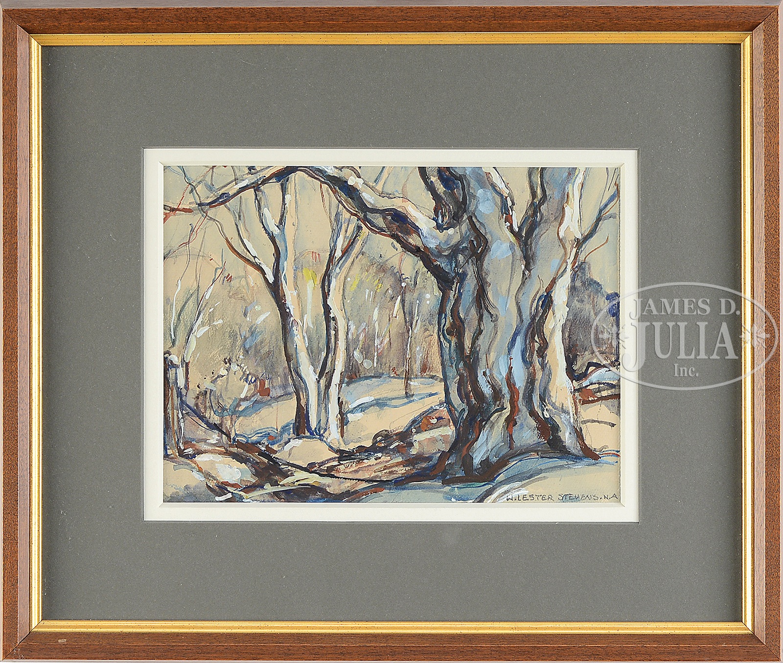 WILLIAM LESTER STEVENS (American, 1888-1969) “PRIVATE BACKROAD”.Watercolor and gouache on paper Housed in a wood frame with gilt liner, and matted under glass Signed in pencil lower right “W. Lester Stevens.N.A.”, titled on label affixed to the reverse SIZE: Sight: 7-1/2″ x 10-1/4″. Overall: 15″ x 18″ CONDITION: Very good, not examined out of frame. 49972-5 (600-900) – Lot 1051