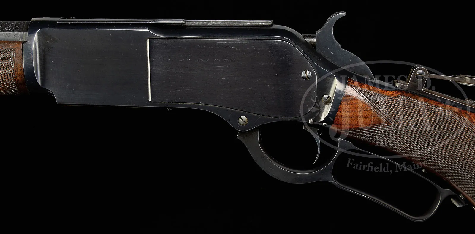 EXTREMELY RARE WINCHESTER MODEL 1876 ONE OF ONE THOUSAND LEVER ACTION RIFLE.SN 3551. Cal 45-75. Most rare of the 76’s this fabulous one of one thousand has 30″ oct bbl, full magazine, gold washed Beach’s combination front sight with an “1876” dated rifle ladder rear sight. Mounted with extremely, beautiful, XXX checkered American walnut with early style pattern on forearm and serpentine grip cap on buttstock with fleur-de-lis ebony inlay and a replacement hard rubber buttplate embossed in intertwined letters “SRCo.” (Sharps Rifle Co.). Top tang is mounted with a Sharps style sporting tang sight with 3-1/2″ staff. Bbl is engraved in typical one of 1,000 style with foliate arabesque patterns on top & side flats over chamber area and inscribed in script on top flat “One of One Thousand”. There is also a narrow silver band at the receiver. Muzzle is engraved to match on top three flats and side flats, also with an inlaid silver band. Left side of lower tang under the wood is stamped “XXX” with the assembly number “160” which has been X’d out with the additional assembly number “89” further to the right. Top tang channel of buttstock is stamped with an “S” and the assembly number “160”. Top flat of bbl, forward of the engraving and top of receiver ring, are stamped with the Winchester “WP” proof in a circle signifying that this rifle was returned to Winchester and proof tested after about 1904. Top of receiver has a 2nd model attached dust cover rail with impressed thumb print dust cover. Fitted with a single set trigger. Accompanied by a Cody Firearms Museum Records Office work sheet which identifies this rifle with 30″ oct bbl, set trigger, pistol grip stock, case hardened receiver and “one of one thousand”. It was received in the warehouse May 20, 1878 and shipped June 19, 1878 to Order #11781. There is an additional notation “CH 6/14/78”. There is no indication as to what the “CH” stands for. Previous informaiton disclosed that this rifle was, at one time accompanied by a 10-page letter from noted researcher, historian & author, R.L. Wilson detailing much of the above information. He additionally states that during his research for his book “Winchester The Golden Age of American Gunmaking 1 of 1000”, he discovered that of the 63,871 Models 1876 produced there were only 51 made as a one of 1,000. This rifle was discovered by Universal Studios as part of their promotion for the Jimmy Stewart movie, “Winchester 73”, when they offered a new Winchester Model 94 rifle to the first twenty owners of authentic One of 1,000 rifles who contacted them with proof of ownership. During this promotion the movie studio located twenty three Models 1873 and six Models 1876 One of 1,000 rifles. The owner of this rifle, Mr. Robert Steele Withers of Liberty, Missouri, in a letter to Mr. Bill Depperman, Washington, D.C., dated May 23, 1950, described his Winchester One of 1,000, which turned out to be an authentic specimen which earned him a free Winchester Model ’94. In his letter Mr. Withers states that he inherited this rifle from a deceased neighbor. He also states that he had sent it to “the Winchester Company with instructions to put it in perfect condition”. He further states that the gentleman who bequeathed it to him had traded for this rifle while he was recuperating from tuberculosis in Tombstone, AZ. In a second letter dated June 10, 1950 Mr. Withers identifies the neighbor as Claude Hardwick of Liberty, MO and reiterates his sending it to Winchester for restoration and what he was told the Winchester records contained. Mr. Wilson states that this rifle, being an early 2nd Model with 4-digit serial number, is of substantial importance as very few are known in this range. Mr. Wilson also states that the bottom of the bbl is marked with the serial number as is the breech end of the magazine tube. The last two digits of the serial number are on the carrier, carrier arm & lever while the hammer & dust cover are marked “89”, which is the assembly number found on lower tang. The sideplates are marked “57” which was X’d out and the number “89” stamped adjacent. No attempt was made at disassembly to verify these statements. Also accompanying this rifle are copies of Mr. Withers’ letters mentioned above along with a copy of a notarized statement dated 1952 wherein he is certifying that he is the owner of this rifle and reiterates its history. There are several other copies of letters between Mr. Depperman & Mr. Withers, a Mr. Andre from Winchester to Mr. Withers and several other pieces of correspondence. It is believed that in the early 1950’s when Mr. Withers returned his rifle to Winchester for refurbishing that they were no longer doing color case hardening so it was given a full blue treatment, including receiver, lever & hammer. It was very likely at this time that the proof marks were stamped on the bbl & receiver. This rifle is pictured and described on pages 100-101 of The Story of The Winchester 1 of 1000 and 1 of 100 Rifles, Lewis. The text surrounding this rifle in the book reiterates some of the above information. This rifle is listed by SN in the chart on page 89 of referenced publication. This listing also shows that order number “11781” had 4 other Models 1876 1 of 1000 rifles with the other 3 serial number’s being 750, 4771, 4772. The listing on page 26 of the referenced publication also shows that order “11781” additionally had 4 Models 1873 1 of 1000 rifles whose serial numbers were 30160, 30161, 30162 & 30180. PROVENANCE: Robert Steele Withers Collection; Claude Hardwick; John Fox Collection. CONDITION: Very fine plus. Overall retains about 99% strong factory blue with only the most faint sharp edge wear. Wood is sound with forearm retaining about 20% orig varnish and the checkering showing moderate wear. Buttstock has a couple of gouges on left side with other light nicks & scratches and