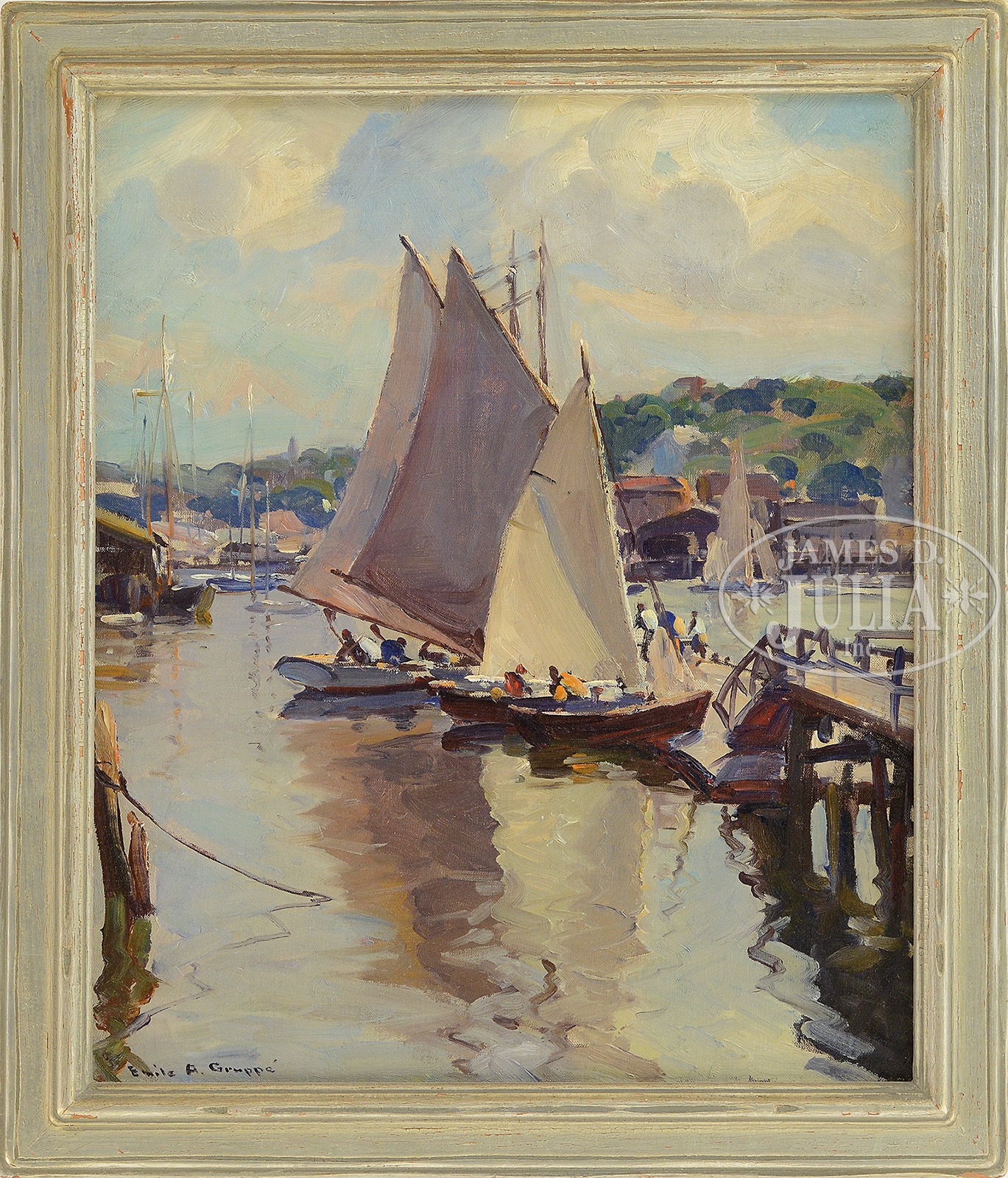 EMILE ALBERT GRUPPE (American, 1896-1978) BICKFORD’S WHARF, GLOUCESTER.Oil on canvas circa 1930’s Housed in its original silvered wood frame Signed lower left “Emile A. Gruppe” SIZE: 24″ x 20″. Overall 28″ x 24″ CONDITION: Very good 51394-2 (6,000-9,000) – Lot 1053