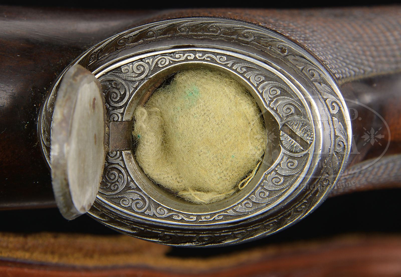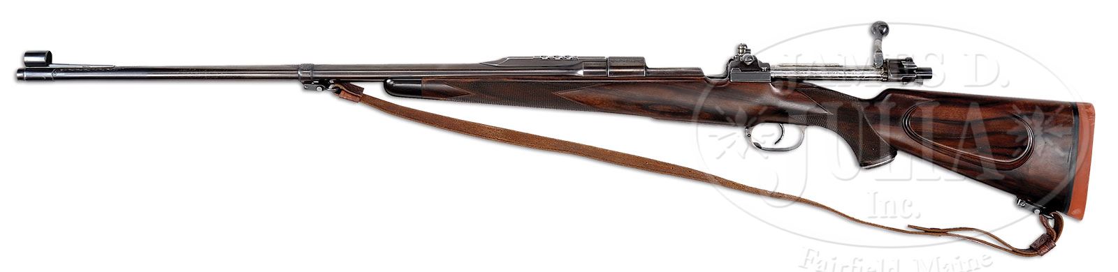 *EXCEPTIONAL KORNBRATH ENGRAVED AND GOLD INLAID HOFFMAN ARMS MAGNUM MAUSER DANGEROUS GAME RIFLE.SN 361. Cal. .404 Jeffery. 26″ Lightweight tapered round bbl is fitted with quarter rib, banded-on sling eye, and banded-on streamlined front ramp. Top of bbl is engraved “HOFFMAN ARMS CO ARDMORE, OKLA. 361”. Caliber is engraved at left rear. There are also triangles of well cut shaded scroll either side of sling eye band, and behind rear sight ramp. Stippled quarter rib is fitted with three folding leaf express sight marked for 100, 200, and 300 yards. A sourdough bead is in front ramp, which has heavy steel protector. Orig Mauser square bridge magnum length commercial action has stippled top of receiver ring, flanked by scroll engraving. A Redfield receiver sight has been fitted with staff let into square bridge. Bolt body is damascened. Pear shaped knob is slightly turned back. Flag of safety is gold inlaid “SAFE”. Drop box bottom metal has hinged floorplate retained by button in trigger guard bow. Trigger guard and floorplate are exceptionally well engraved (Kornbrath), with semi-relief shaded scroll, having relief geometric borders. This fine engraving surrounds a relief gold inlay of mountain goat in mountains, as central medallion on floorplate. Trigger guard bow is gold inlaid with monogram “LCU” (?). Steel grip cap with trap is also engraved matching bottom metal with portrait of bear looking back over its shoulder on trap cover (a classic Kornbrath motif). Trap contains two spare front sight beads. Dark and dense, finely streaked and marbled European walnut stock measures 13-1/4″ over red Old English pad, and features double beaded Whelen type right hand cheekpiece, horn forend tip, and classic point pattern checkering with mullered borders at grip and forend. A tooled leather carrying sling in Super Grade type swivels, is included with rifle. Drop at heel: approx 2-7/16″, drop at comb: approx 1-5/8″. Weight: 9 lbs 4 oz. LOP: 13-1/4″. PROVENANCE: The Elmer Keith Estate Collection. Page from 1977 GUN NOTES where Elmer states “Ross Seyfried and I worked up loads in my fine Hoffman Mauser using CCI magnum primers and the 400 grain Kynoch or the 400 grain RWS bullets with 85 grains of Hodgdon’s 4831 powder. Also Keith is photographed in HELL I WAS THERE p. 186, he is holding a Hoffman rifle, but it doesn’t appear to be this one. CONDITION: Exceptionally fine, retaining approx 90% orig blue on all metal parts, silvered on sharp edges from normal handling. Stock retains nearly all of its orig rubbed oil finish with some added oil at butt after installation of new pad. Checkering is only slightly worn, and is crisp. Bore is excellent, bright, sharp, and shiny throughout. Action is smooth. A truly exceptional magnum Hoffman. 4-48029 MGM148 (15,000-25,000) – Lot 1055 Click here to view provenance