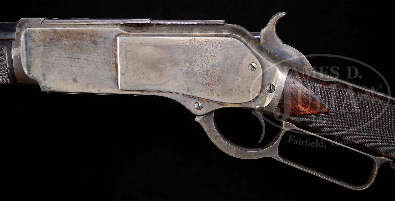 SCARCE SPECIAL ORDER WINCHESTER 2ND MODEL 1876 DELUXE LEVER ACTION RIFLE.SN 7480. Cal 45-60. Beautiful Deluxe ’76 with 28″ oct to rnd bbl, button magazine, Beaches combination front sight, missing its horizontal bead and 1876 marked rifle ladder rear sight. Top flat of bbl has standard 2-line address with caliber marking over the chamber. Receiver is 2nd type with attached dust cover rail & impressed thumbprint dust cover. Mounted with 3X – 4X flame grain American walnut with early style checkered forearm that has matching figure and straight stock with smooth steel shotgun buttplate. Left side of lower tang, under the wood is marked with the assembly no. “3078”. Matching assembly no. is found in top tang channel of buttstock. Accompanied by a Cody Firearms Museum letter which initially identifies this rifle with rnd bbl, plain trigger, “LID”, received in warehouse January 28, 1880, “Changed to 45-60 Caliber, 1/2 Oct, Plain Trigger, 1/2 Magazine, Casehardened, Checkered Stock, Globe & Beach sights”, shipped June 7, 1880 to order no. 20301. The word “LID” refers to the dust cover. Apparently this rifle had been a first model with open top receiver and the rail & dust cover were added at the customer’s request. Obviously, from the letter, this rifle was converted to its current configuration before it ever left the factory and therefore can be considered factory original. CONDITION: Fine to very fine, all matching, buttplate is unnumbered but absolutely original to this rifle. Bbl retains 92-93% orig blue with some fine surface freckling, muzzle end and sharp edge wear. There is a series of small dings on the right side of chamber area. Receiver & side plates retain about 60% orig case colors mostly turned silver on the right side, stronger on the left side and brilliant around the trigger and on bottom tang. Hammer retains about 80% fading case colors and the lever about 30% with the balance turned silver. Forend cap retains virtually all of its orig bright case colors. Wood is sound with light nicks & scratches, a series of small bruises in the forearm checkering and overall retains most of its orig factory finish. Mechanics are crisp, very bright shiny bore. 51691-1 JRL (16,000-25,000) – Lot 1056 Click here to view provenance