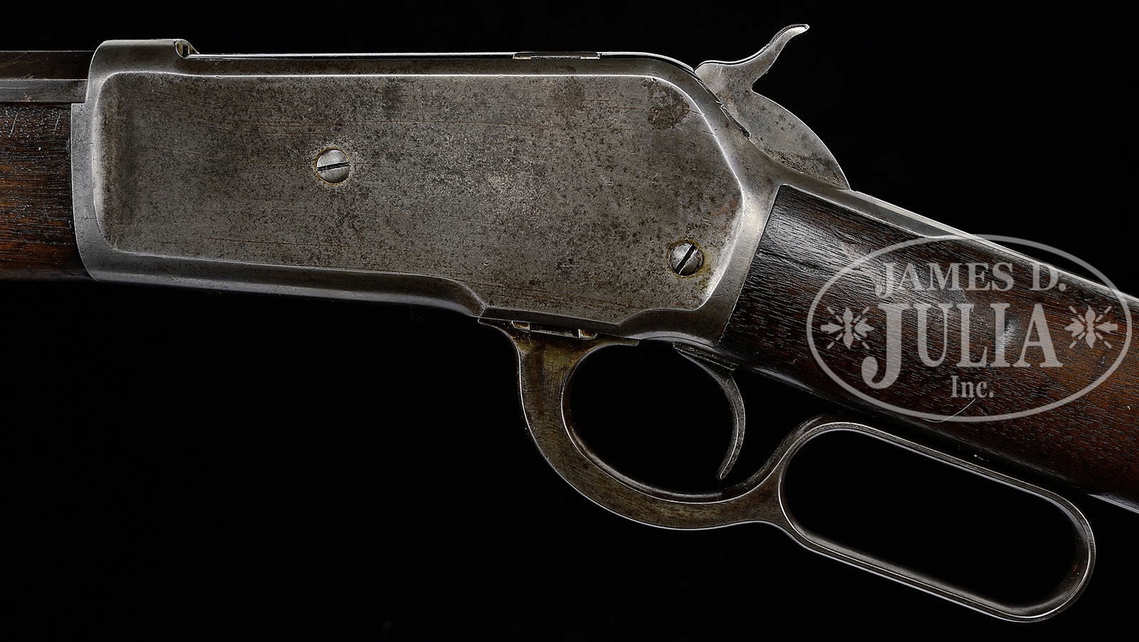 SN 73344. Cal. 45-90. Standard grade rifle with 26″ bbl, full magazine, half nickel front sight & semi-buckhorn rear sight. Mounted with uncheckered, slab-sawed American walnut with straight stock & crescent buttplate. Accompanied by a Cody Firearms Museum letter which identifies this rifle in cal. 45-90 with oct bbl and plain trigger, received in warehouse Dec. 17,1892 and shipped Oct. 28,1893 to order number 3063. At the time this rifle was made the west was still wild and hunting & self-protection were a way of life. Arms of that era usually saw very hard service and are rarely found today with high orig finish. PROVENANCE: Tommy Rholes Estate Collection. CONDITION: About good. Traces of orig finish remain in the most sheltered areas, generally being a smooth gray metal patina; stock has a grain check on the left side, otherwise wood is sound with normal handling and use marks, shows heavy wear with a hand worn patina. Mechanics are fine; strong bright bore with a few scattered small spots of pitting. 4-50584 JR307 (2,500-4,000) – Lot 1057