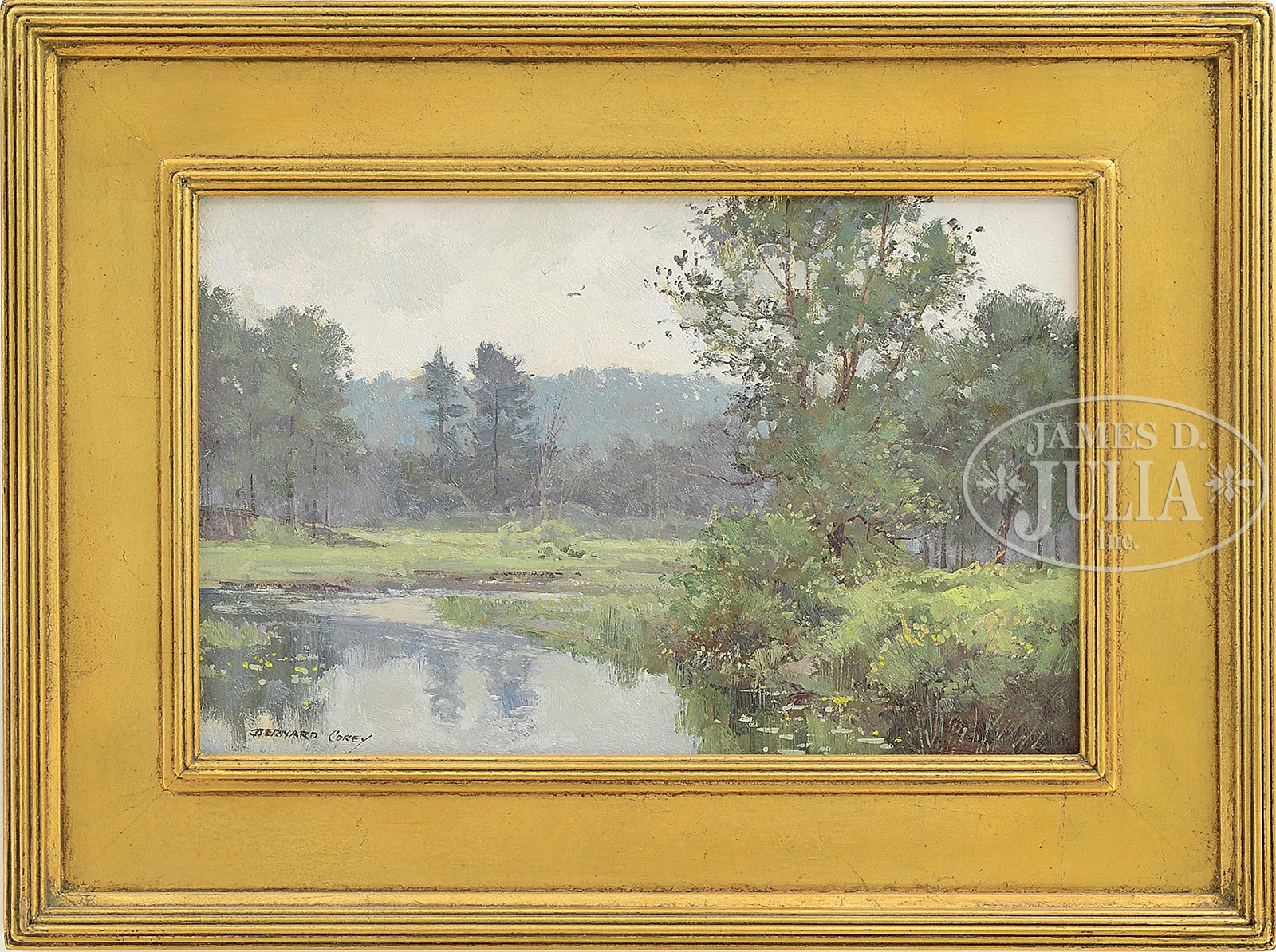 BERNARD COREY (American, 1914-2000) “SUMMERS REST”.Oil on Masonite Housed in a contemporary giltwood frame Signed lower left “Bernard Corey” SIZE: 9″ x 14″. Overall: 14-1/2 x 19-1/2″ CONDITION: Excellent 49972-2 (800-1,200) – Lot 1058
