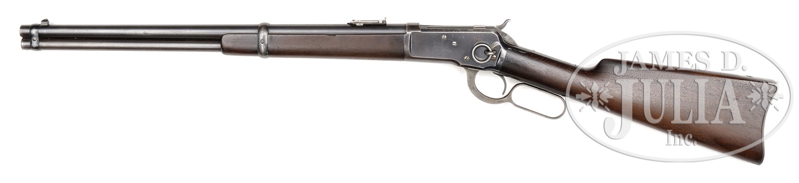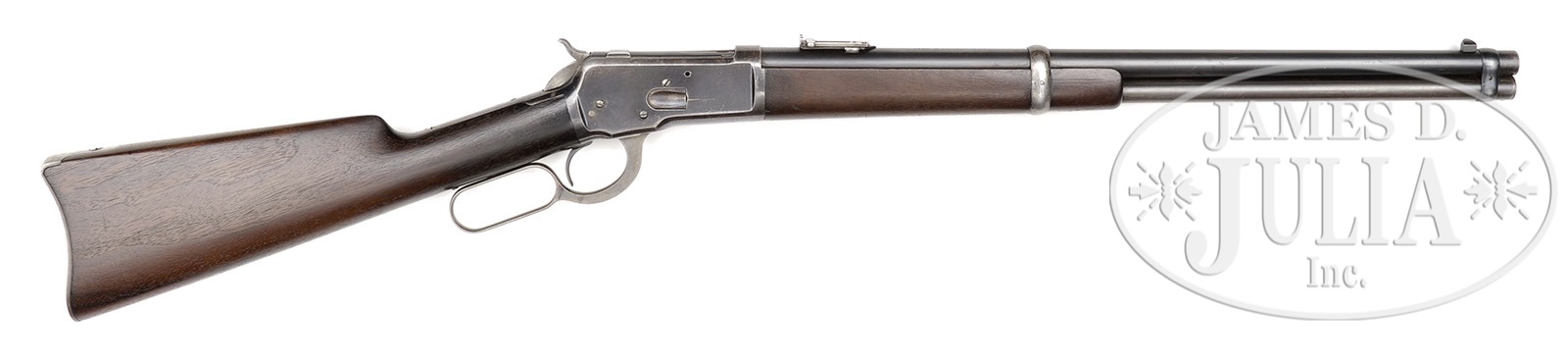 RARE FIRST MONTH OF PRODUCTION WINCHESTER MODEL 1892 SADDLE RING CARBINE.SN 2624. Cal. 44 WCF (44-40). Standard grade carbine with 20″ bbl, full magazine, barleycorn front sight and 1873 marked, 900-yd carbine ladder rear sight. Left side of receiver has a staple & ring. Mounted with uncheckered, slab sawed American walnut with straight stock & carbine buttplate. Bbl band is thick 1866-73 style. Early ’92 carbines are one of the more difficult Winchester arms to find in orig configuration with orig finish. These light, quick little carbines were instantly adopted for use on horseback & throughout the Western frontier. They usually are found in near relic condition, so to find such an early one with orig finish & in shootable condition is a rarity. PROVENANCE: Tommy Rholes Estate Collection. CONDITION: Fine to very fine. Bbl & magazine tube retain about 90-92% orig finish, turned a little dull on the bbl with a couple small scratches & turning slightly plum on the magazine tube. Front band retains about 95% orig blue & the forearm band about 40% thin blue. Receiver retains about 90% orig blue, strong on the sides & receiver ring, faded on the top rear edges & thinning on the belly. Top tang is mostly a blue/brown patina. Hammer retains moderately faded case colors & the lever traces of colors. Buttplate is a gray metal patina. Wood is sound with a few light nicks & scratches, a couple of bruises and overall retains a wonderful, smooth hand worn patina. Mechanics are crisp. Bright, shiny bore with a few scattered spots of pitting. 4-50557 JR61 (7,000-10,000) – Lot 1059