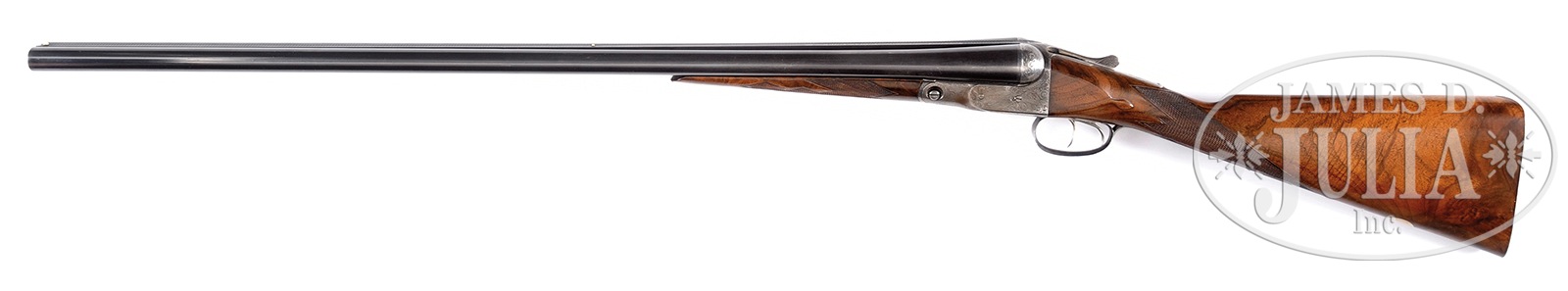SN 158569. Cal. 12ga. Chambers 2-3/4″, 32″ Titanic Steel bbls, concave matted rib with twin beads. “3” frame. Chokes FULL/FULL. Splinter type forend. DH engraved ejector frame with game dog scenes engraved both sides, a four duck scene engraved on floorplate and balance of DH style scroll work Dbl triggers. Straight grip, skeleton buttplate. Blank initial oval on toe line. 14-1/2″ LOP. DAC 1-5/8″, DAH 2-3/4″. Gun has no safety. PROVENANCE: The Collection of Jim Beckley. CONDITION: Very good. Bbls retain 80% of their blue finish with thinning towards breech end from carry. Several minor dings which do not seem to appear inside. Repair to forend lug which appears sound. Bbls ring nicely. Bores are bright with slight pitting and evidence of polishing. Strong DH markings. Receiver has faded back to a gun metal grey with slight color in protected areas. Some screws marred and several replaced. Stock and forend exhibit very nice color and pronounced grain. Both buttstock and forend have had professional refinish. Checkering is slightly smooth. Right side of stock where it joins the receiver and top tang has been pinned and repaired with a professional restoration. Both top tang and trigger bow tang sit proud of wood. Butt checkering has been refreshed. Skeleton buttplate gun metal grey with worn engraving. Forend checkering is lightly worn yet very nice. Top lever at center. Gun is tight, ejectors are strong. Operates crisply. A very unusual “3” frame, 32″, straight grip, no safety Parker which will impress. 50633-1 TJW (2,500-3,500) C&R – Lot 1060