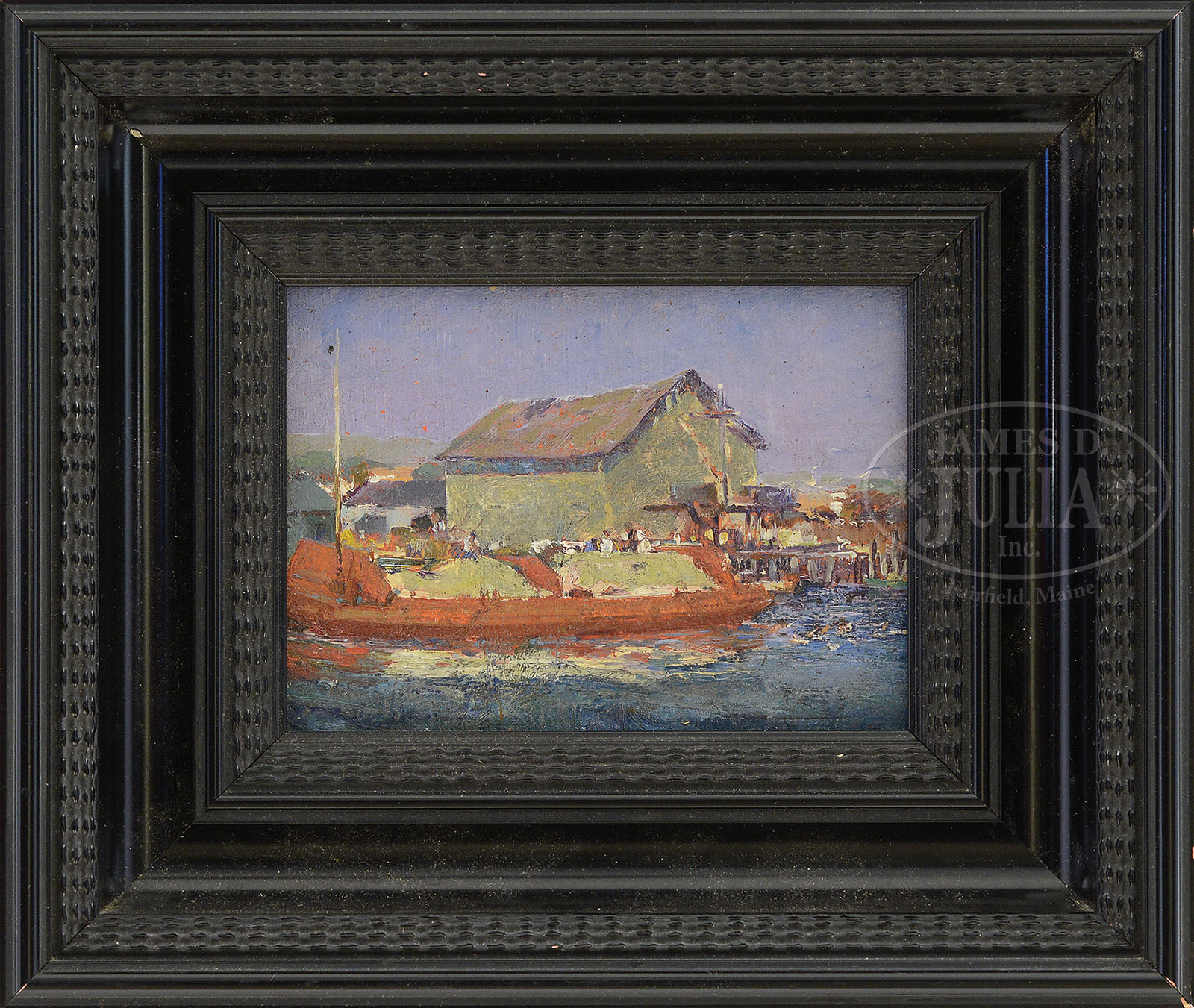 HAYLEY LEVER (American, 1876-1958) DOCK SCENE.Oil on cigar box Housed in a modern ebonized wood frame Signed on verso “Hayley Lever”, panel stamped “LA Libertad Juniors” SIZE: 4-1/4″ x 6″. Overall 9-1/4″ x 11″ CONDITION: Good with vertical craquelure and minor flake losses 52099-33 (1,000-2,000) – Lot 1061