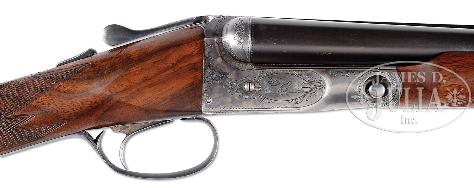 Please Note: The beavertail forearm has been replaced. *RARE PARKER GHE SHOTGUN NICELY OPTIONED.SN 241294. Cal. 20 ga. 30″ bbls, marked 2-3/4″ chambers, MOD/IM chokes. Twin bead sights, concave matted rib. Beavertail forend. GH ejector receiver “O frame”. Left side engraved with two ducks in flight. Right side engraved with two quail. Floorplate engraved with two pheasants. “Parker” engraved on bottom of frame. Crisp screws. Single selective trigger. Straight grip with 3 point checkering. Highly figured marble cake walnut buttstock. Solid red “Noshoc” pad. Initial shield in toe line. LOP 14″, DAC 1-1/2″, DAH 2-1/8″. Safety immobile. PROVENANCE: Remarkable William Larkin Moore Private Estate Collection of Fine Sporting Arms. CONDITION: Excellent. Bbls retain most blue which is starting to tone. Wear at muzzles. Slight peppering oxidation at front 7″ of left bbl. Bright unpitted bores. Receiver retains a majority of faded case color with most loss at carry area. Trigger bow bright blue, showing light wear. Stock and forend have been professionally refreshed, checkering enhanced. Top lever right. Gun is tight, operates crisply, strong ejectors. Uniquely configured GHE with tons of eye appeal. 50595-10 TJW (5,000-8,000) C&R – Lot 1062