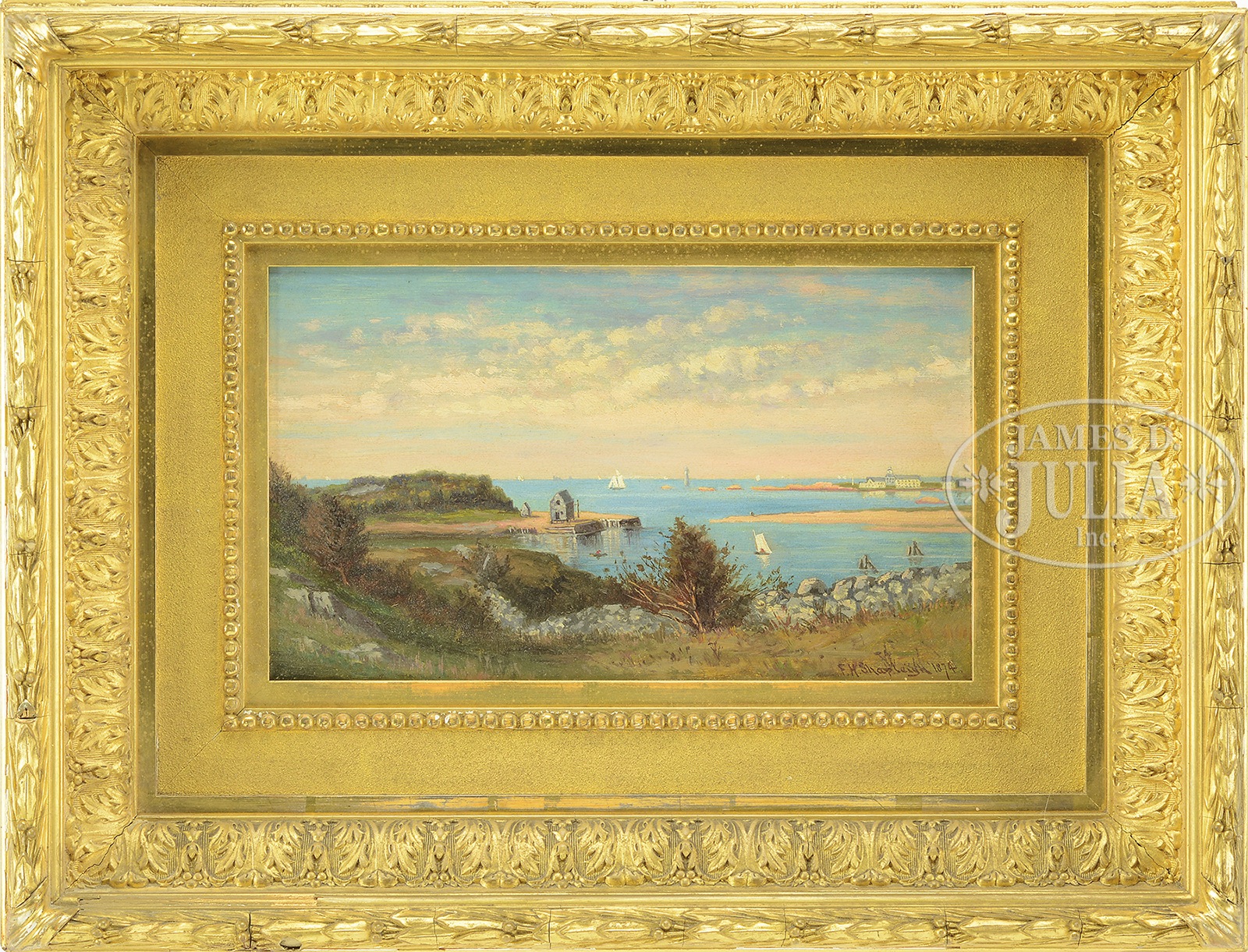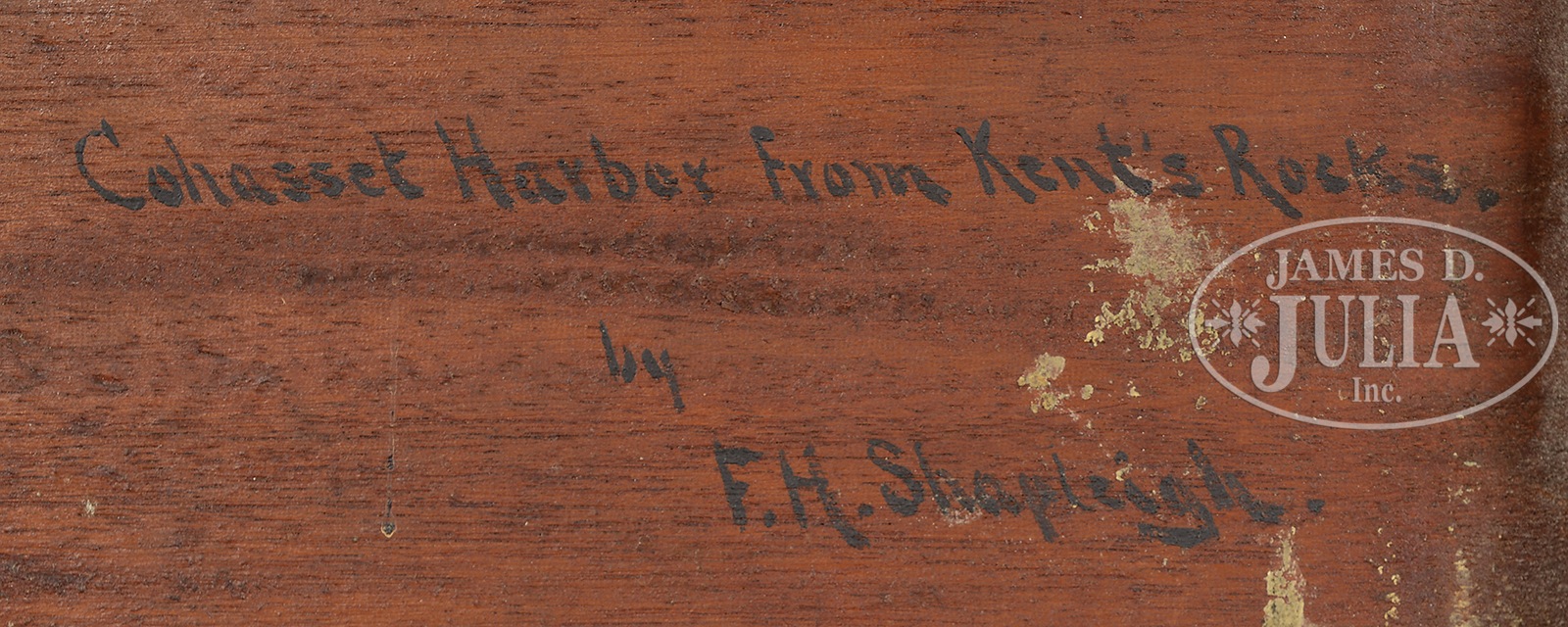 FRANK HENRY SHAPLEIGH (American, 1842-1906) “COHASSET HARBOR FROM KENT’S ROCKS”.Oil on panel Housed in a Hastings & Davenport carved wood gilt gesso frame Signed and dated lower right “F.H. Shapleigh 1874″, signed and titled on verso SIZE: 8″ X 12-1/2”. Overall: 16-1/4″ x 21-1/2″ CONDITION: Very good. Frame has minor loss to upper right back corner 9-94869 (10,000-15,000) – Lot 1063