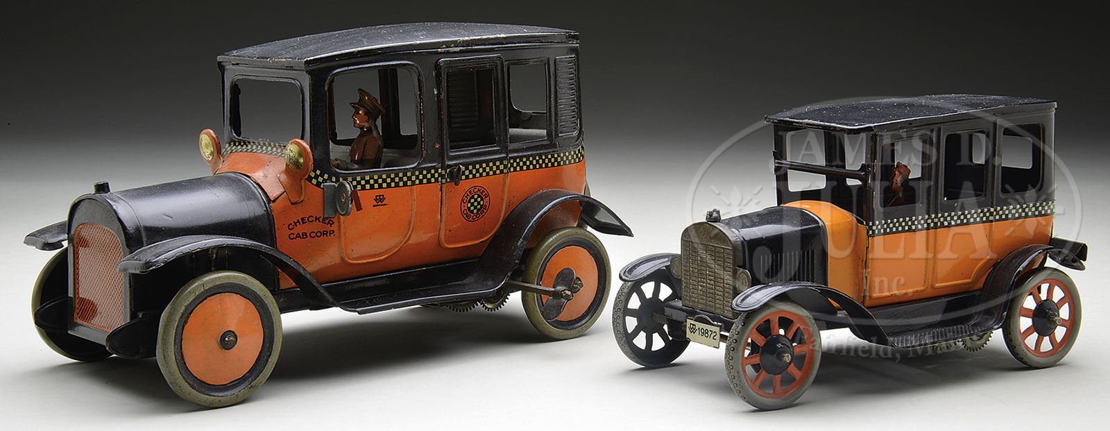 The larger of the two features simulated cowl lights with a red flagged taxi meter on the driver’s side. Checker highlighting surrounds the fuselage of the vehicle with the Checker Cab logo litho’d on passenger doors. A nice vehicle with opening rear passenger compartment doors and spare tire mounted to the rear of cab. The smaller vehicle is normally found in black only, but this particular version is painted orange and black with again the checker striping going around the vehicle’s body. Both toys overall are in very fine plus original condition and seldom found. These vehicles are rare and as a pair, they make a great and important statement. SIZE: 8-1/2″ and 6-1/4″ respectively. PROVENANCE: The Estate of Carol and Jerry Soling. CONDITION: As stated above. 1-14732 (1,000-1,500) – Lot 1064
