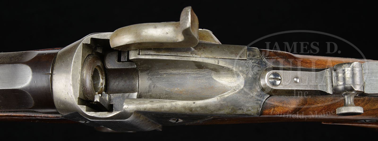RARE CONVERSION SHARPS MODEL 1874 HEAVY SPORTING BUFFALO RIFLE THAT BELONGED TO ELMER KEITH.SN C46090. Cal. .45 (45-120-550). Heavy buffalo rifle probably converted by Meecham, 15 lbs. 5.44 oz., with 30″ oct bbl, orig Sharps half nickel front sight and a Winchester 1876 marked ladder rear sight mated to the Sharps dovetail base. Tang sight appears to be a thick base Winchester Vernier sight with 4″ staff and top tang is drilled & topped for this sight. Top flat is marked with the “Old Reliable” cartouche & Bridgeport address. Chamber area of top flat is marked “.45 3 1/4”. The long trigger plate has double set triggers and lockplate & receiver usual Sharp markings. Left rear side of receiver has a plugged hole which is probably from having a sling bar removed. Mounted with very nicely figured, uncheckered American walnut with semi-schnable tipped forearm and straight stock with heavy crescent brass buttplate that is lead lined. When buttplate was removed, the hole under the buttplate has been enlarged and was filled with lead bullets & lead shot. The shot & bullets were removed. Front face of buttstock is numbered “52998” and toe of buttstock has an ebony inlay, probably an old repair from a broken toe. Bottom tang screw is replaced with a long wood screw which secures a homemade walnut grip. Close examination of the top tang disclosed that it has been rewelded through the front screw hole. And that screw is a replacement. The tang screw holes were added and the rear tang screw hole obliterated the last digit of the SN. Matching number is on bottom flat of bbl and inside the forearm. No other parts were observed to be numbered except stock, as noted. It is well-documented in several of Mr. Keith’s writings that he was a great promoter of single shot rifle hunting. Undoubtedly he would have used this rifle for hunting & long range shooting. PROVENANCE: The Elmer Keith Estate Collection. CONDITION: Very good to fine. Bbl retains about 60-70% blue turning plum with a mottled chemical spotted appearance. Receiver retains traces of orig case colors, being mostly a silver/grey patina. Lockplate, hammer & trigger plate retain traces of case colors, being mostly a silver/brown patina. Buttstock, with the aforementioned repaired toe, has three or four small hairlines around upper tang & retains most of an old refinish. Forearm has a repaired crack at the left tip, otherwise is sound & shows 25-30% orig finish with the balance a handworn patina. Mechanics are fine, bright shiny bore. 4-47967 JR265 (8,000-13,000) – Lot 1065 Click here to view provenance