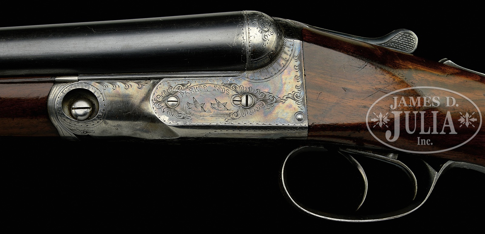 Please Note: Serial number is actually 234978, not 284978. *VERY PLEASING PARKER BROTHERS GHE GRADE 12 GAUGE SHOTGUN.SN 234978. Cal. 12ga. Chambers 2-3/4″, 30″ Parker Special Steel bbl, 1-1/2″ frame and concave matted rib with dbl bead. Chokes MOD/FULL. Splinter forend. GHE engraved ejector action with game bird vignettes engraved on each side as well as floorplate. Generous coverage on balance of receiver with scroll. Dbl triggers. Pistol grip with Parker Brothers grip cap. Black rubber recoil pad. 14-1/4″ LOP over pad. DAC 1-1/2″, DAH 2-1/2″. Automatic safety. CONDITION: Excellent. Bbls retain 90%+ orig blue. Bbls ring true. Bores are bright, shiny and unpitted. No dents or dings. Minor handling marks. Sharp GHE markings. Receiver retains an ample amount of orig color, strongest in protected areas with fading and wear to carry points. Trigger bow is silvered from use with pleasing blue/brown patina. Screws are excellent. Nice fit and finish to stock and forend. Finish has been added and checkering is clean. Unengraved initial shield on toe line. Top lever right of center. Gun opens and closes with authority, strong ejectors. A very impressive GHE Grade steel bbld Parker. 50403-2 TJW (3,000-5,000) C&R – Lot 1065